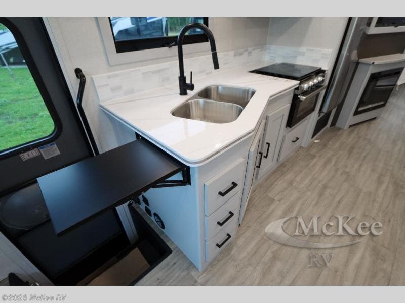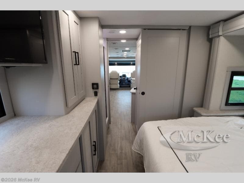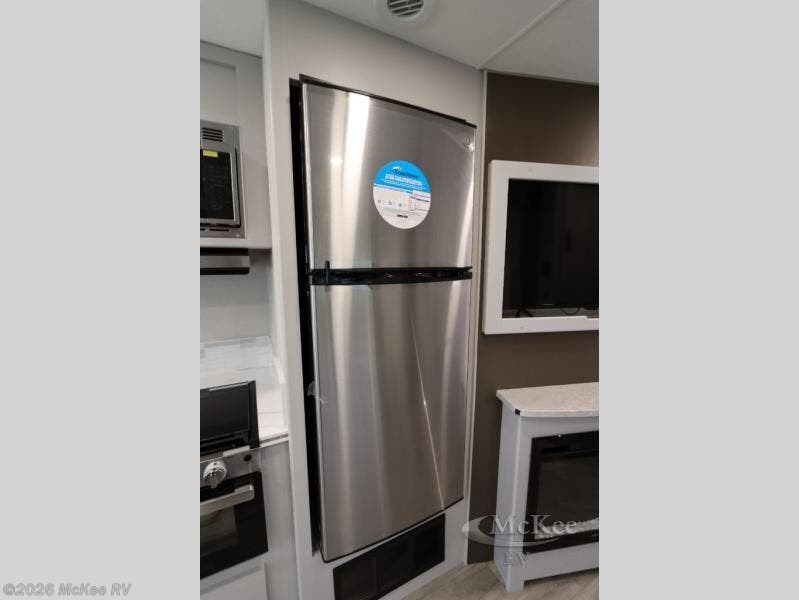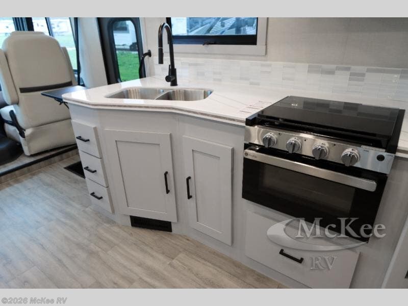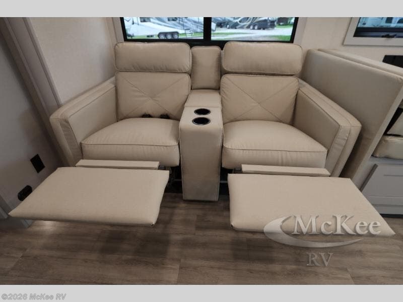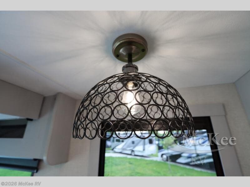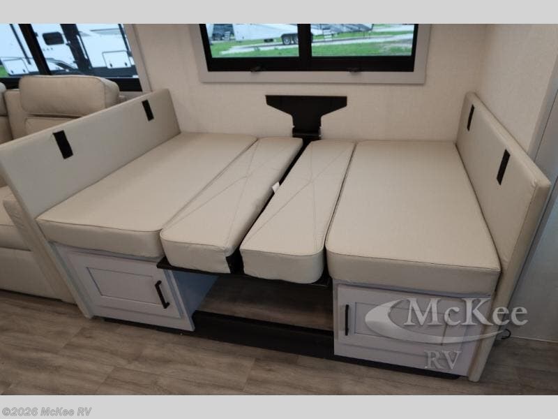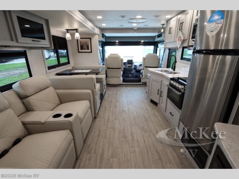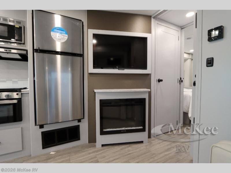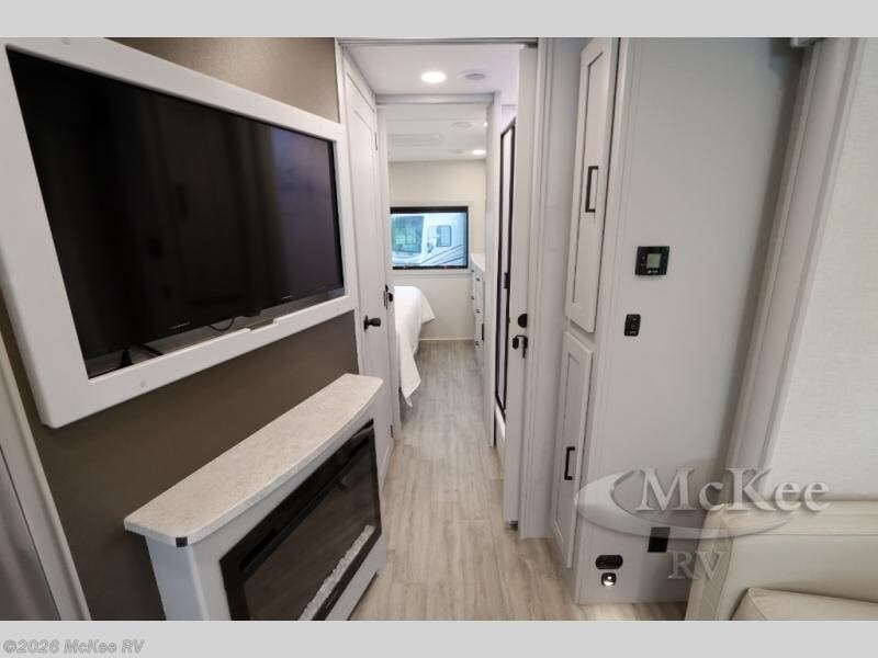 Enjoy a home away from home with this motorhome! The drop-down bunk over cab provides an extra sleeping space but can be stored away when not needed. Prepare your best home cooked meals while on the road with the stainless steel three burner cooktop and 12V stainless steel double door 10 cu. ft. refrigerator then enjoy them at the 42" x 72" booth dinette. Relax in true comfort on the 68" theater sofa across from the Smart TV and fireplace. After a long day of traveling, you can freshen up in the 26" x 38" shower while another uses the private toilet and sink. The rear private bedroom has a 72" x 76" king bed slide with a CPAP station above it and across from it there is a wardrobe, an LED TV, storage space, and washer and dryer prep!