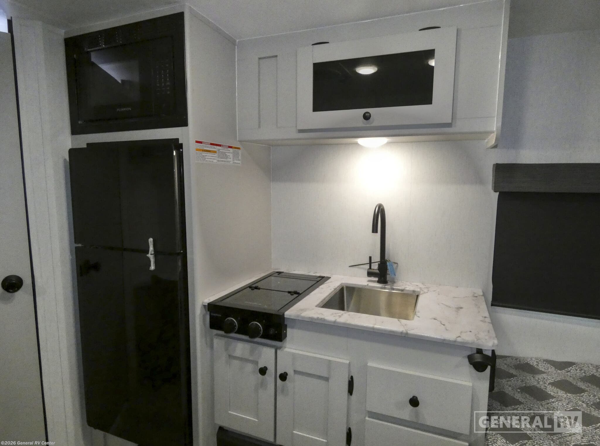 Coachmen Remote travel trailer 12R highlights: Overhead Cabinets Rear Corner Bath Pass-Through Storage 9' 6" Awning This is the kind of small travel trailer that makes camping feel simple instead of cramped. The 54" x 74" bed gives you a real place to stretch out at night, not just a makeshift bunk, and the rear corner bath means you still get your own private space to clean up without hiking to the campground facilities. Outside, the griddle lets you cook breakfast or quick dinners in the fresh air, and the pass-through storage is perfect for stashing chairs, totes, and all the little extras that normally end up in the way. It’s a compact floorplan that still covers the basics really well, so you can just hook up and go. Any Remote travel trailer by Coachmen RV was designed with getting you out to explore in mind. These cute but mighty campers will easily allow you to enjoy some downtime from every day life. With the Aluma-cage construction including a vacuum-bonded laminated roof, and dual Azdel/fiberglass walls, your Remote trailer is not only sturdy but will be easy to maintain. Four stabilizer jacks will have you feeling secure at your campsite, and the power awning with LED light will allow you to create an inviting outdoor space with protection from the elements to use both day and night. There is ample storage throughout the interior, plus plenty of exterior storage as well. You’ll also appreciate the magnetic baggage door catches to keep your gear secure.