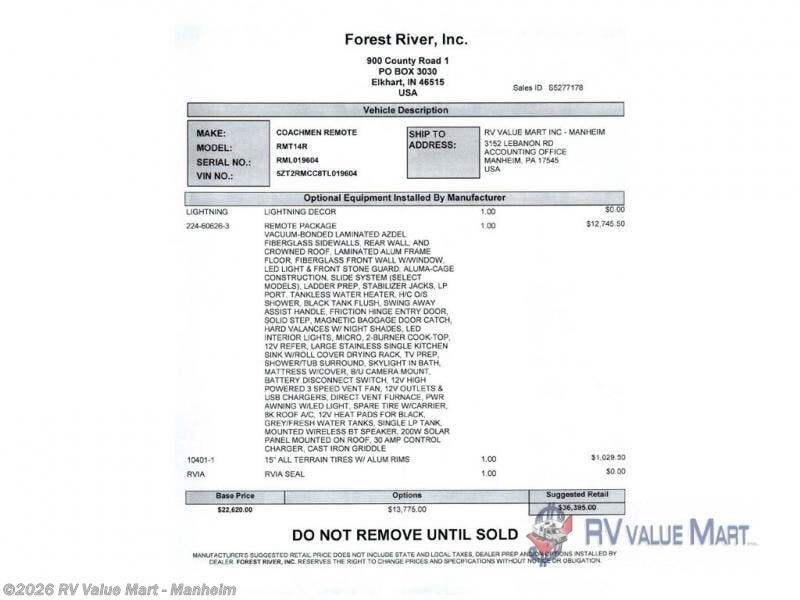 Request More Info on this 2026 Coachmen Remote 14R Offered for sale by RV Value Mart - Manheim