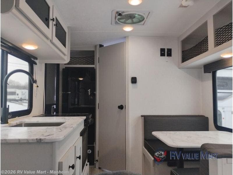 The Remote 14R packs a lot of comfort into a small footprint, starting with the 54" x 80" front bed that gives you true residential-style sleeping space. With storage outside for all your gear, it is an easy trailer for a couple or solo traveler to leave packed and ready for a quick getaway. Mid-coach, the booth dinette gives you a real sit-down spot for meals, card games, or laptop time, and can be used for extra sleeping when you have a guest. An efficient galley keeps everything within reach, and the rear corner bath means you still get your own shower and toilet instead of relying on campground facilities. All together, it feels simple, open, and practical for anyone who wants a lightweight that still feels like a “real” camper inside.
