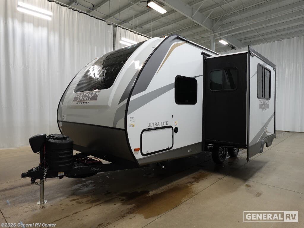 Coachmen Northern Spirit Ultra Lite travel trailer 1943RB highlights: Rear Corner Bathroom Two Bar Stools Entertainment Center MAX Bed Storage Dog Leash Clip & Wash Sleep like royalty at any campsite when you have this trailer setup. You will find the interior is spacious with a slide out sofa including end tables for your drinks and cellphones, and the rear corner bathroom is convenient with a radius shower and linen storage. Your dog can stay clean as well with the exterior dog wash and the dog leash clip will keep them safely at the campsite. While outside you might decide to relax under the 15' awning, and store a few items in the pass-through compartment up front including fishing poles. And the cook will love the L-shaped counter, appliances, the hutch and the bar stools when wanting to take a break or visit with friends. With any Northern Spirit Ultra Lite travel trailer by Coachmen, the "Twice Cool" dual ducted air conditioning system, motion activated floor lights, and the motion activated pass-through storage light plus fishing pole storage, will make your camping experience simplified. The heated and enclosed underbelly provides protection on the road, the 200W solar panel with 30 amp controller provides off-grid camping, and the power tongue jack makes setup easier. Each is built with a front cap with LED strip lights, a laminated, aluminum framed floor, rear wall, and sidewalls, plus a fully walkable roof with seamless Tufflex PVC covering. Make your decision today, and camp with everything in its place!