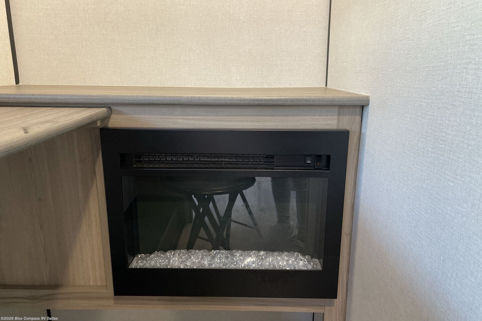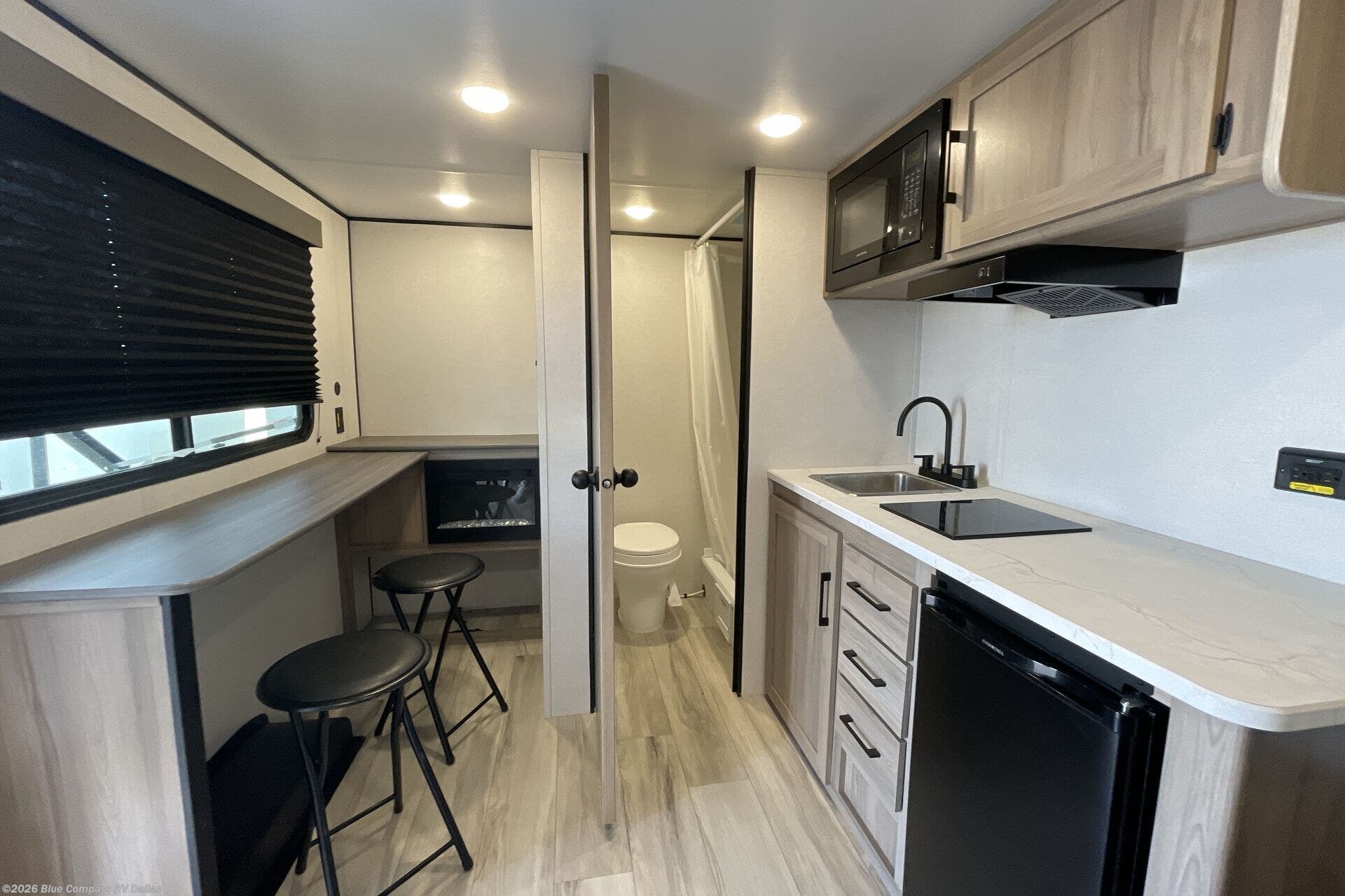 This travel trailer is perfect for a couple. The beautifully appointed bathroom is fully equipped for your needs, providing a serene space to unwind. The cozy fireplace creates a warm and welcoming atmosphere, perfect for relaxing with loved ones. The stylish bar with stools is great for socializing and enjoying meals. In the kitchen, the convenient microwave enables quick and easy meal preparation, while the spacious refrigerator keeps your food and drinks fresh. The ample overhead cabinets provide plenty of storage space, and the single burner cooktop gives you the freedom to cook your favorite homemade dishes. The plush queen bed is the perfect spot to rest and recharge, and the practical shelf provides additional storage for your favorite books, decorations, or personal items. The practical exterior features include a durable exterior awning that provides shade and protection from the elements, while the spacious exterior storage offers ample space for your outdoor gear and equipment.