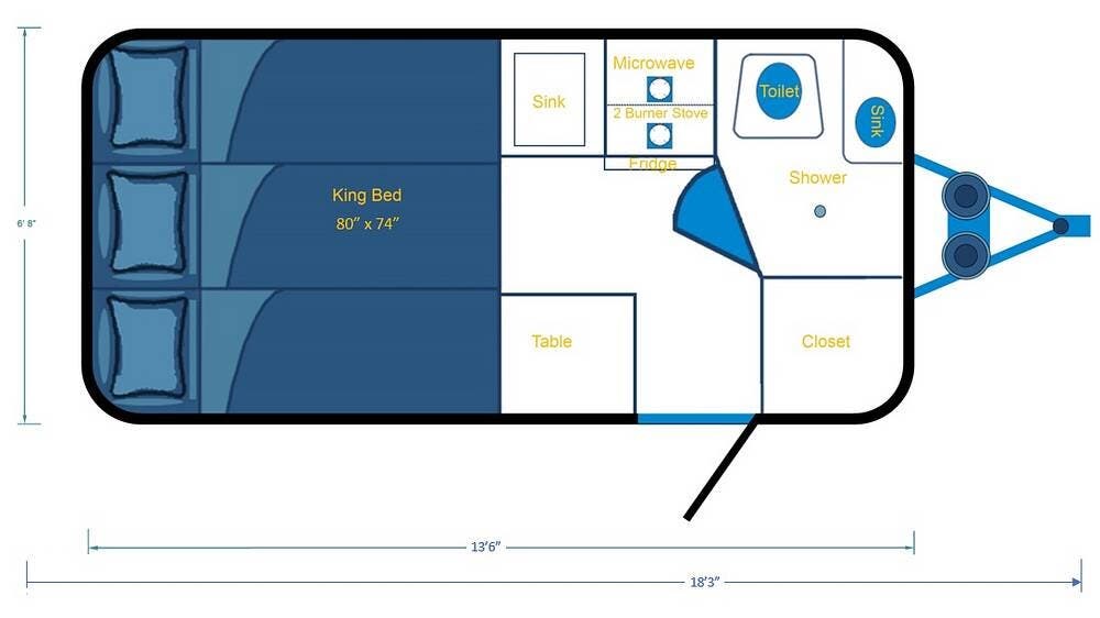 Inside, the Foxy 1 BB offers a thoughtfully planned layout, including a convertible King-size bed that can sleep 2-3 people (BB stands for "Big Bed". During the daytime, the bed converts into a dual opposing couch setup with a table between them. The flooring throughout is just like a boat, completely washable. Cover the floor with your choice of rugs or mats, knowing you can easily remove and clean the floor.