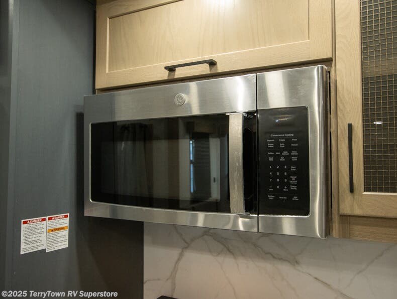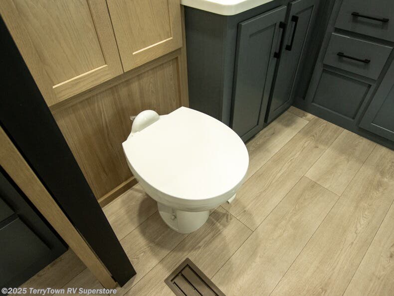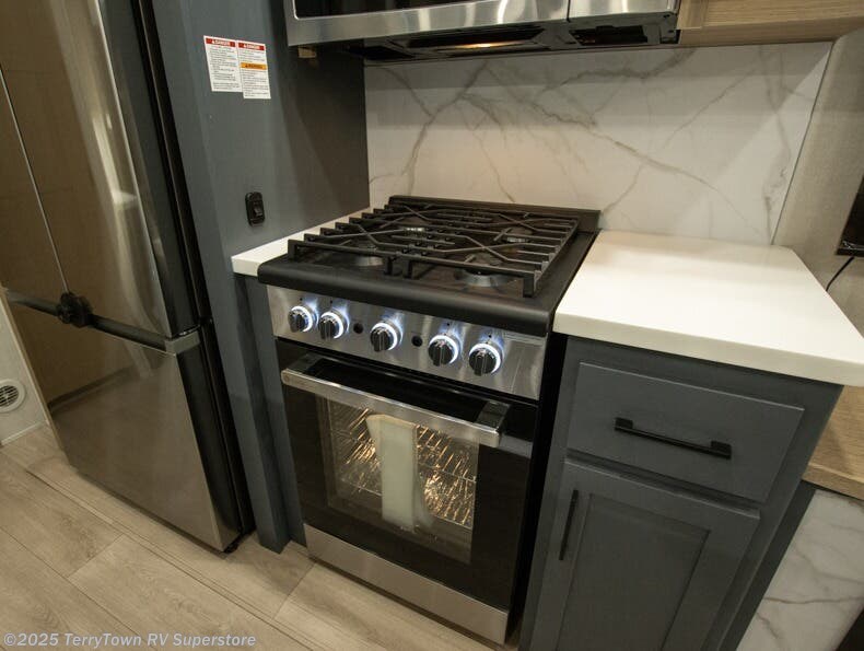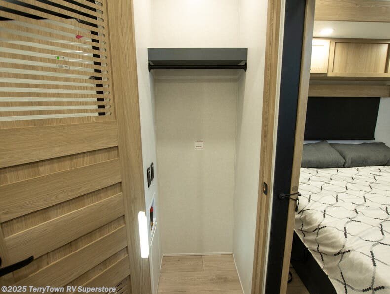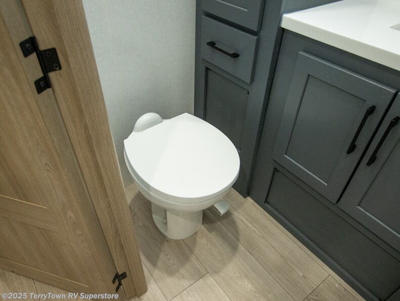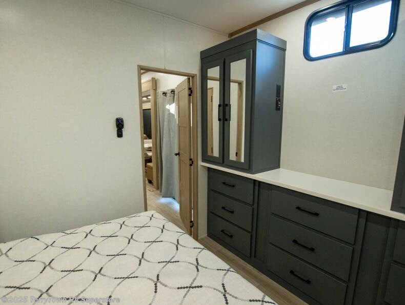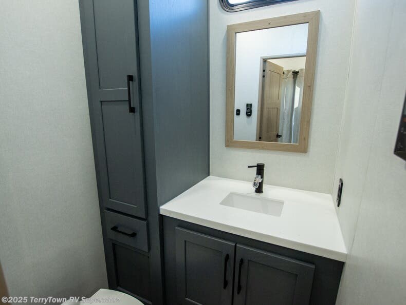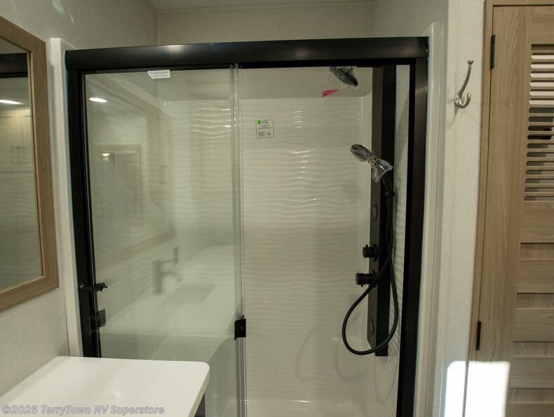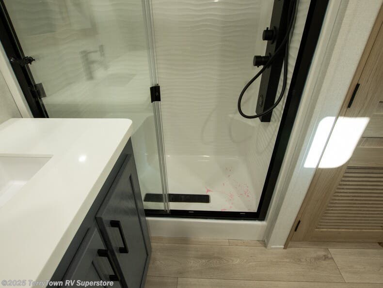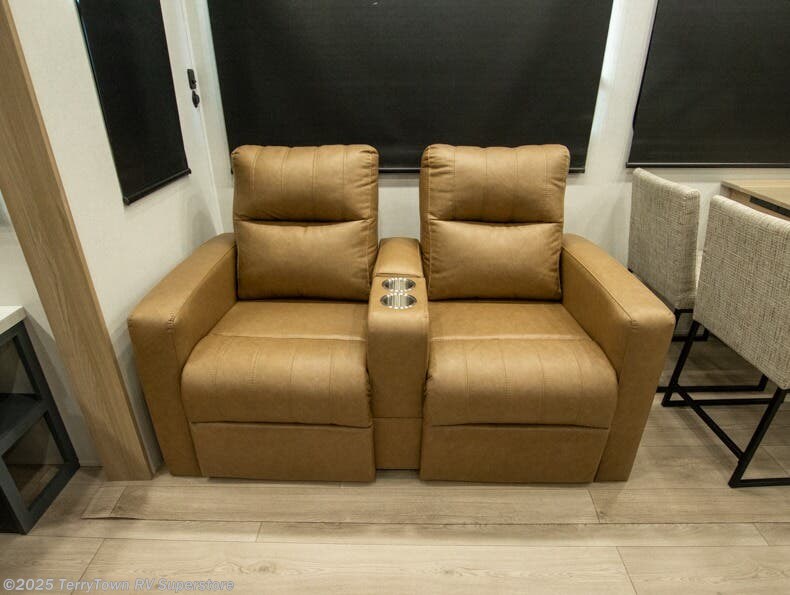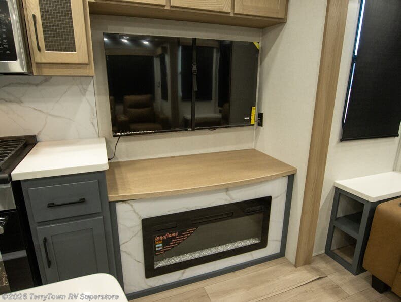 Get away to your own master suite at your favorite destination today! You can sleep on the king bed slide out with plenty of storage for your clothes on the opposite side and get cleaned up in the full bathroom in the 48" shower. There are even dual bath sinks so you both can brush your teeth at the same time. There is also a space that has been prepped for an optional washer/dryer if you like. An added convenience is the centrally located half bath across from the patio doors for easy entry and exit. The front living area provides a sofa that can double as sleeping space for your kids or overnight guests, and the theater seats allow you to clearly see the 50" lift TV with fireplace below. The cook will love the kitchen island, hutch, and pantry with a shelf, as well as the appliances. Dining or even doing a little work will be comfortable while seated at the free standing table with chairs and bench seating.