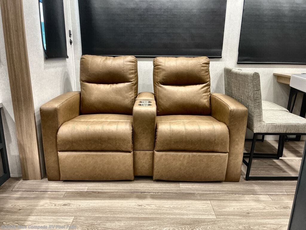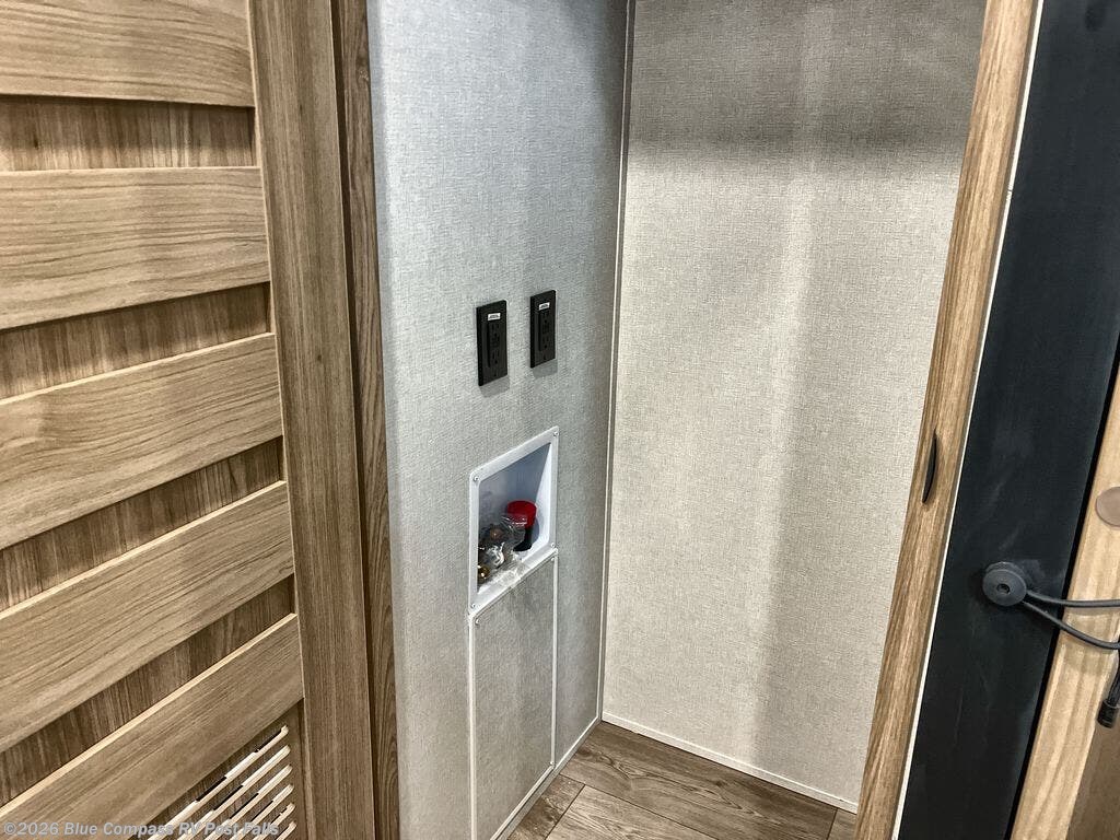Get away to your own master suite at your favorite destination today! You can sleep on the king bed slide out with plenty of storage for your clothes on the opposite side and get cleaned up in the full bathroom in the 48" shower. There are even dual bath sinks so you both can brush your teeth at the same time. There is also a space that has been prepped for an optional washer/dryer if you like. An added convenience is the centrally located half bath across from the patio doors for easy entry and exit. The front living area provides a sofa that can double as sleeping space for your kids or overnight guests, and the theater seats allow you to clearly see the 50" lift TV with fireplace below. The cook will love the kitchen island, hutch, and pantry with a shelf, as well as the appliances. Dining or even doing a little work will be comfortable while seated at the free standing table with chairs and bench seating.