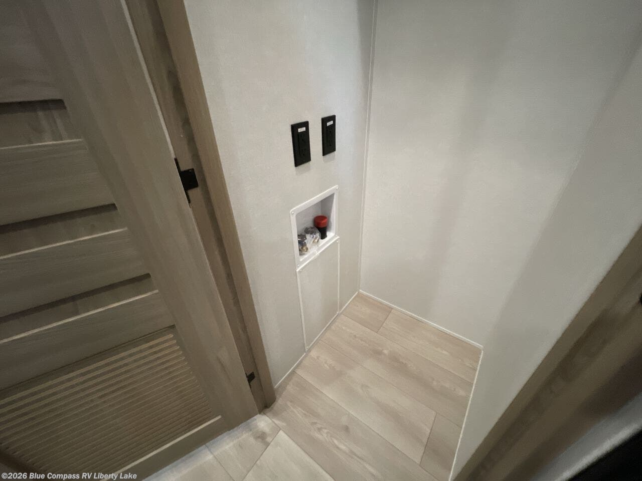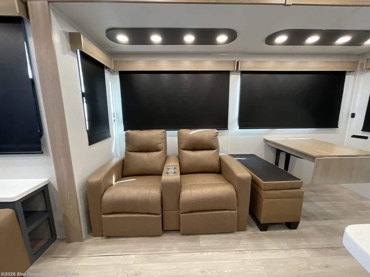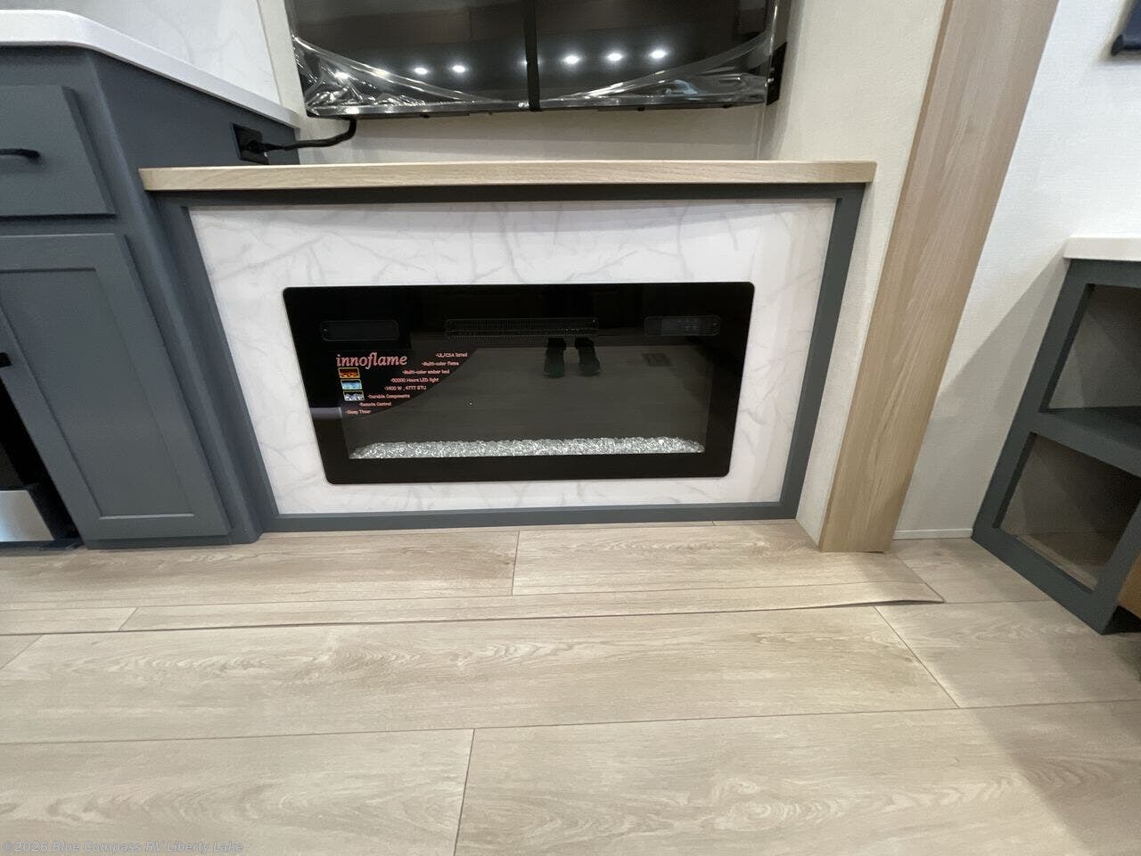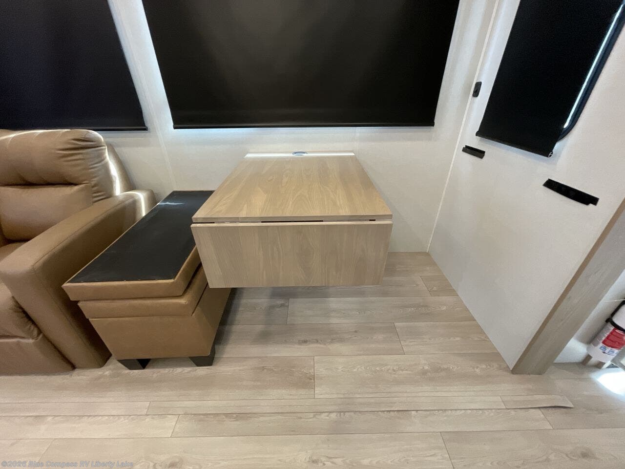 Get away to your own master suite at your favorite destination today! You can sleep on the king bed slide out with plenty of storage for your clothes on the opposite side and get cleaned up in the full bathroom in the 48" shower. There are even dual bath sinks so you both can brush your teeth at the same time. There is also a space that has been prepped for an optional washer/dryer if you like. An added convenience is the centrally located half bath across from the patio doors for easy entry and exit. The front living area provides a sofa that can double as sleeping space for your kids or overnight guests, and the theater seats allow you to clearly see the 50" lift TV with fireplace below. The cook will love the kitchen island, hutch, and pantry with a shelf, as well as the appliances. Dining or even doing a little work will be comfortable while seated at the free standing table with chairs and bench seating.