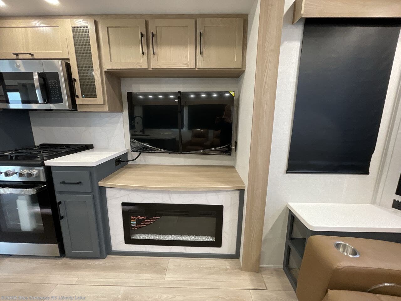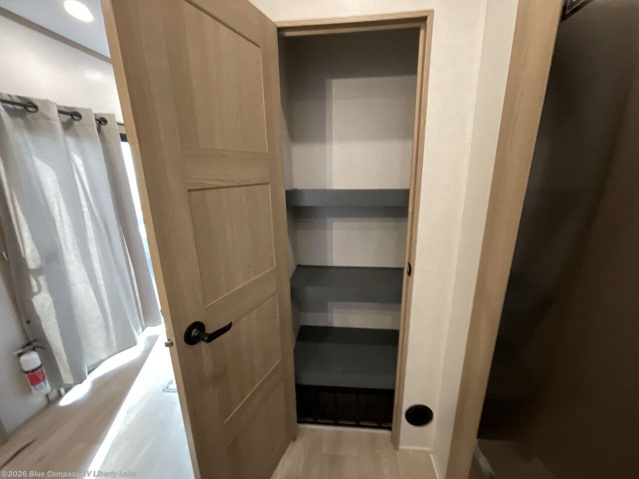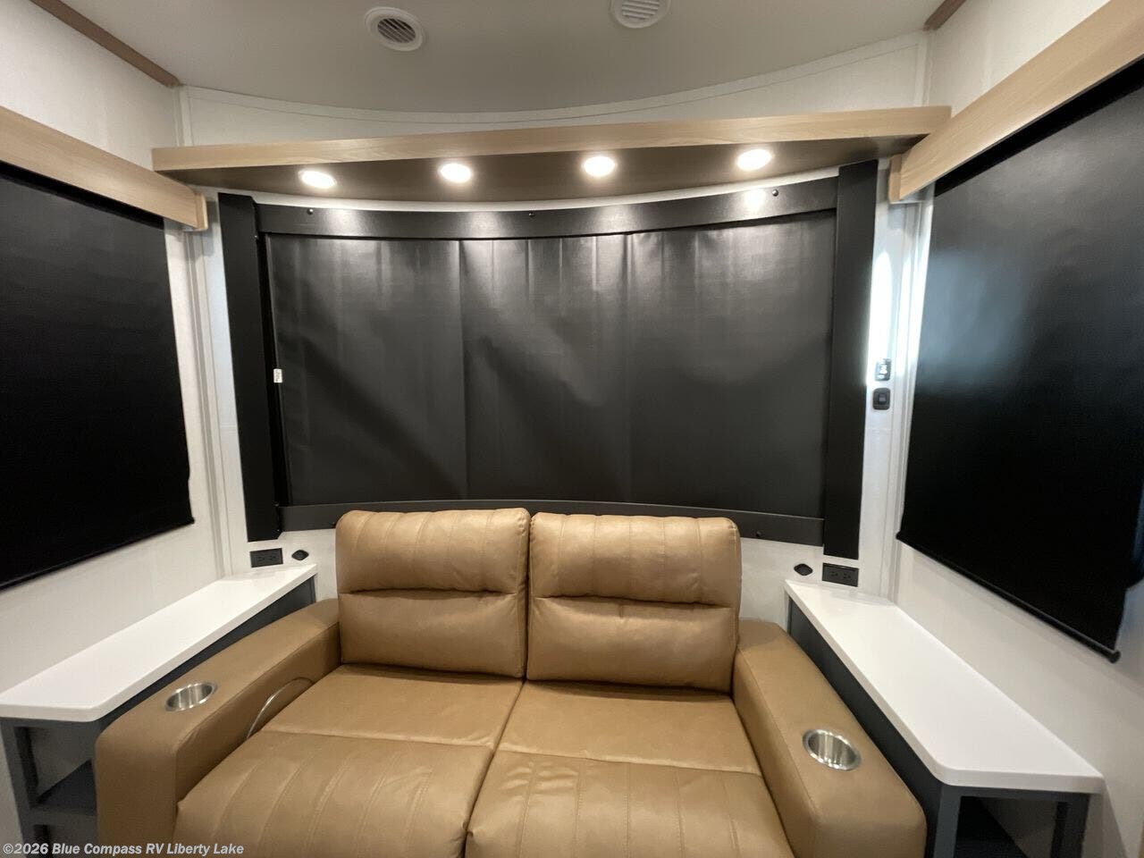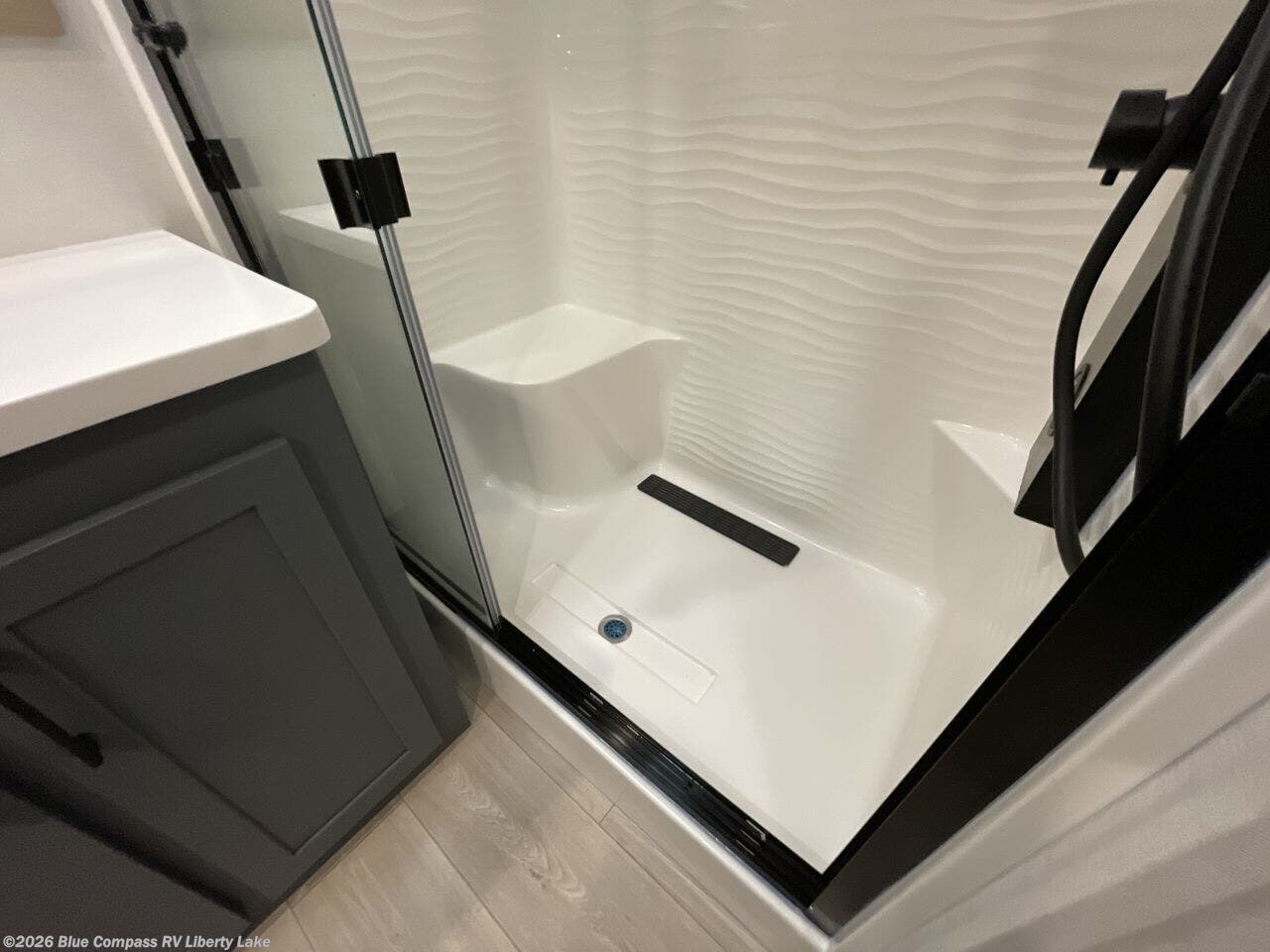 Get away to your own master suite at your favorite destination today! You can sleep on the king bed slide out with plenty of storage for your clothes on the opposite side and get cleaned up in the full bathroom in the 48" shower. There are even dual bath sinks so you both can brush your teeth at the same time. There is also a space that has been prepped for an optional washer/dryer if you like. An added convenience is the centrally located half bath across from the patio doors for easy entry and exit. The front living area provides a sofa that can double as sleeping space for your kids or overnight guests, and the theater seats allow you to clearly see the 50" lift TV with fireplace below. The cook will love the kitchen island, hutch, and pantry with a shelf, as well as the appliances. Dining or even doing a little work will be comfortable while seated at the free standing table with chairs and bench seating.