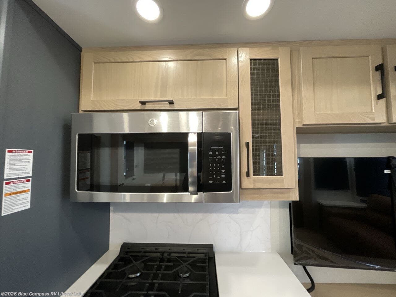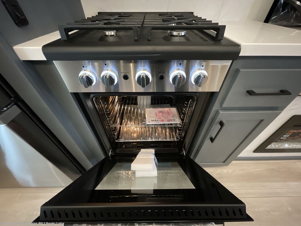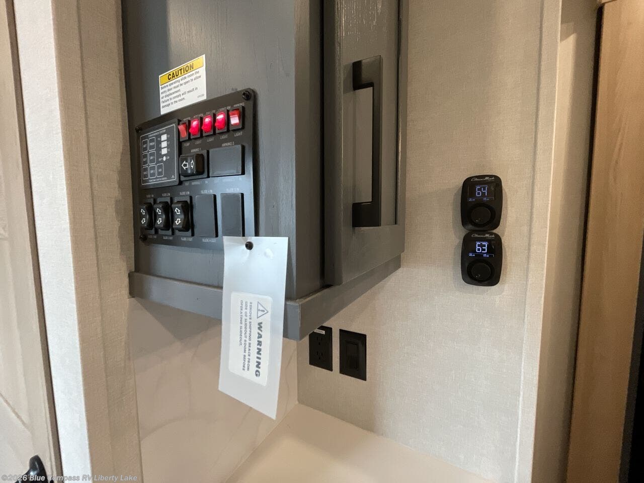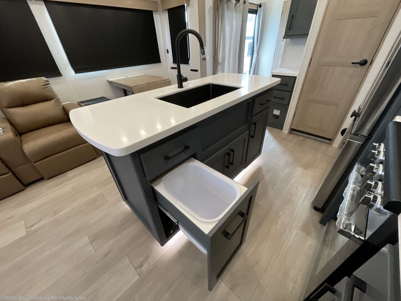 Get away to your own master suite at your favorite destination today! You can sleep on the king bed slide out with plenty of storage for your clothes on the opposite side and get cleaned up in the full bathroom in the 48" shower. There are even dual bath sinks so you both can brush your teeth at the same time. There is also a space that has been prepped for an optional washer/dryer if you like. An added convenience is the centrally located half bath across from the patio doors for easy entry and exit. The front living area provides a sofa that can double as sleeping space for your kids or overnight guests, and the theater seats allow you to clearly see the 50" lift TV with fireplace below. The cook will love the kitchen island, hutch, and pantry with a shelf, as well as the appliances. Dining or even doing a little work will be comfortable while seated at the free standing table with chairs and bench seating.