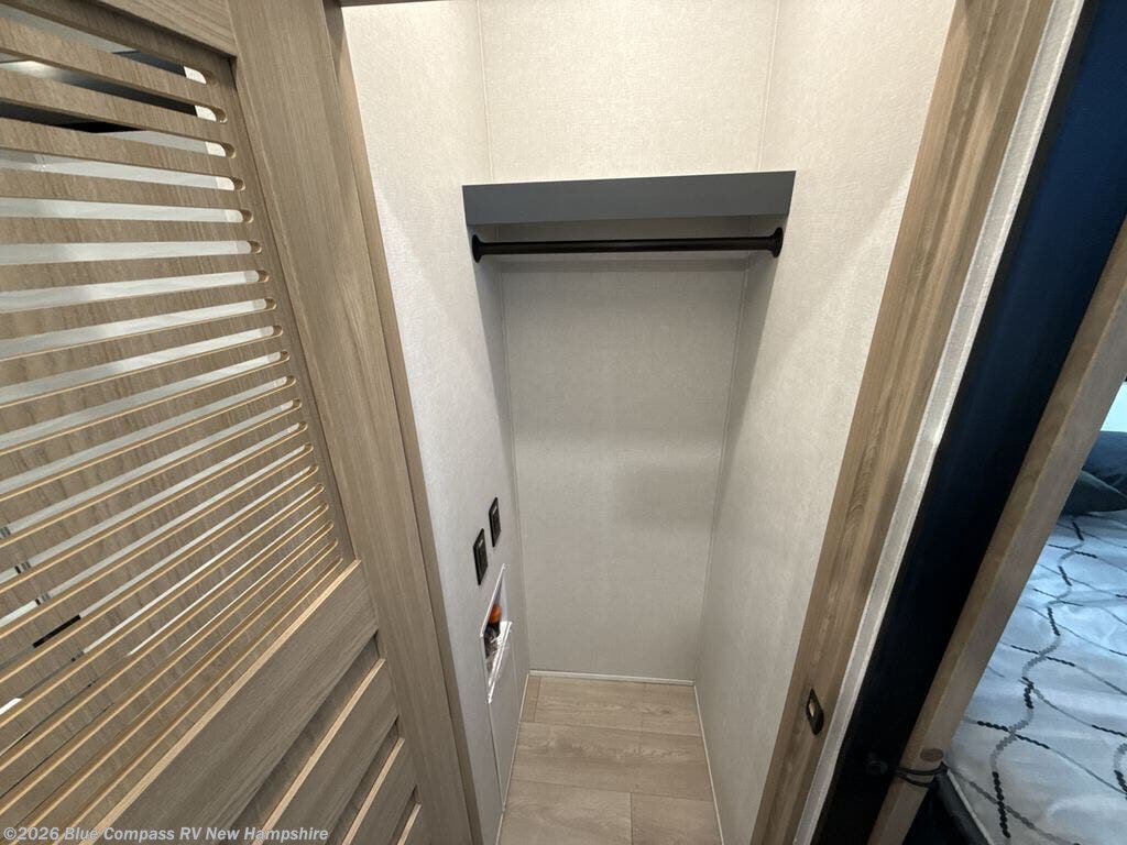 Get away to your own master suite at your favorite destination today! You can sleep on the king bed slide out with plenty of storage for your clothes on the opposite side and get cleaned up in the full bathroom in the 48" shower. There are even dual bath sinks so you both can brush your teeth at the same time. There is also a space that has been prepped for an optional washer/dryer if you like. An added convenience is the centrally located half bath across from the patio doors for easy entry and exit. The front living area provides a sofa that can double as sleeping space for your kids or overnight guests, and the theater seats allow you to clearly see the 50" lift TV with fireplace below. The cook will love the kitchen island, hutch, and pantry with a shelf, as well as the appliances. Dining or even doing a little work will be comfortable while seated at the free standing table with chairs and bench seating.