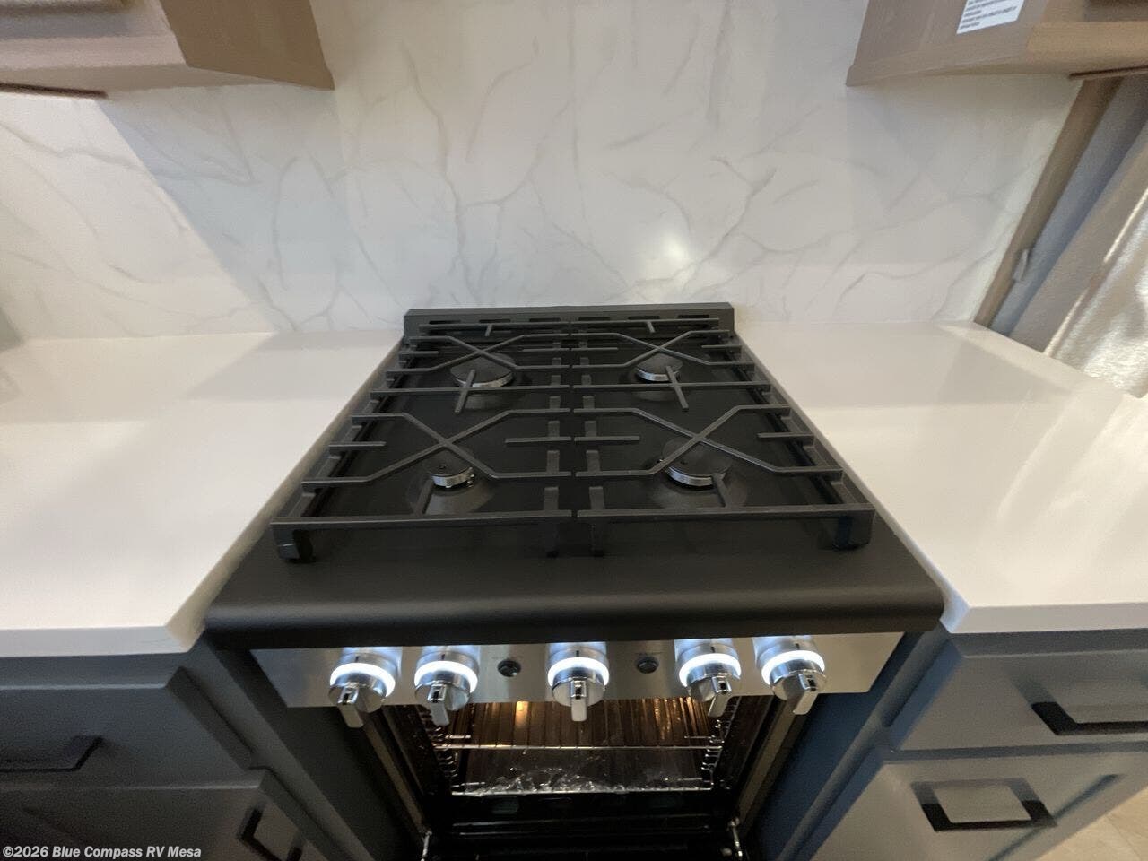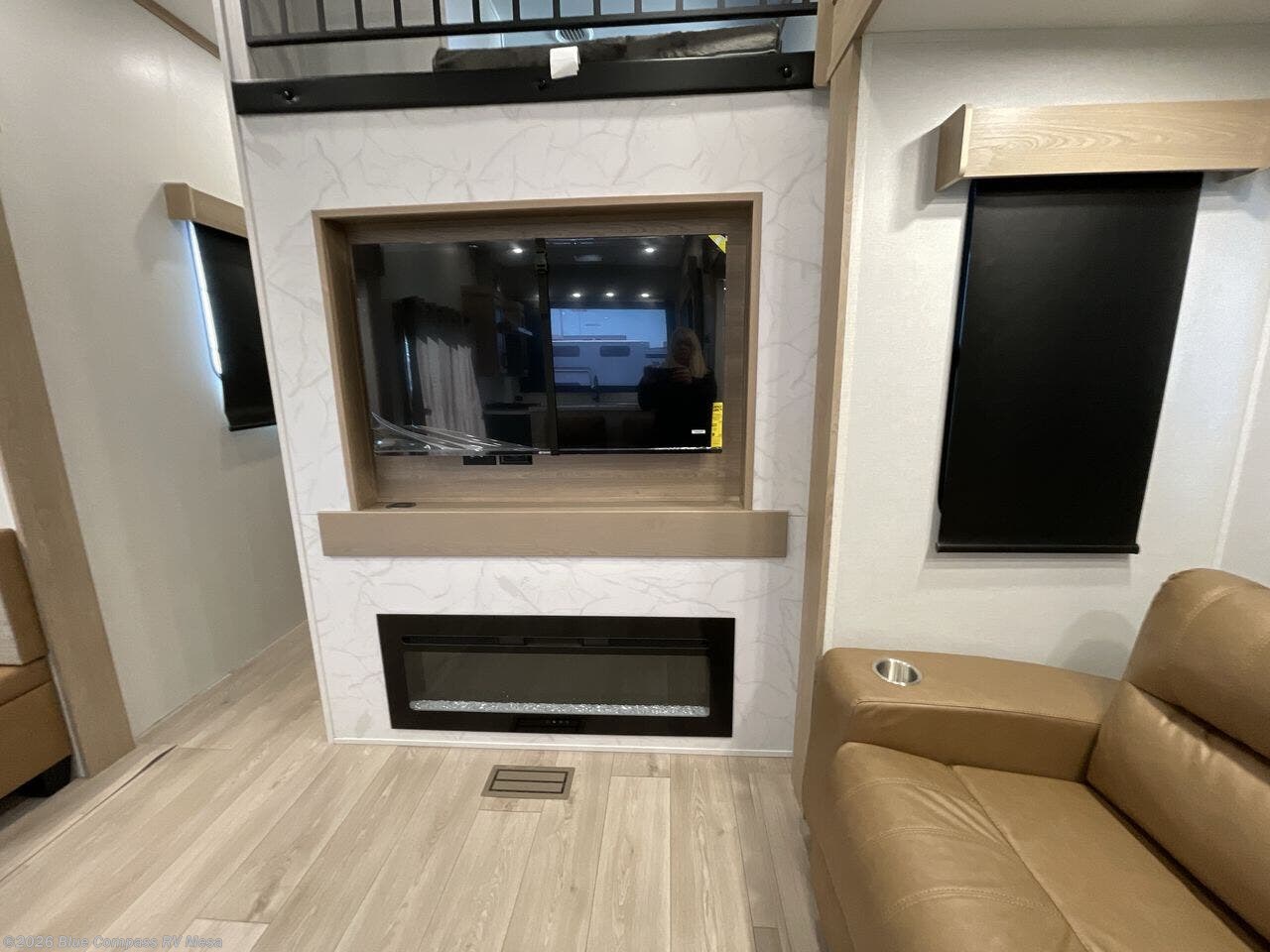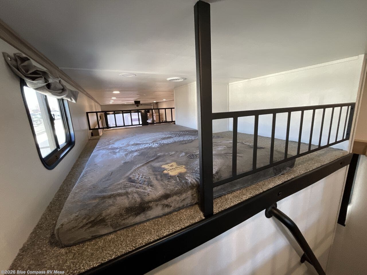 Are you looking for a destination trailer that can fit your whole crew? Look no further than this unit with four slides, three bunk mats in the loft areas, plus a spacious full bath that will allow everyone to stay clean each day. The front kitchen is any chef's dream with its ample counter space, pantry/cabinet, residential four burner range, and residential refrigerator. After dinner is cleaned up, everyone can meet in the middle living area to watch a movie on the 50" TV, and the fireplace here will make it feel more like home.