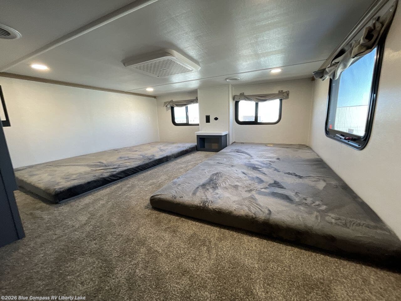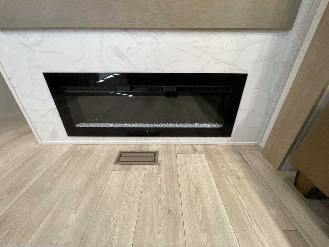 Are you looking for a destination trailer that can fit your whole crew? Look no further than this unit with four slides, three bunk mats in the loft areas, plus a spacious full bath that will allow everyone to stay clean each day. The front kitchen is any chef's dream with its ample counter space, pantry/cabinet, residential four burner range, and residential refrigerator. After dinner is cleaned up, everyone can meet in the middle living area to watch a movie on the 50" TV, and the fireplace here will make it feel more like home.