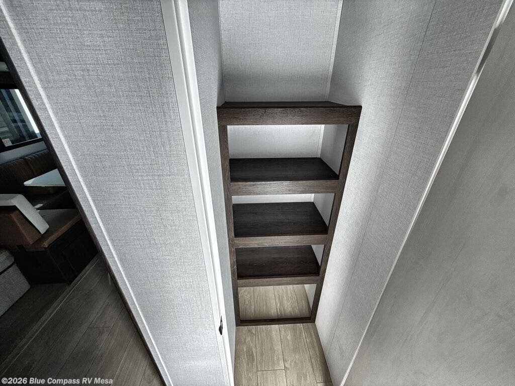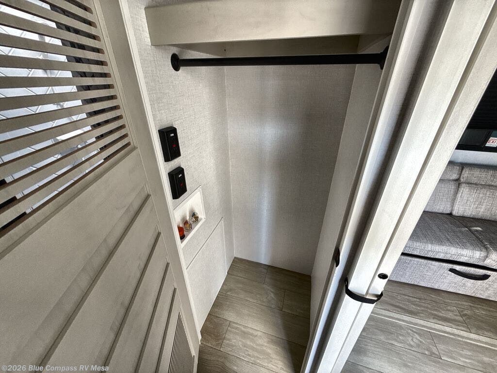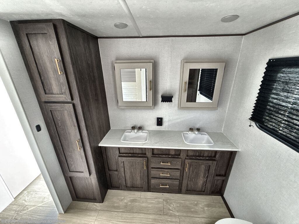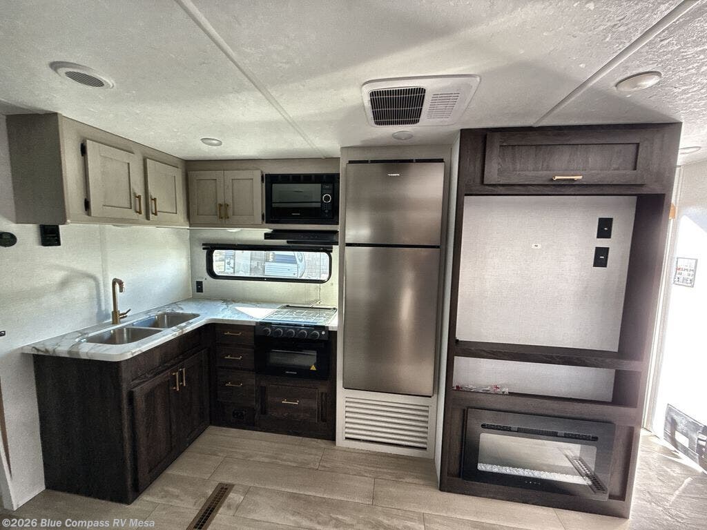 You need this award-winning travel trailer for your next weekend getaway! The full rear bathroom is decked out in features you're going to love like the dual-sink vanity for two to get ready at once, the linen closet next to the 30" x 36" shower and the second linen closet across from the closet with washer and dryer prep. After a fun-filled day outdoors, you can head inside and relax on either the 60" jackknife sofa and enjoy the entertainment center with a fireplace or grab a snack from the 10-cu. ft. refrigerator and play a few card games at the U-shaped dinette. The front private bedroom features a 60" x 74" RV queen bed with shirt closets on either side of it to keep your clothes looking nice!