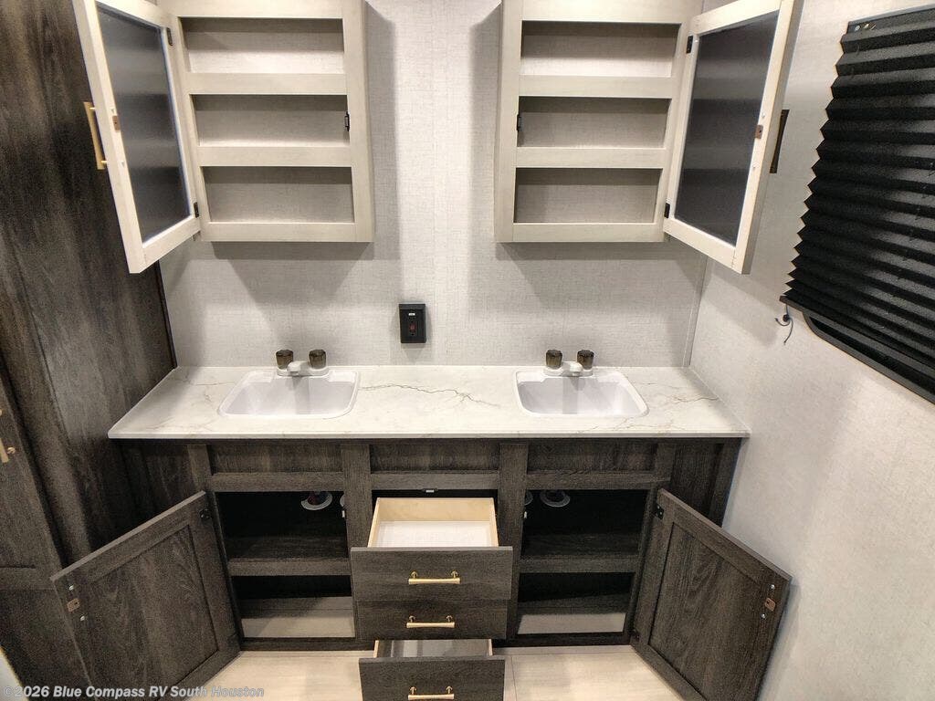 You need this award-winning travel trailer for your next weekend getaway! The full rear bathroom is decked out in features you're going to love like the dual-sink vanity for two to get ready at once, the linen closet next to the 30" x 36" shower and the second linen closet across from the closet with washer and dryer prep. After a fun-filled day outdoors, you can head inside and relax on either the 60" jackknife sofa and enjoy the entertainment center with a fireplace or grab a snack from the 10-cu. ft. refrigerator and play a few card games at the U-shaped dinette. The front private bedroom features a 60" x 74" RV queen bed with shirt closets on either side of it to keep your clothes looking nice!