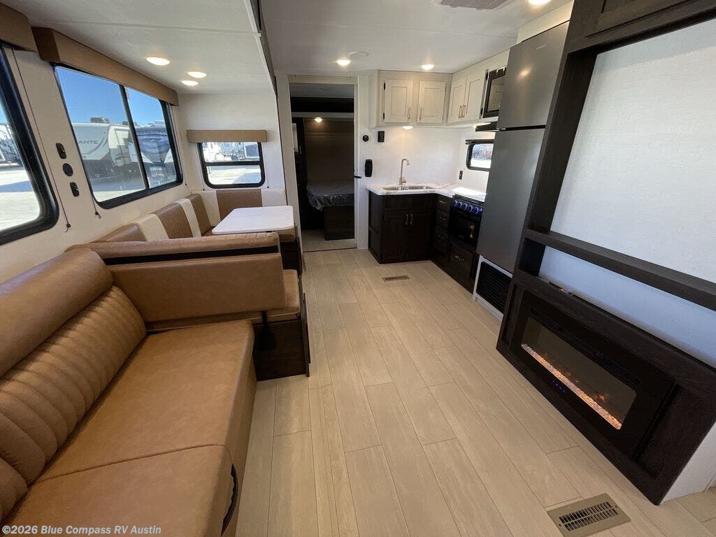 You need this award-winning travel trailer for your next weekend getaway! The full rear bathroom is decked out in features you're going to love like the dual-sink vanity for two to get ready at once, the linen closet next to the 30" x 36" shower and the second linen closet across from the closet with washer and dryer prep. After a fun-filled day outdoors, you can head inside and relax on either the 60" jackknife sofa and enjoy the entertainment center with a fireplace or grab a snack from the 10-cu. ft. refrigerator and play a few card games at the U-shaped dinette. The front private bedroom features a 60" x 74" RV queen bed with shirt closets on either side of it to keep your clothes looking nice!