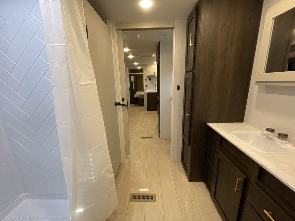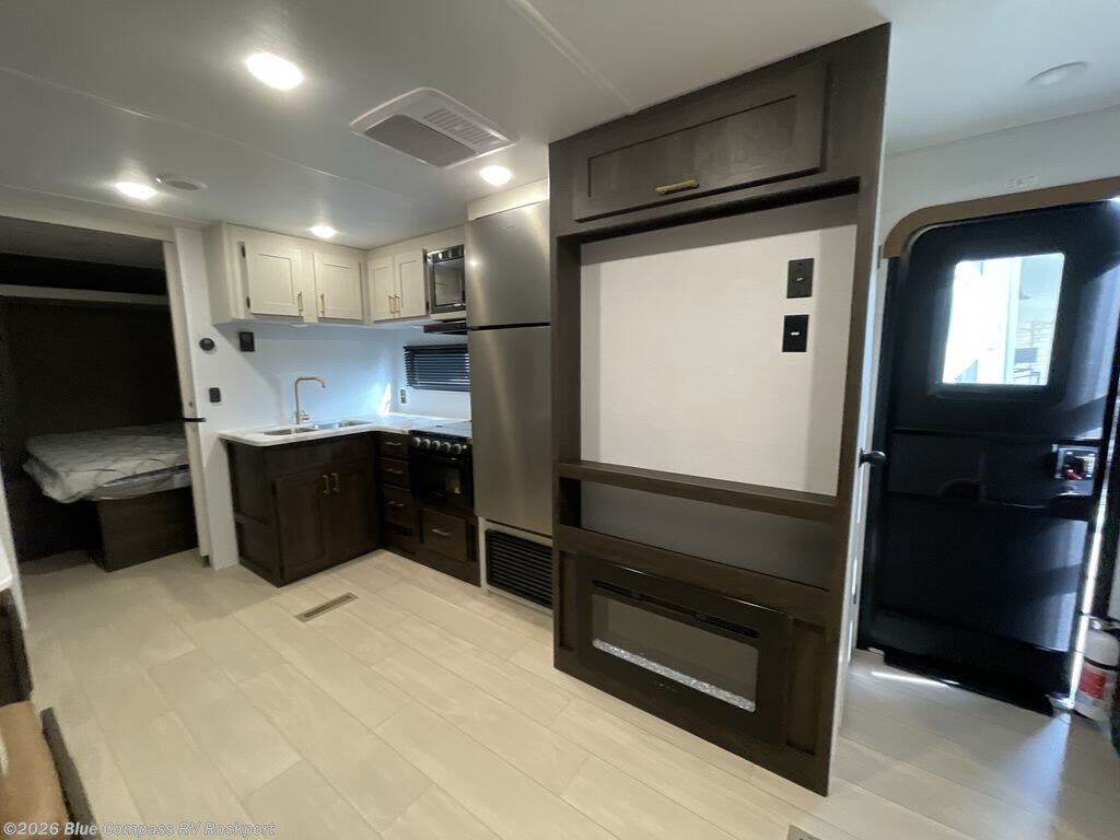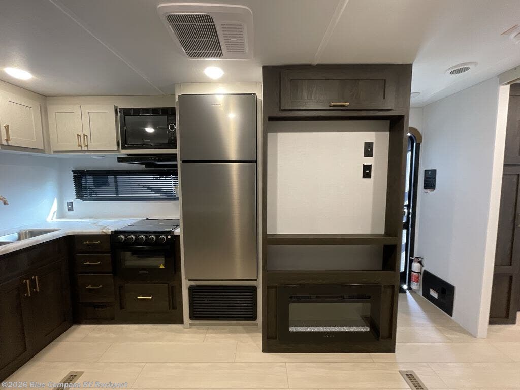 You need this award-winning travel trailer for your next weekend getaway! The full rear bathroom is decked out in features you're going to love like the dual-sink vanity for two to get ready at once, the linen closet next to the 30" x 36" shower and the second linen closet across from the closet with washer and dryer prep. After a fun-filled day outdoors, you can head inside and relax on either the 60" jackknife sofa and enjoy the entertainment center with a fireplace or grab a snack from the 10-cu. ft. refrigerator and play a few card games at the U-shaped dinette. The front private bedroom features a 60" x 74" RV queen bed with shirt closets on either side of it to keep your clothes looking nice!