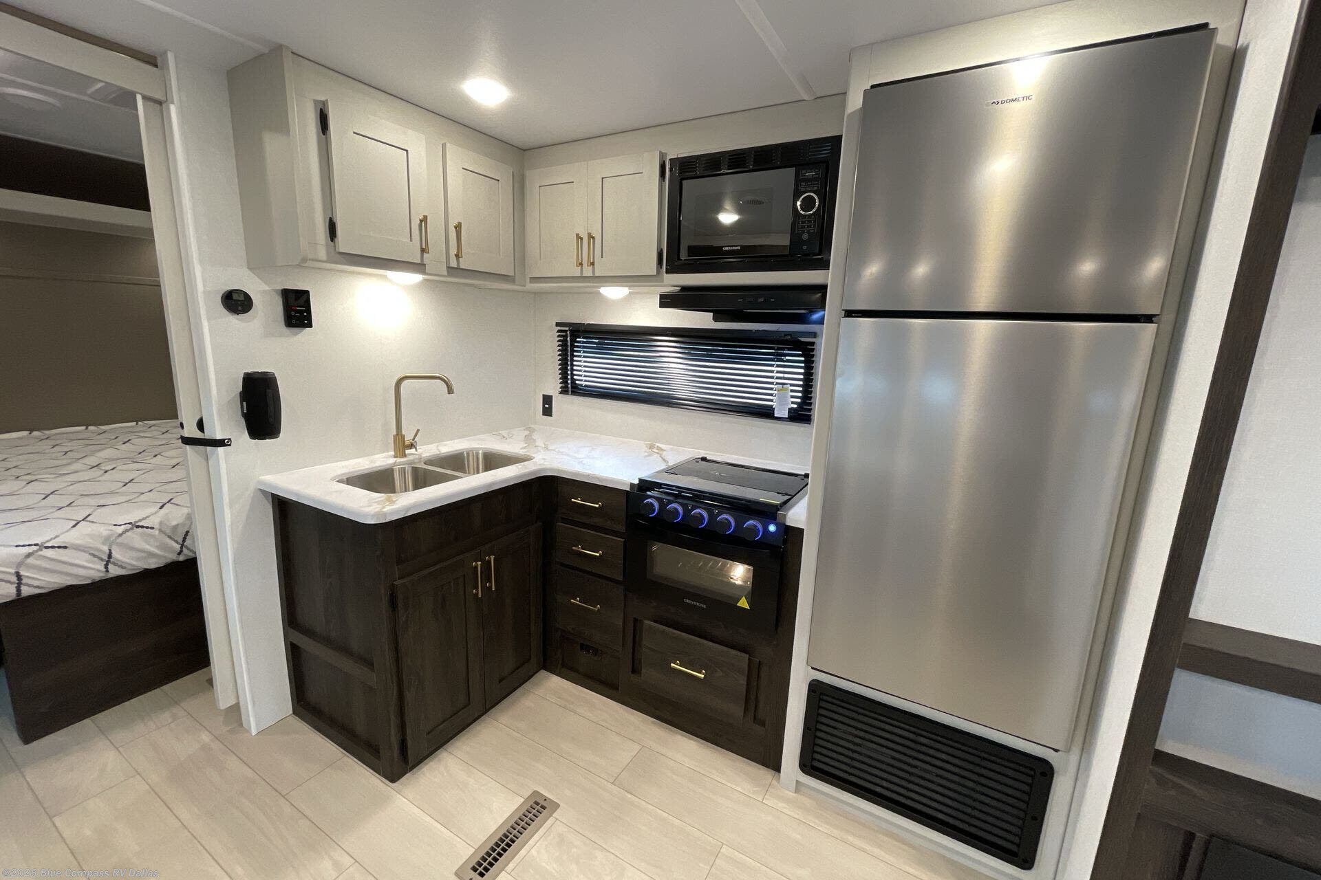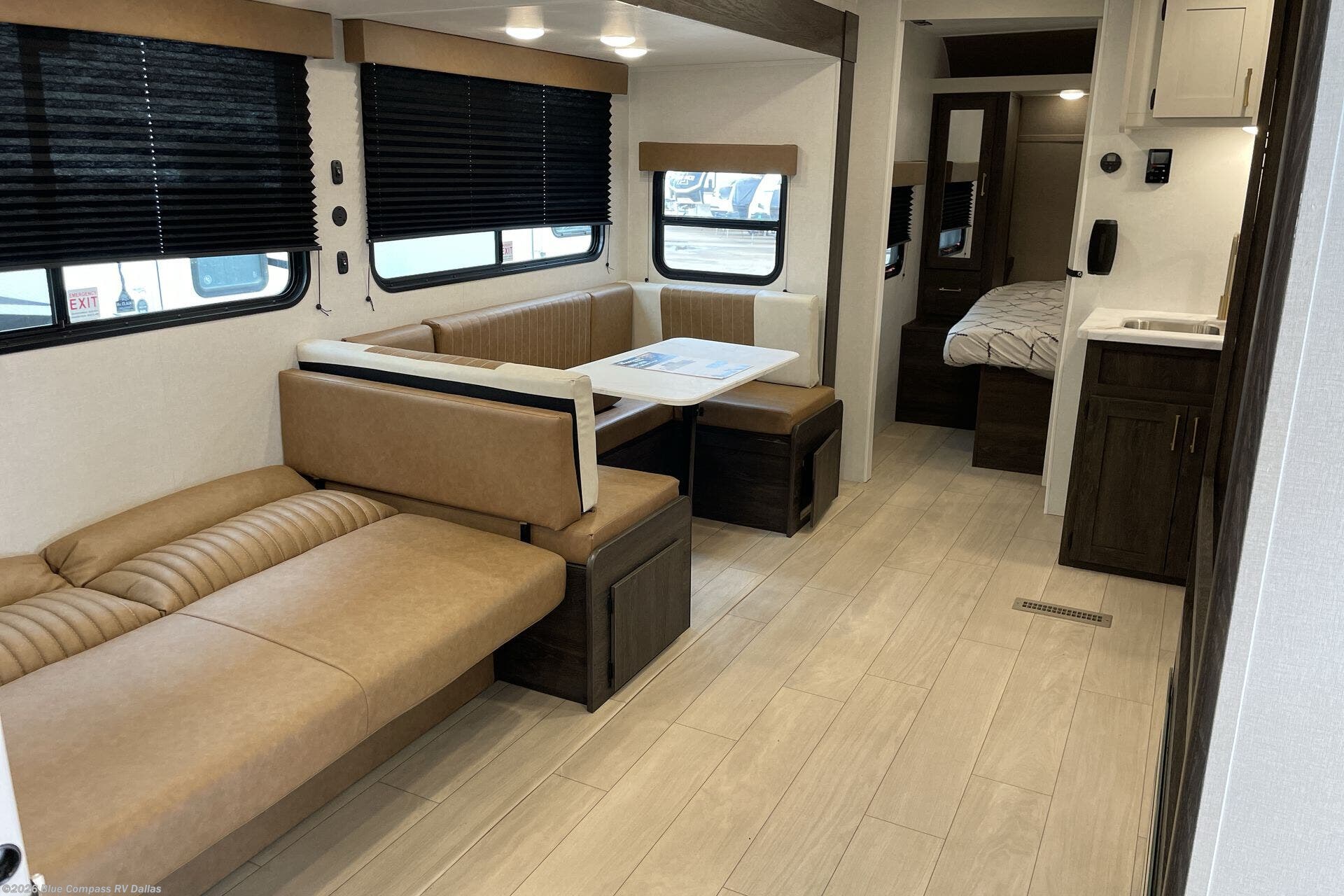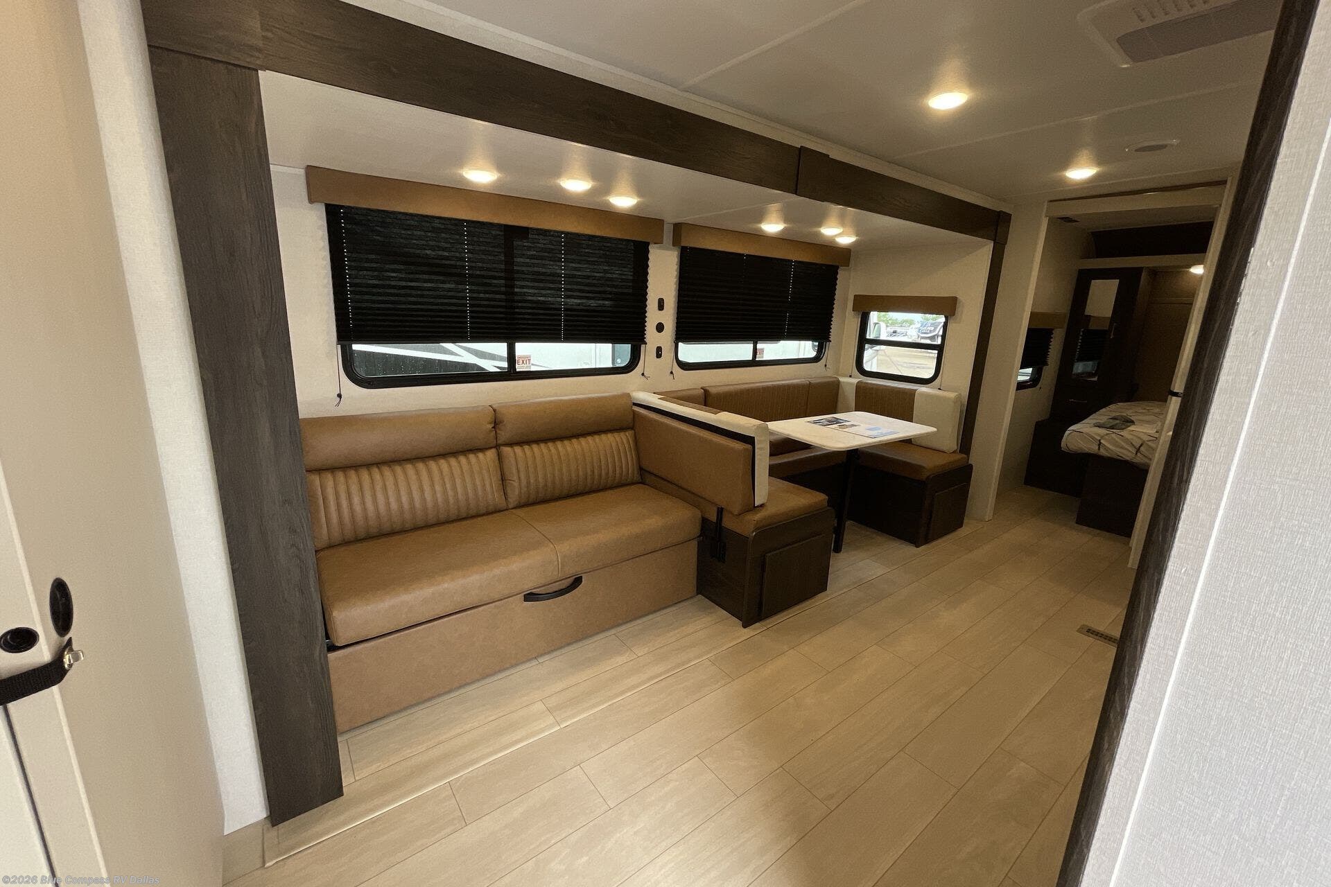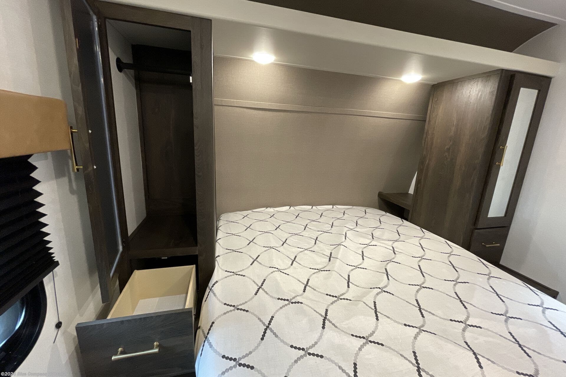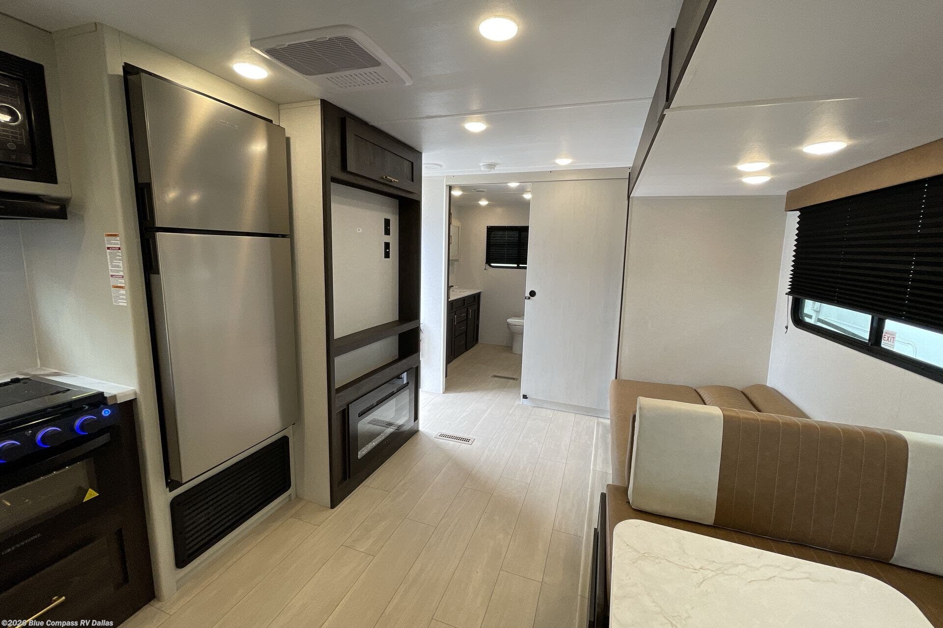 You need this award-winning travel trailer for your next weekend getaway! The full rear bathroom is decked out in features you're going to love like the dual-sink vanity for two to get ready at once, the linen closet next to the 30" x 36" shower and the second linen closet across from the closet with washer and dryer prep. After a fun-filled day outdoors, you can head inside and relax on either the 60" jackknife sofa and enjoy the entertainment center with a fireplace or grab a snack from the 10-cu. ft. refrigerator and play a few card games at the U-shaped dinette. The front private bedroom features a 60" x 74" RV queen bed with shirt closets on either side of it to keep your clothes looking nice!
