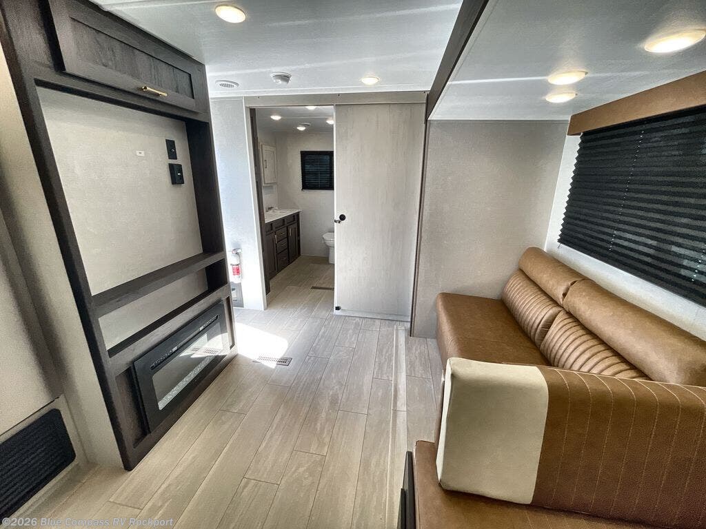 You need this award-winning travel trailer for your next weekend getaway! The full rear bathroom is decked out in features you're going to love like the dual-sink vanity for two to get ready at once, the linen closet next to the 30" x 36" shower and the second linen closet across from the closet with washer and dryer prep. After a fun-filled day outdoors, you can head inside and relax on either the 60" jackknife sofa and enjoy the entertainment center with a fireplace or grab a snack from the 10-cu. ft. refrigerator and play a few card games at the U-shaped dinette. The front private bedroom features a 60" x 74" RV queen bed with shirt closets on either side of it to keep your clothes looking nice!