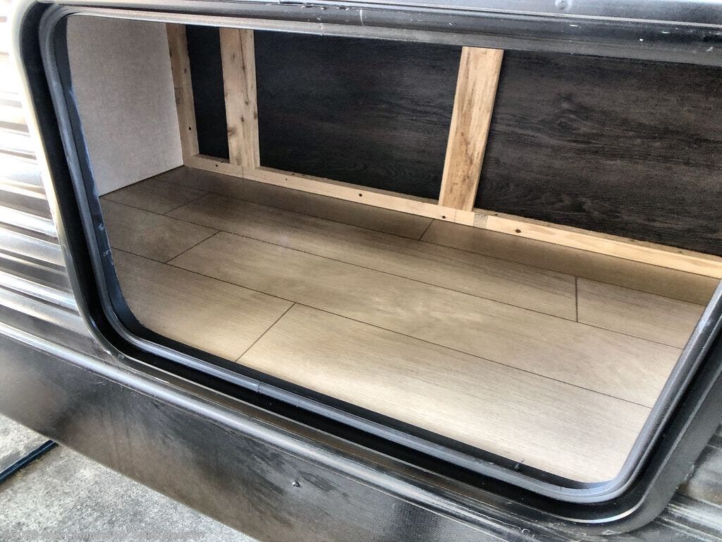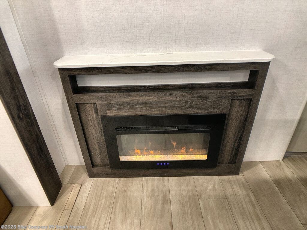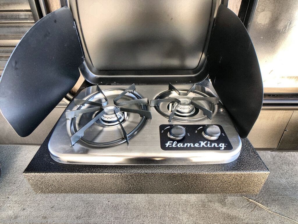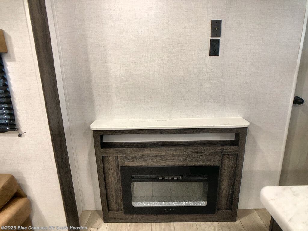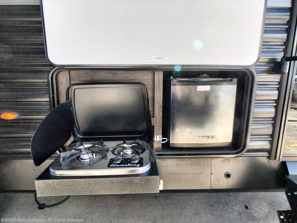 You will feel like royalty camping in this travel trailer! The rear private bedroom features a king bed, a wardrobe next to a dresser to keep your clothes looking nice, a private entrance into the dual-entry bath, and the second entrance/exit to the unit too. You won't believe what the front of this unit has in store for you either - a set of queen-size bunk beds with a wardrobe and a storage area! Just outside the front bedroom is the entertainment center with a fireplace and a 60" jackknife sofa to take an afternoon nap on. The kitchen has everything you will need to whip up a delicious meal, but if you desire some fresh air while you cook then head to the outside kitchen and make dinner there!