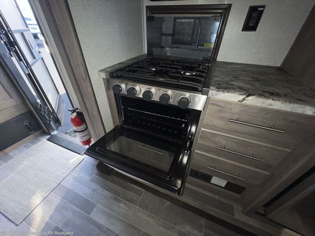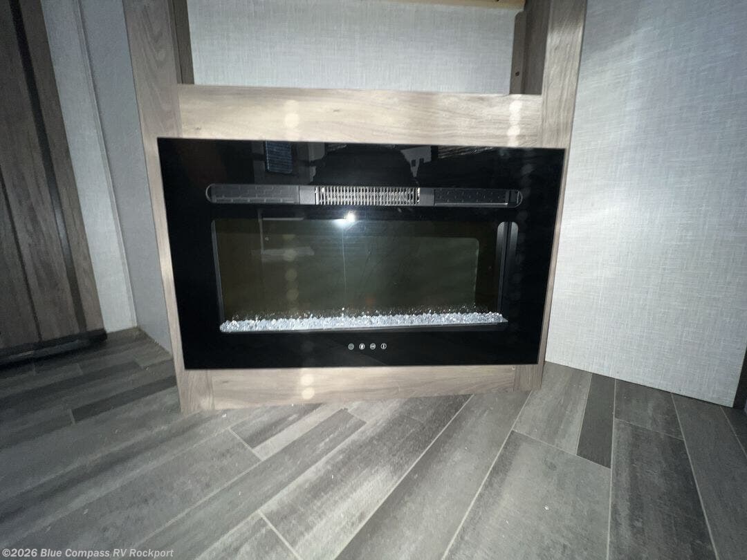 You won't believe all that this travel trailer has to offer! There is a kitchen island with a chair on either side of it for two helpers to roll out the dough for cinnamon rolls in the morning and enjoy them at the U-shaped dinette. One of the entrance doors leads right into the half bathroom which also leads into the rear private bunkhouse. Inside the bunkhouse is a flip-up bunk above the jackknife sofa which are both across from a second bunk and wardrobe/entertainment center. While the kids are busy playing in their bedroom, you and your spouse can relax on the jack knife sofa across from the fireplace or head to the front private bedroom to relax on the RV queen bed, plus you have your own entrance into the walk-through bathroom which will come in very handy at night!