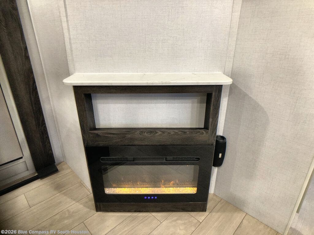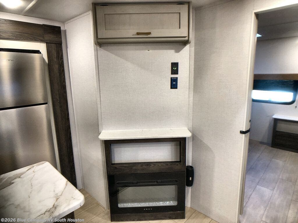 You won't believe all that this travel trailer has to offer! There is a kitchen island with a chair on either side of it for two helpers to roll out the dough for cinnamon rolls in the morning and enjoy them at the U-shaped dinette. One of the entrance doors leads right into the half bathroom which also leads into the rear private bunkhouse. Inside the bunkhouse is a flip-up bunk above the jackknife sofa which are both across from a second bunk and wardrobe/entertainment center. While the kids are busy playing in their bedroom, you and your spouse can relax on the jack knife sofa across from the fireplace or head to the front private bedroom to relax on the RV queen bed, plus you have your own entrance into the walk-through bathroom which will come in very handy at night!