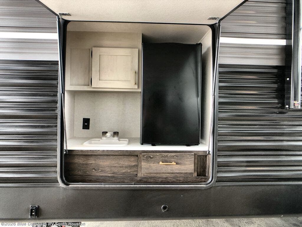 Camp like royalty in this travel trailer! The front private bedroom features a queen bed slide across from a dresser and next to a large wardrobe with overhead cabinets, plus there is a closet with washer and dryer prep. The living area has a U-shaped dinette and 60" jackknife sofa that can be pulled out for a comfortable place to lie down and watch a movie on the HDTV while a fire is roaring in the electric fireplace. The rear private bunkhouse is big enough to house all of the kiddos with the 38" x 74" flip-up bunk above the 72" jackknife sofa, and the 28" x 66" mat under the sofa, plus the 38" x 74" bunk above the wardrobe/entertainment center. And you're sure to enjoy the outdoor kitchen with a sink, refrigerator, and storage.