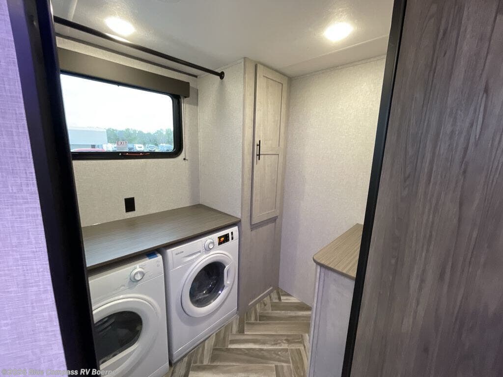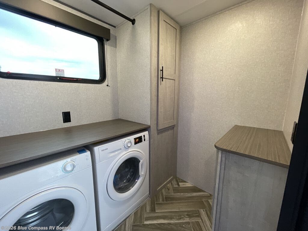 If you and your loved ones wish to escape the hustle and bustle of everyday life, then you need this travel trailer! The rear living area is filled with relaxation with a 72" jackknife sofa and two recliner chairs across from the entertainment center with a fireplace and a 39" TV. The kitchen is full of comforts too, including a kitchen island with a chair on either side of it, a 42" U-shaped dinette, and a pantry for snacks. This middle utility room features washer and dryer prep, a dresser, and a linen closet, making this room the perfect mud room or laundry room if you choose to add those appliances. When it's time to call it a night, the front master bedroom with an RV queen bed is sure to bring a great night's rest.