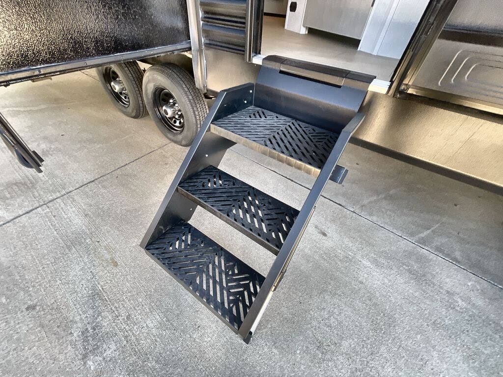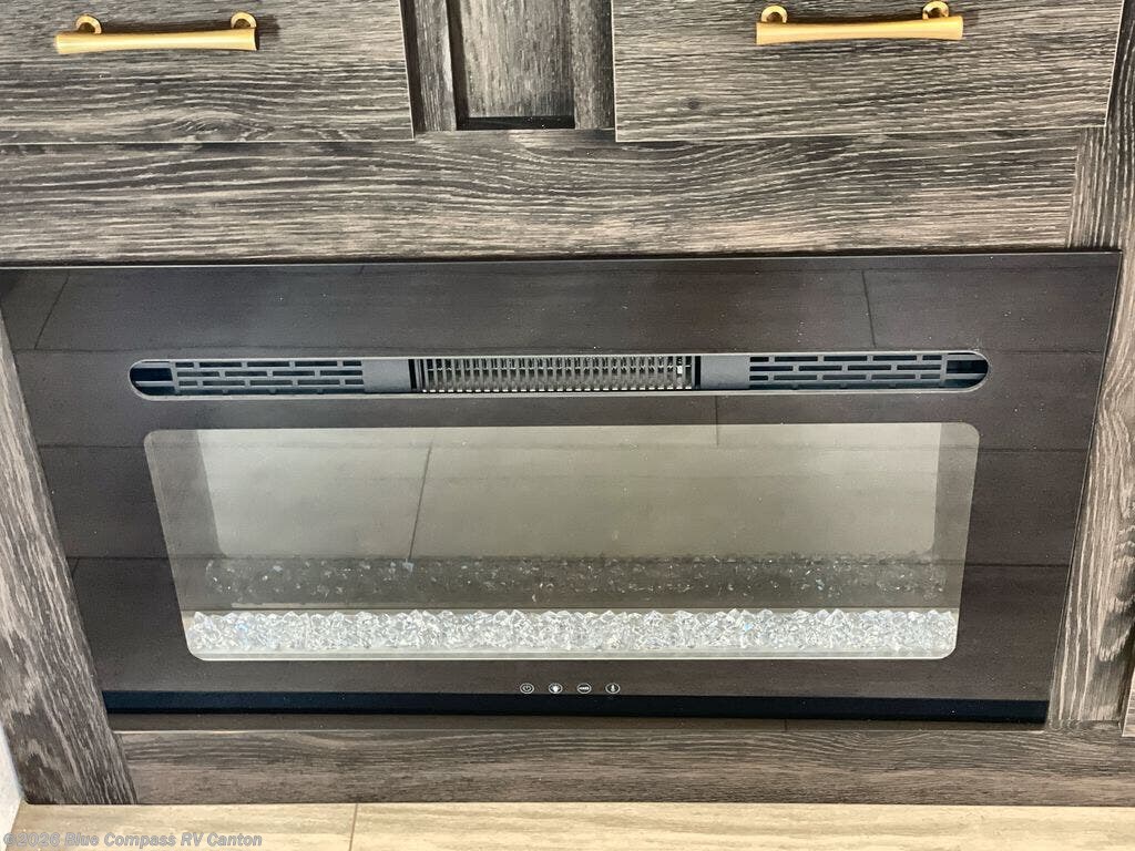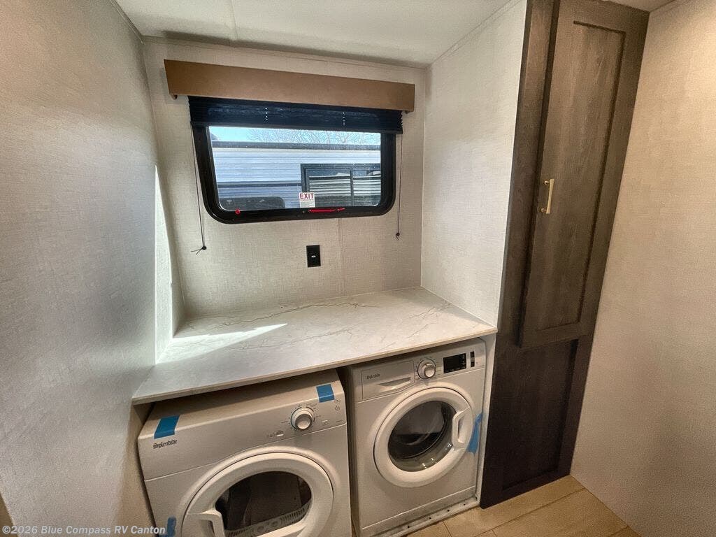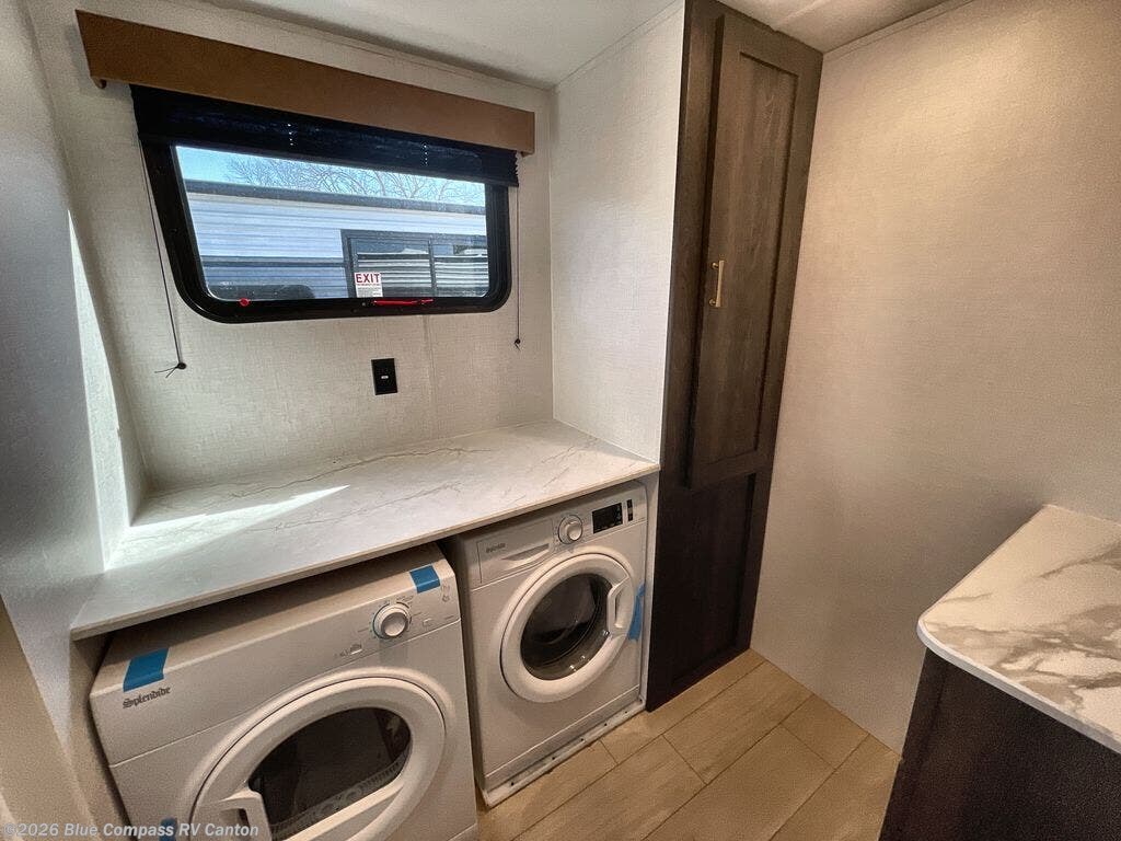 If you and your loved ones wish to escape the hustle and bustle of everyday life, then you need this travel trailer! The rear living area is filled with relaxation with a 72" jackknife sofa and two recliner chairs across from the entertainment center with a fireplace and a 39" TV. The kitchen is full of comforts too, including a kitchen island with a chair on either side of it, a 42" U-shaped dinette, and a pantry for snacks. This middle utility room features washer and dryer prep, a dresser, and a linen closet, making this room the perfect mud room or laundry room if you choose to add those appliances. When it's time to call it a night, the front master bedroom with an RV queen bed is sure to bring a great night's rest.
