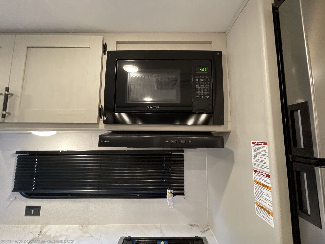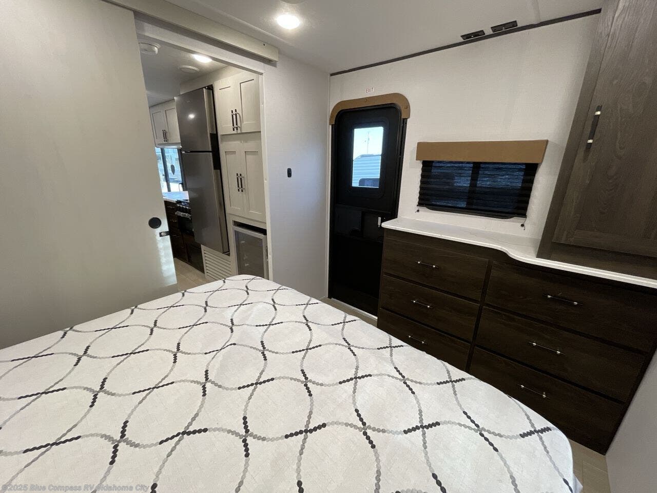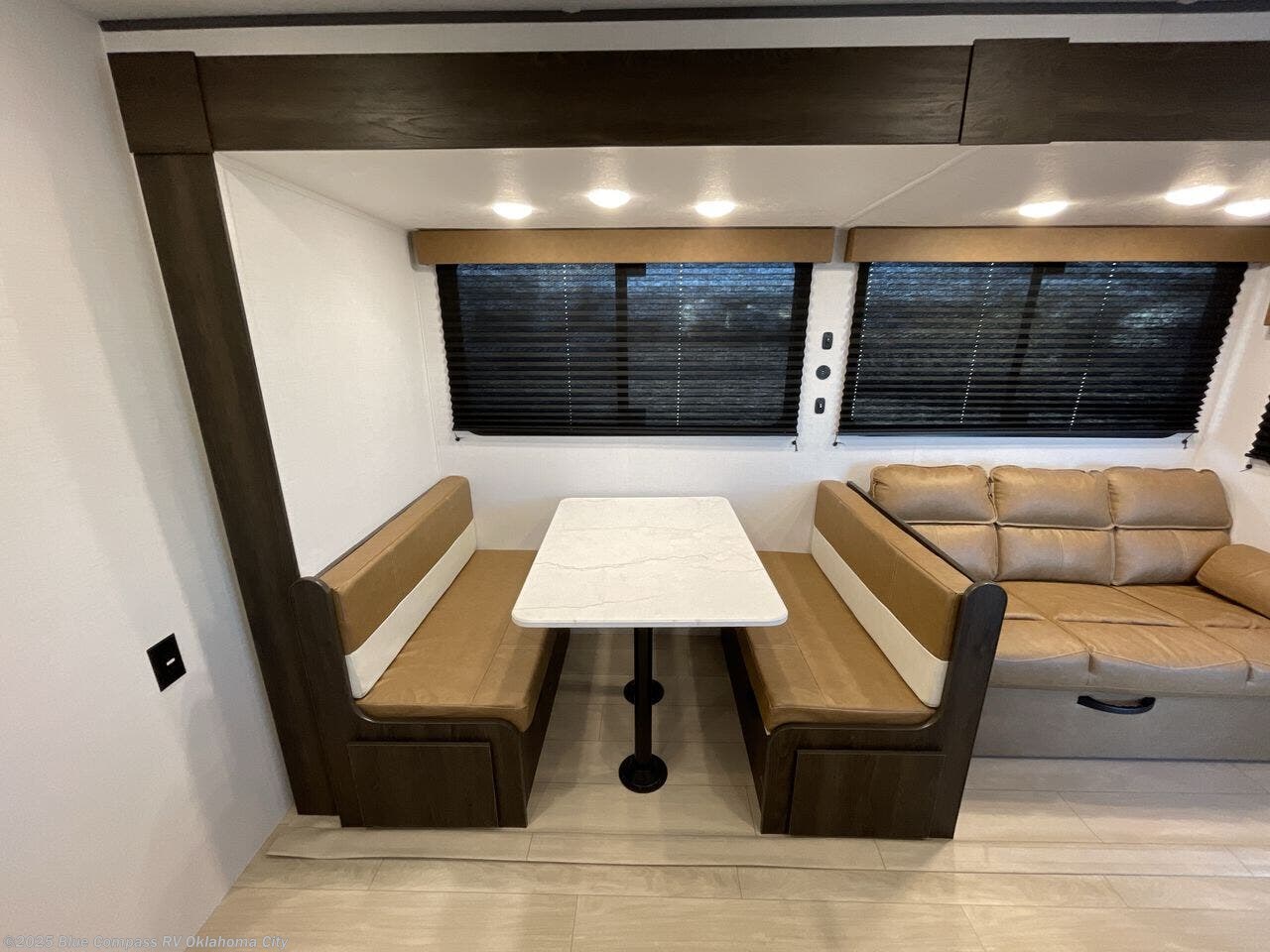 Pack your bags and invite your friends to tag along in this travel trailer! The master suite has an RV queen bed slide across from a dresser next to a wardrobe and it's own rear full bathroom with a 30" x 36" shower. The front private bedroom has a king bed slide across from a dresser and a front wardrobe, washer and dryer prep, plus an entrance into the dual entry bathroom which has a 34" radius shower. Both bedrooms have an entrance/exit door to the unit, and the 60" x 72" patio door leads directly into the kitchen/living area. The chef can prepare delicious meals with the three burner cooktop then you can enjoy them at the 38" booth dinette next to a 60" jackknife sofa for a relaxing evening by the 50" TV at the entertainment center.