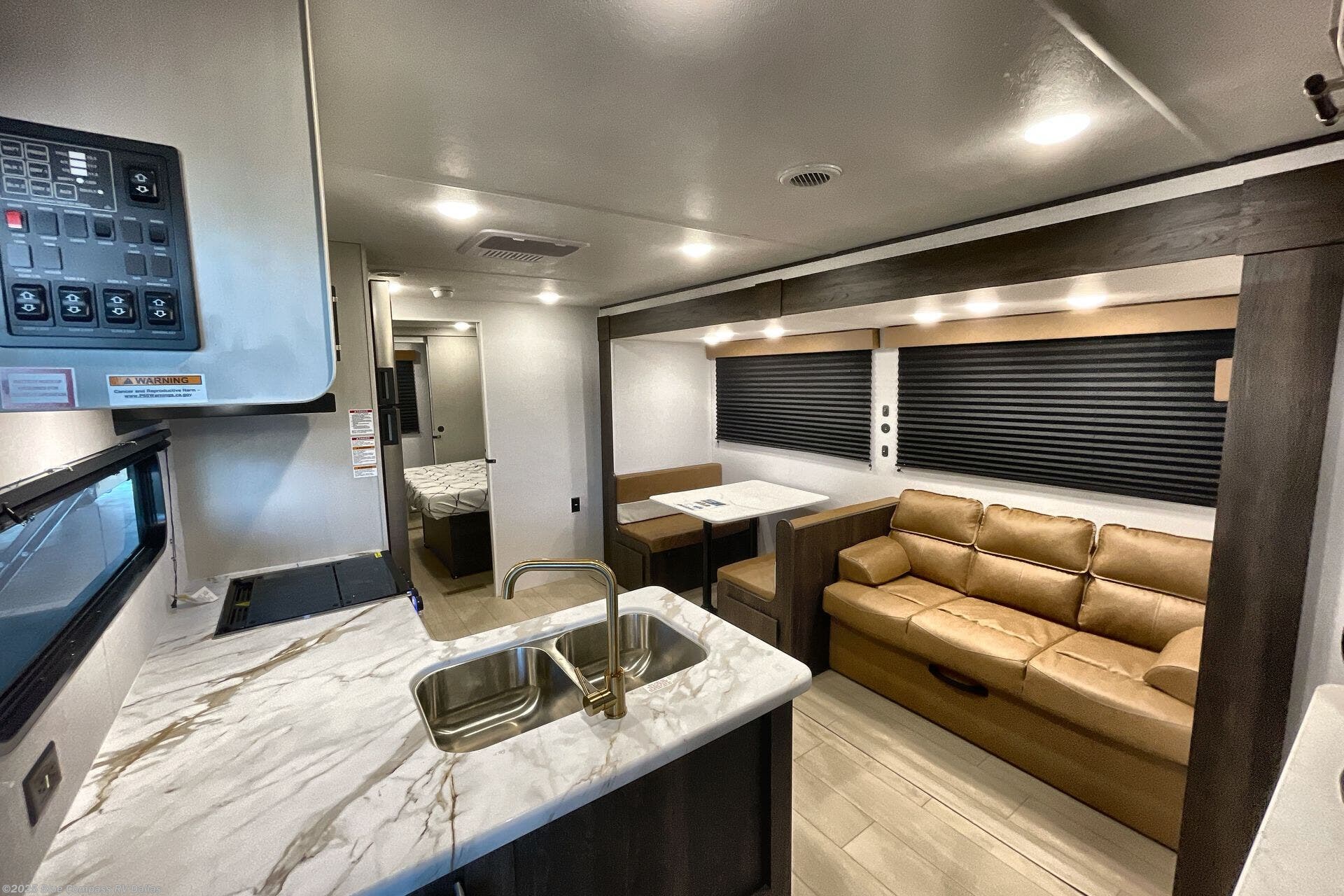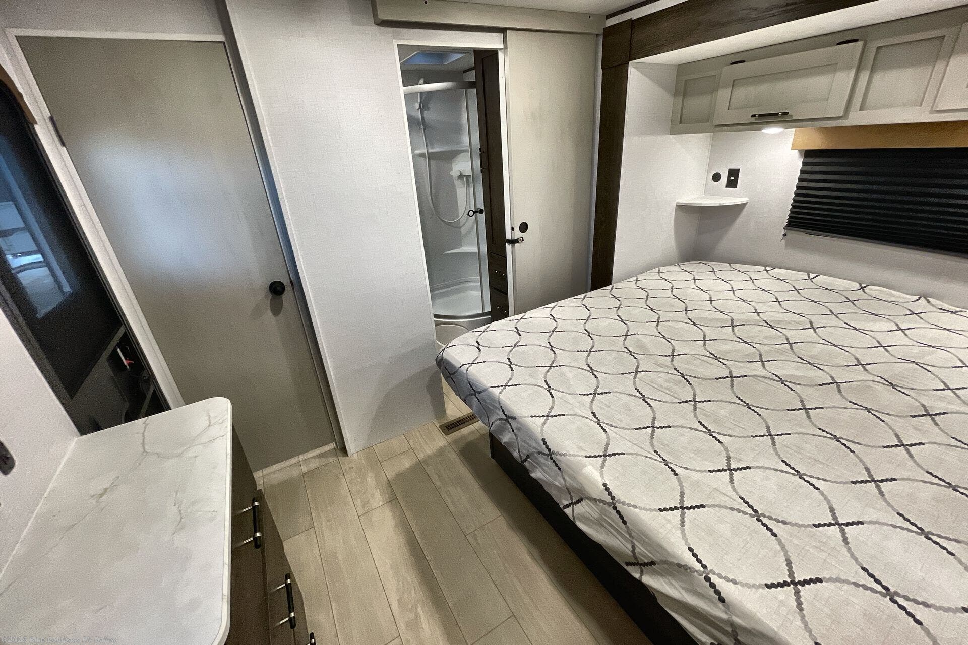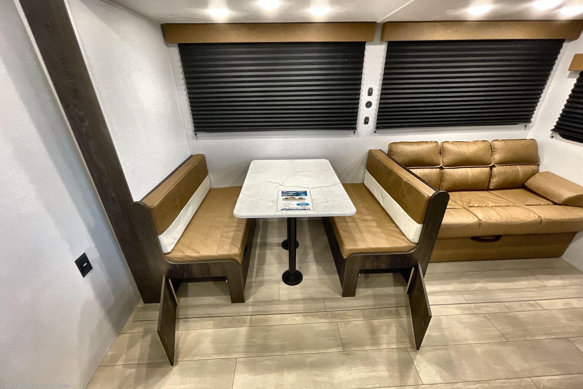 Pack your bags and invite your friends to tag along in this travel trailer! The master suite has an RV queen bed slide across from a dresser next to a wardrobe and it's own rear full bathroom with a 30" x 36" shower. The front private bedroom has a king bed slide across from a dresser and a front wardrobe, washer and dryer prep, plus an entrance into the dual entry bathroom which has a 34" radius shower. Both bedrooms have an entrance/exit door to the unit, and the 60" x 72" patio door leads directly into the kitchen/living area. The chef can prepare delicious meals with the three burner cooktop then you can enjoy them at the 38" booth dinette next to a 60" jackknife sofa for a relaxing evening by the 50" TV at the entertainment center.