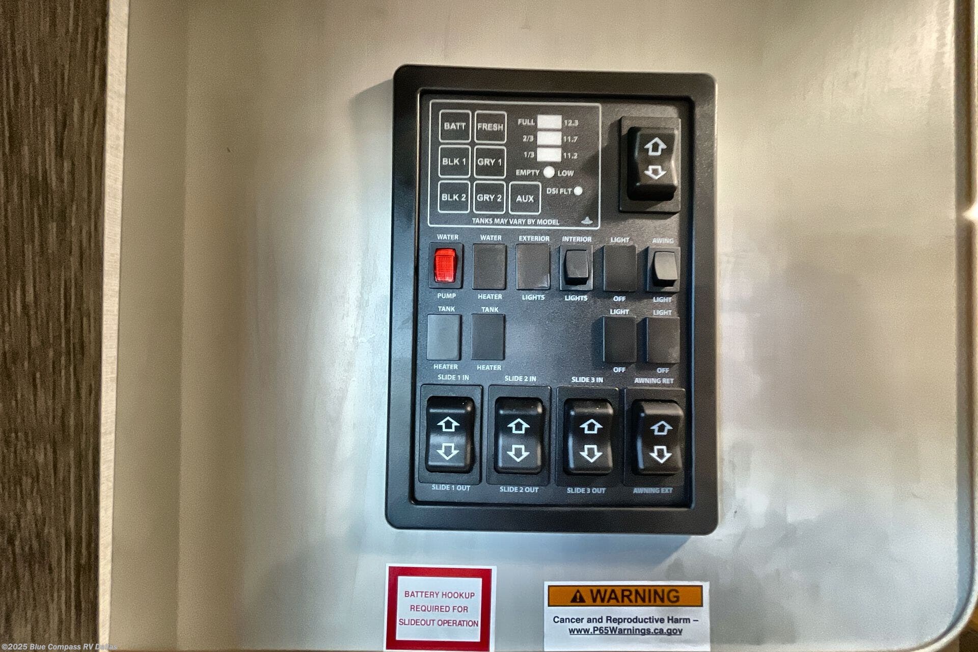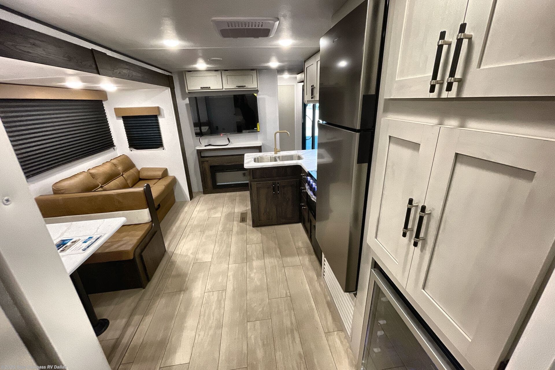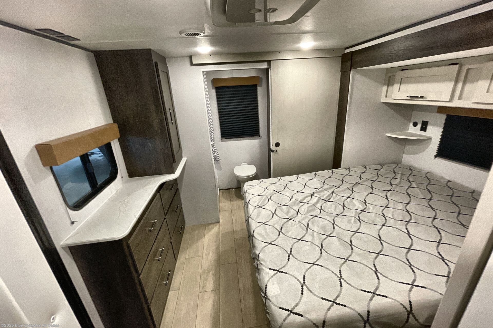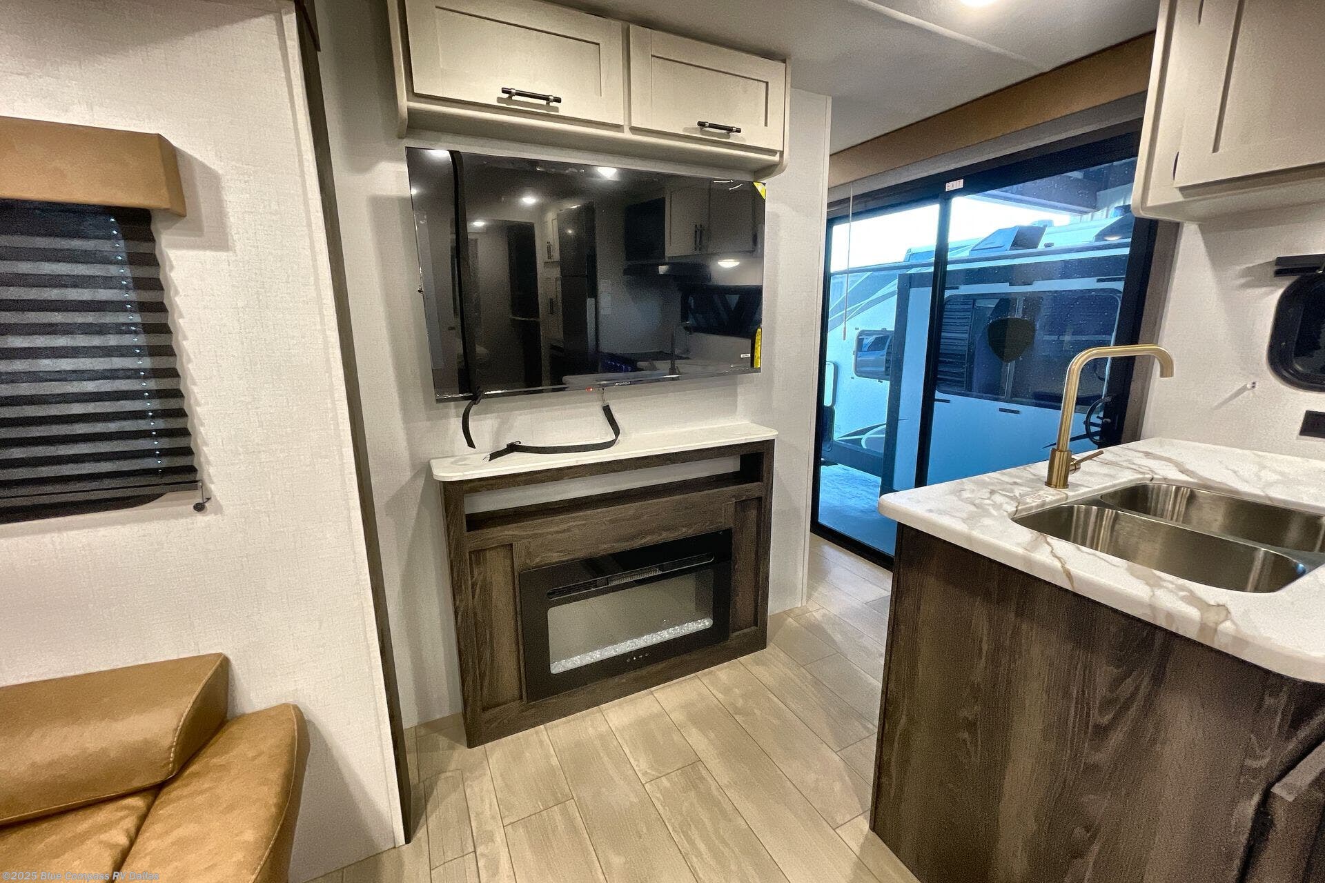Pack your bags and invite your friends to tag along in this travel trailer! The master suite has an RV queen bed slide across from a dresser next to a wardrobe and it's own rear full bathroom with a 30" x 36" shower. The front private bedroom has a king bed slide across from a dresser and a front wardrobe, washer and dryer prep, plus an entrance into the dual entry bathroom which has a 34" radius shower. Both bedrooms have an entrance/exit door to the unit, and the 60" x 72" patio door leads directly into the kitchen/living area. The chef can prepare delicious meals with the three burner cooktop then you can enjoy them at the 38" booth dinette next to a 60" jackknife sofa for a relaxing evening by the 50" TV at the entertainment center.