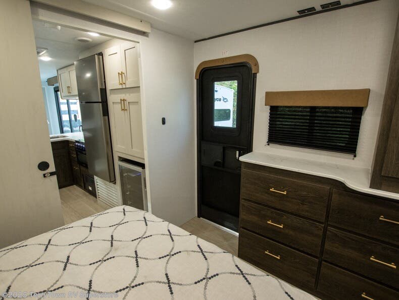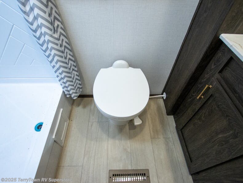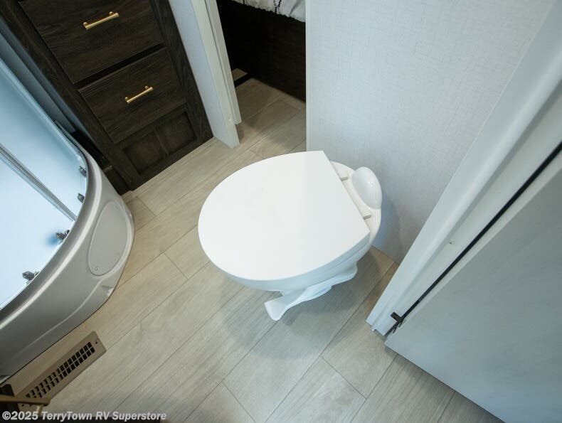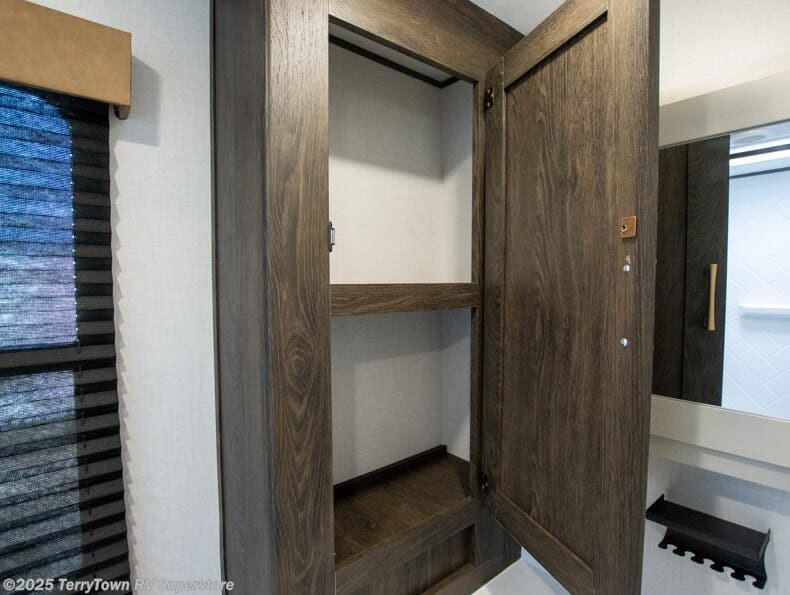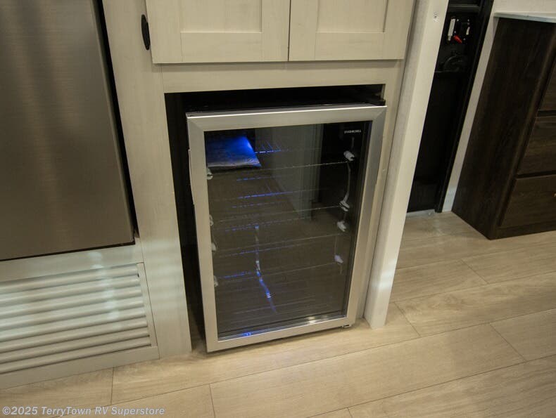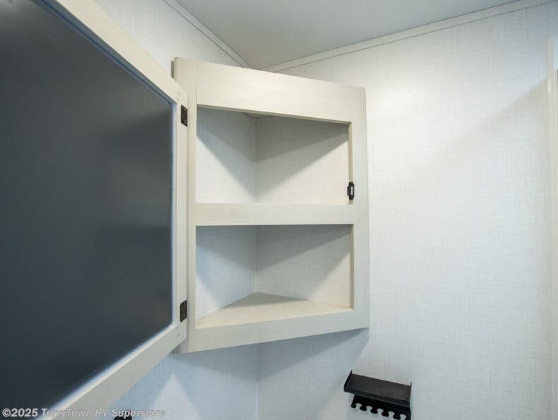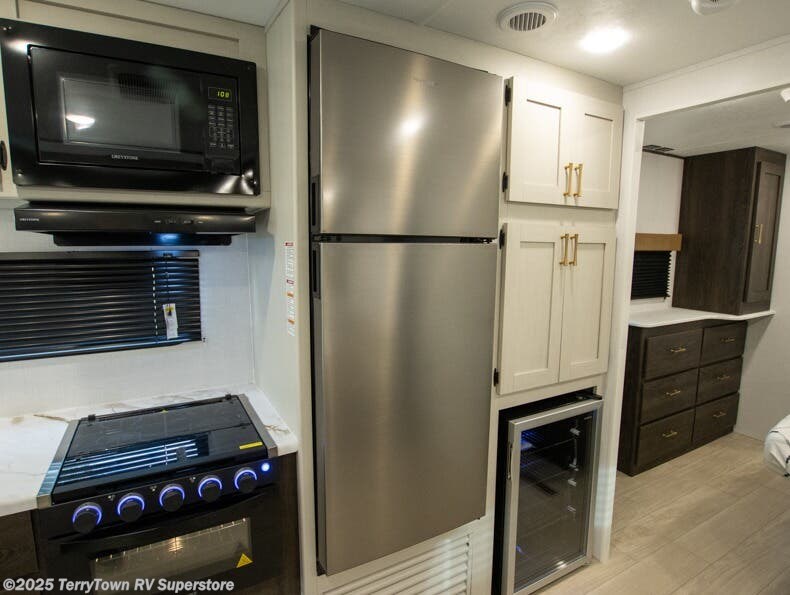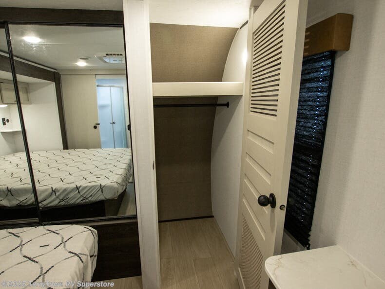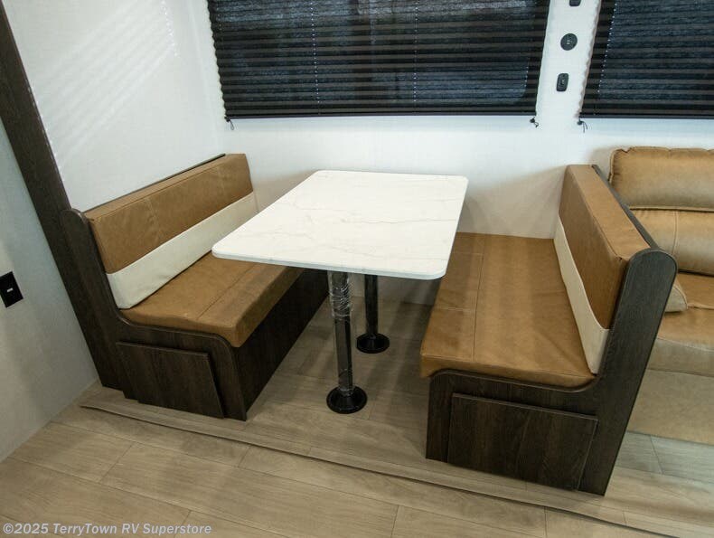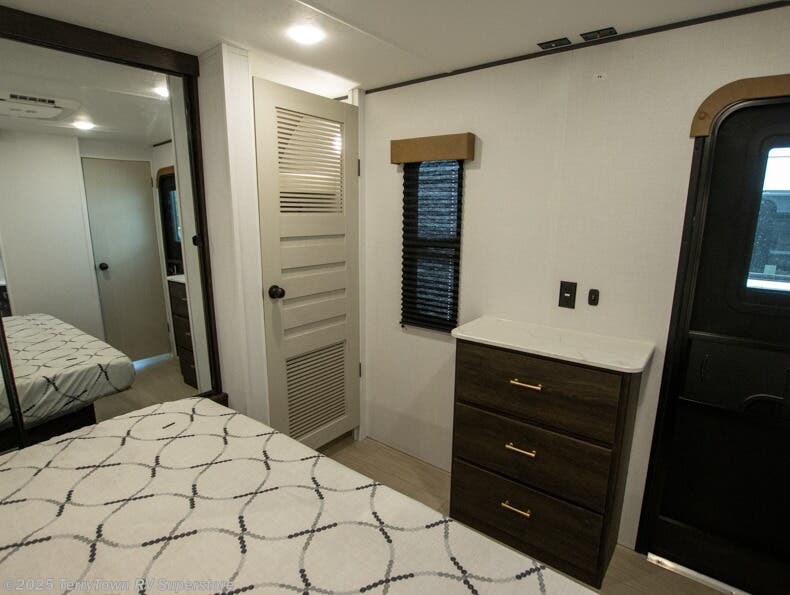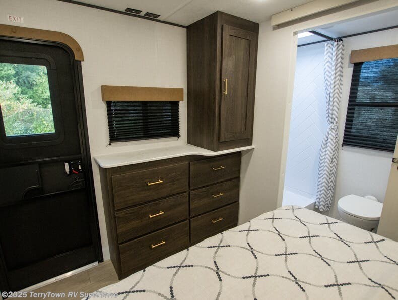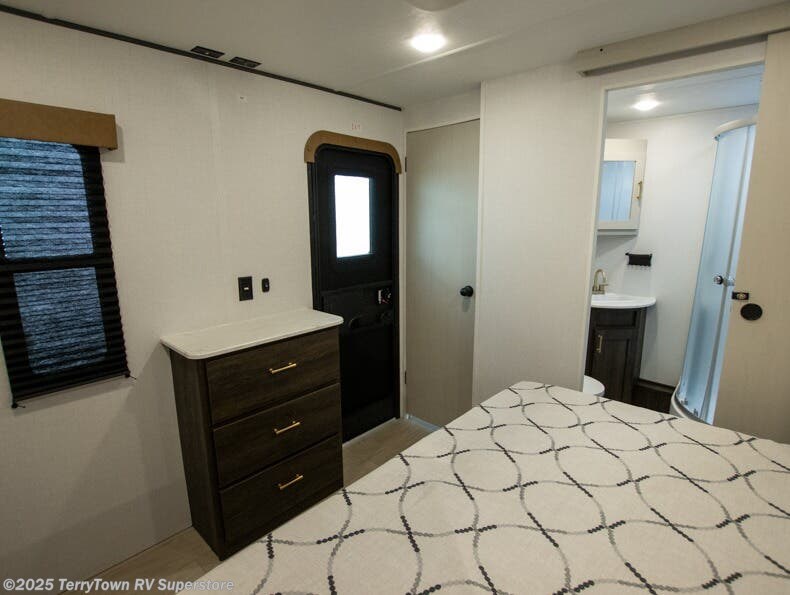 Pack your bags and invite your friends to tag along in this travel trailer! The master suite has an RV queen bed slide across from a dresser next to a wardrobe and it's own rear full bathroom with a 30" x 36" shower. The front private bedroom has a king bed slide across from a dresser and a front wardrobe, washer and dryer prep, plus an entrance into the dual entry bathroom which has a 34" radius shower. Both bedrooms have an entrance/exit door to the unit, and the 60" x 72" patio door leads directly into the kitchen/living area. The chef can prepare delicious meals with the three burner cooktop then you can enjoy them at the 38" booth dinette next to a 60" jackknife sofa for a relaxing evening by the 50" TV at the entertainment center.