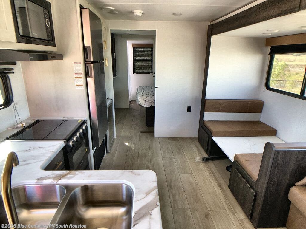 Pack your bags and invite your friends to tag along in this travel trailer! The master suite has an RV queen bed slide across from a dresser next to a wardrobe and its own rear full bathroom with a 30" x 36" shower. The front private bedroom has a king bed slide across from a dresser and a front wardrobe, washer and dryer prep, plus an entrance into the dual entry bathroom which has a 34" radius shower. Both bedrooms have an entrance/exit door to the unit, and the 60" x 72" patio door leads directly into the kitchen/living area. The chef can prepare delicious meals with the three-burner cooktop then you can enjoy them at the 38" booth dinette next to a 60" jackknife sofa for a relaxing evening by the 50" TV at the entertainment center.