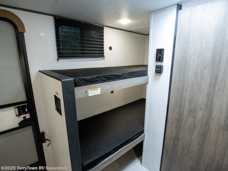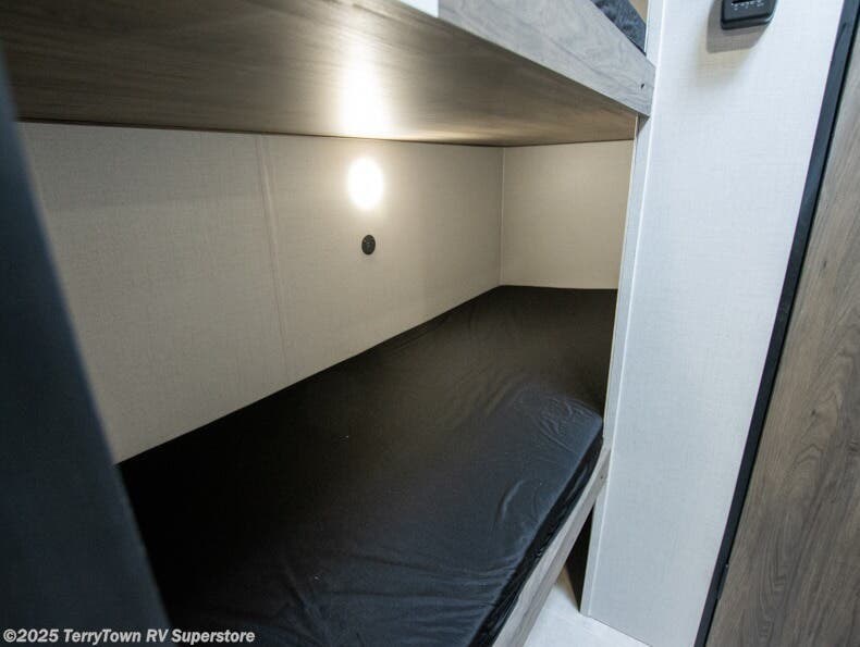 This compact, yet cozy travel trailer is perfect for weekend trips to the lake. There is a queen bed up front with overhead cabinets for your books, board games and more. Your guests or littles ones can claim the bunk beds in the rear corner, and everyone can stay clean with the private shower and toilet. A functional kitchenette will let you make meals for your crew, and the refrigerator will keep cold items fresh!