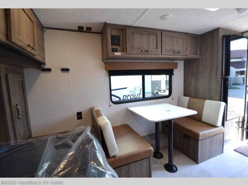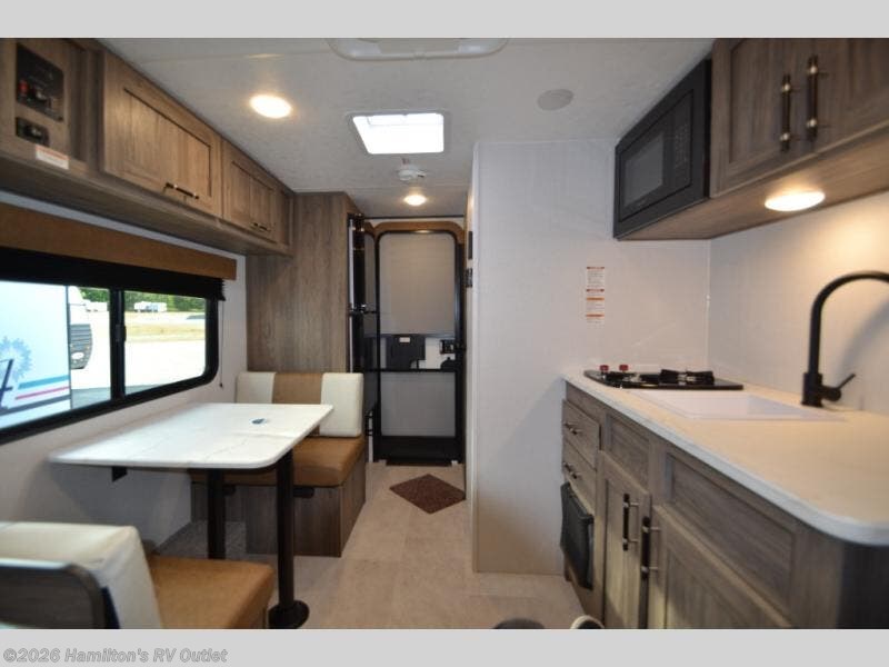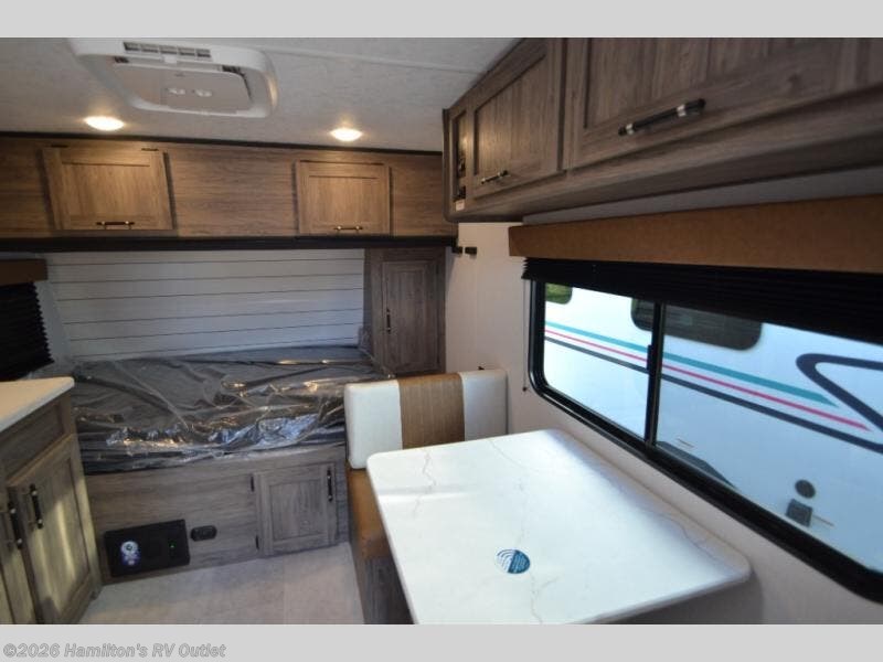 This compact, yet cozy travel trailer is perfect for weekend trips to the lake. There is a full-size bed up front with a fold-down bunk above, plus a wardrobe for clothes. A functional kitchenette will let you make meals for your crew, and there is a booth dinette where you can dine together!