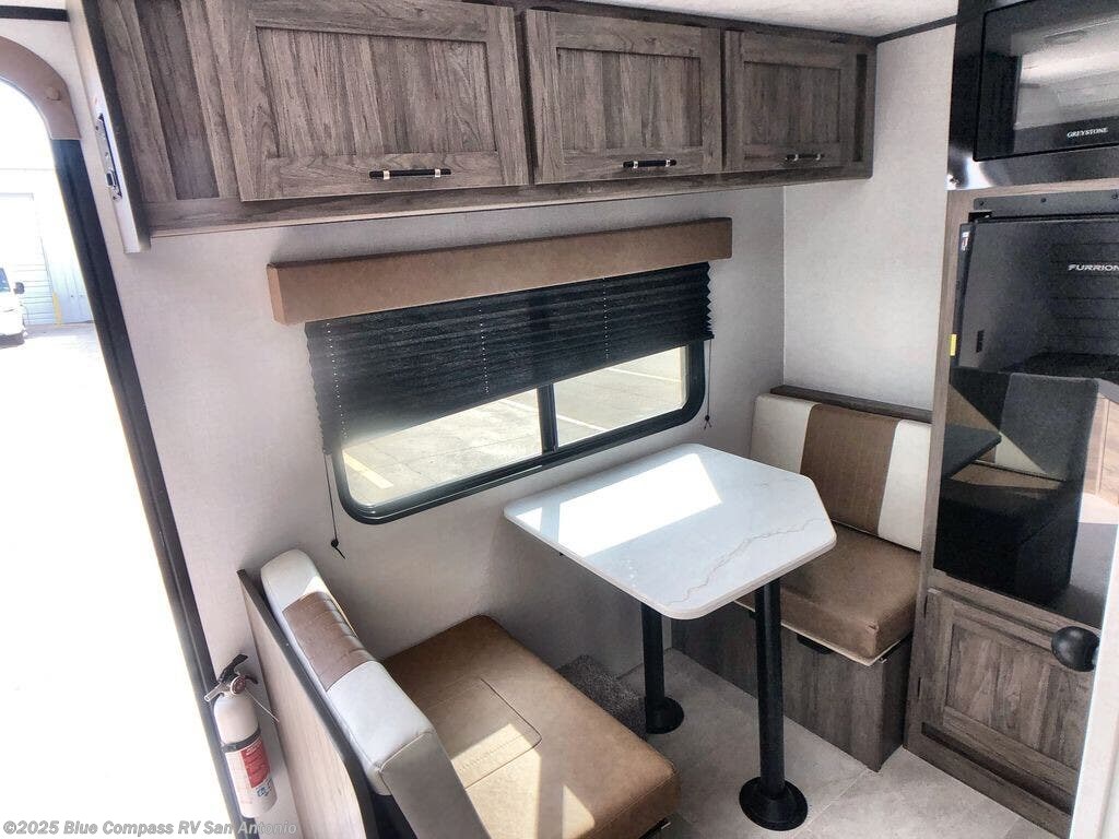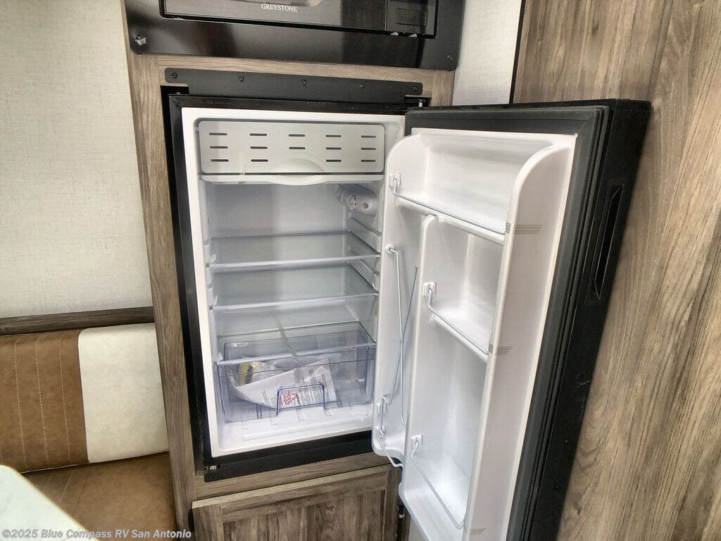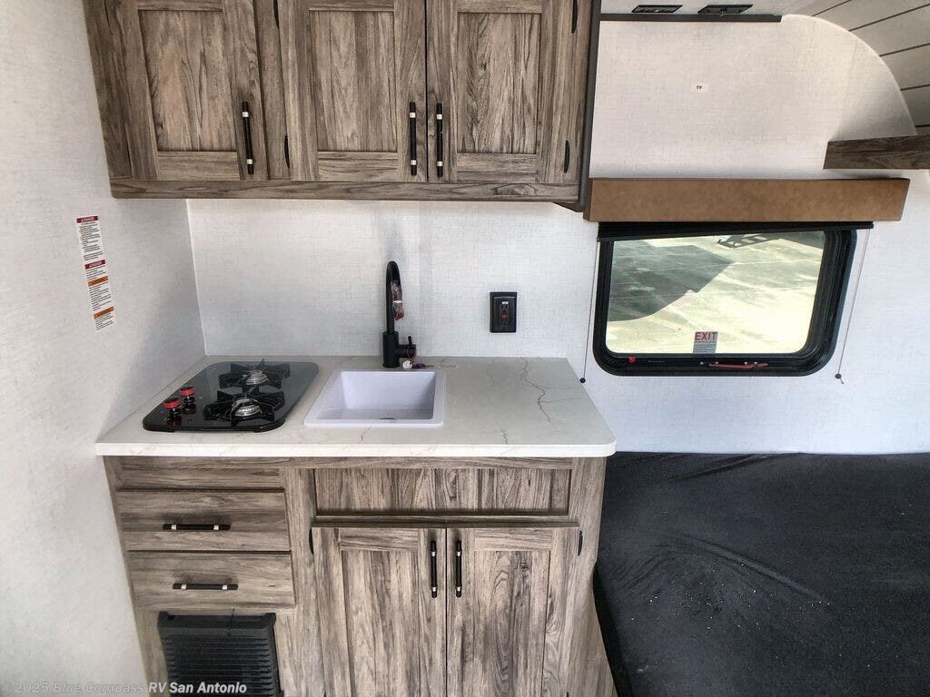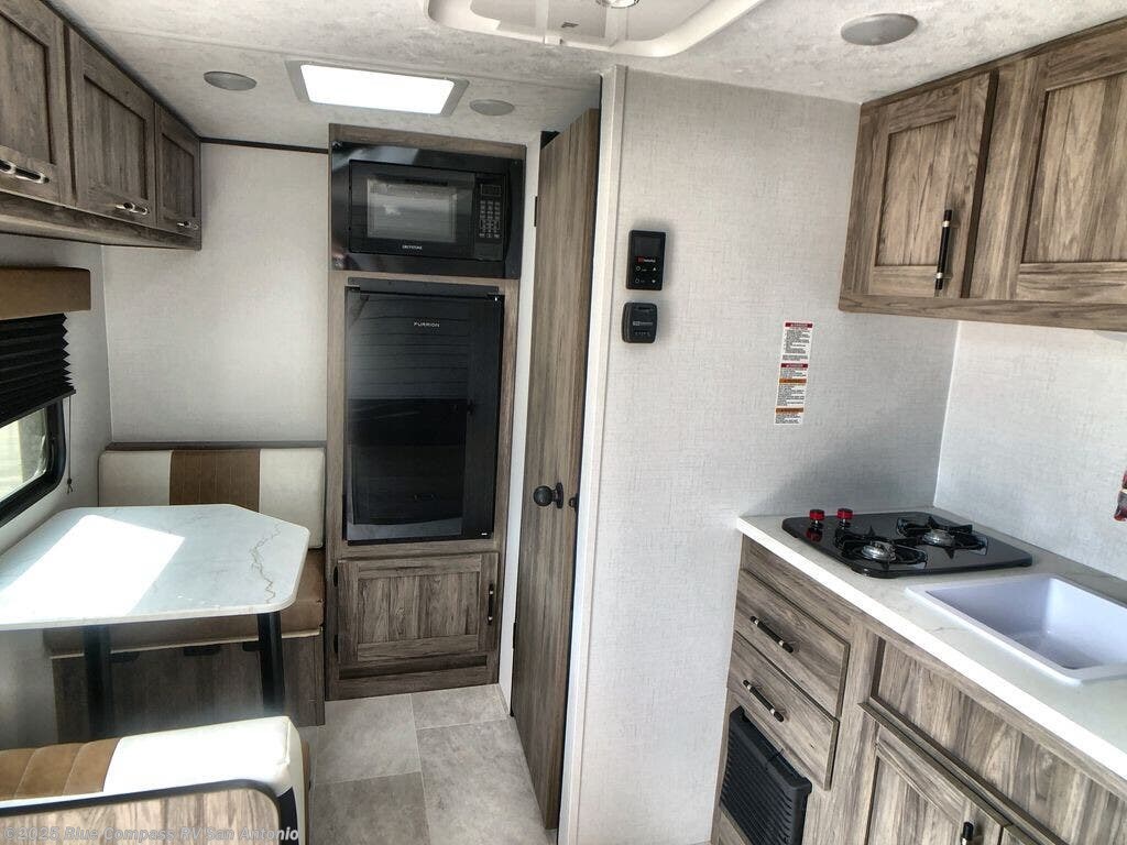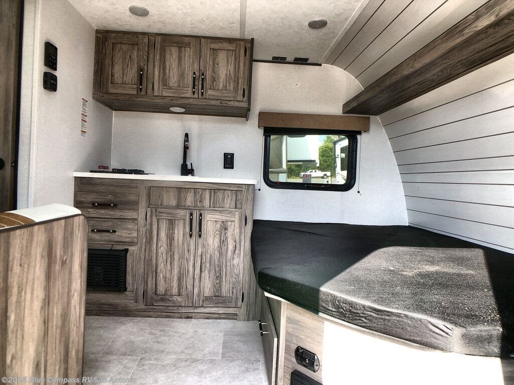 This compact, yet cozy travel trailer is perfect for weekend trips to the lake. There is a full-size bed up front with an overhead cabinet for your belongings. A functional kitchenette will let you make meals for your crew, and there is a booth dinette where you can dine together. There are also overhead cabinets above the dinette for snacks, board games and more!