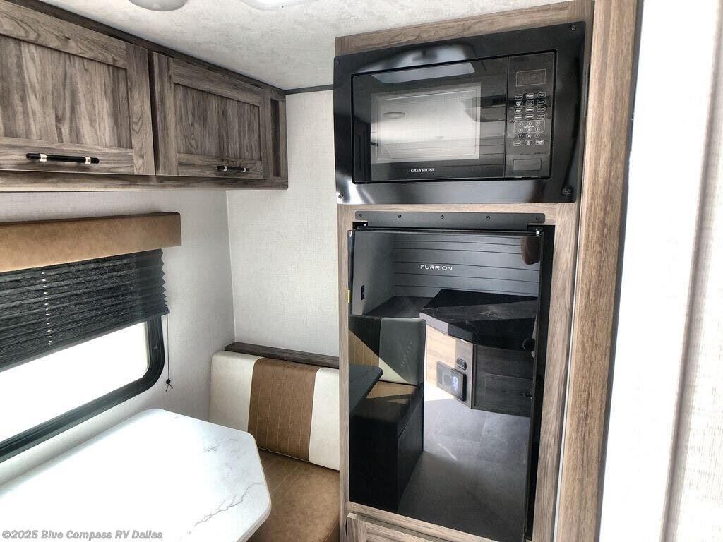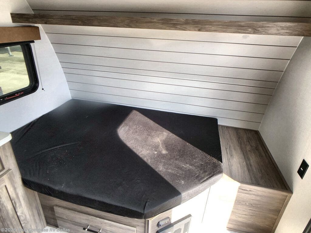 This compact, yet cozy travel trailer is perfect for weekend trips to the lake. There is a full-size bed up front with an overhead cabinet for your belongings. A functional kitchenette will let you make meals for your crew, and there is a booth dinette where you can dine together. There are also overhead cabinets above the dinette for snacks, board games and more!