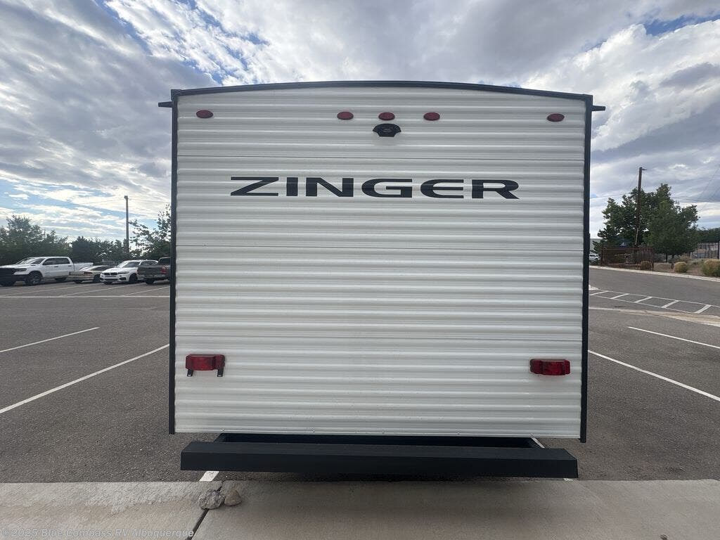 This Zinger Lite travel trailer is perfect for your next family vacation or weekend at the lake with friends. With room for five, this unit gives you the space you need to pack up the kids and the dog and get ready to hit the road! With an RV queen bed and bunk beds, everyone will have a place to sleep. The 38" booth dinette can comfortably hold one to two little ones or an adult guest. Use the two burner range to make a home-cooked meal and easily store your leftovers in the 12V refrigerator. Enjoy extra privacy with a rear corner bath that includes a 30" x 36" shower. This unit features multiple overhead compartments, so bring along the board games and other valuables from home.