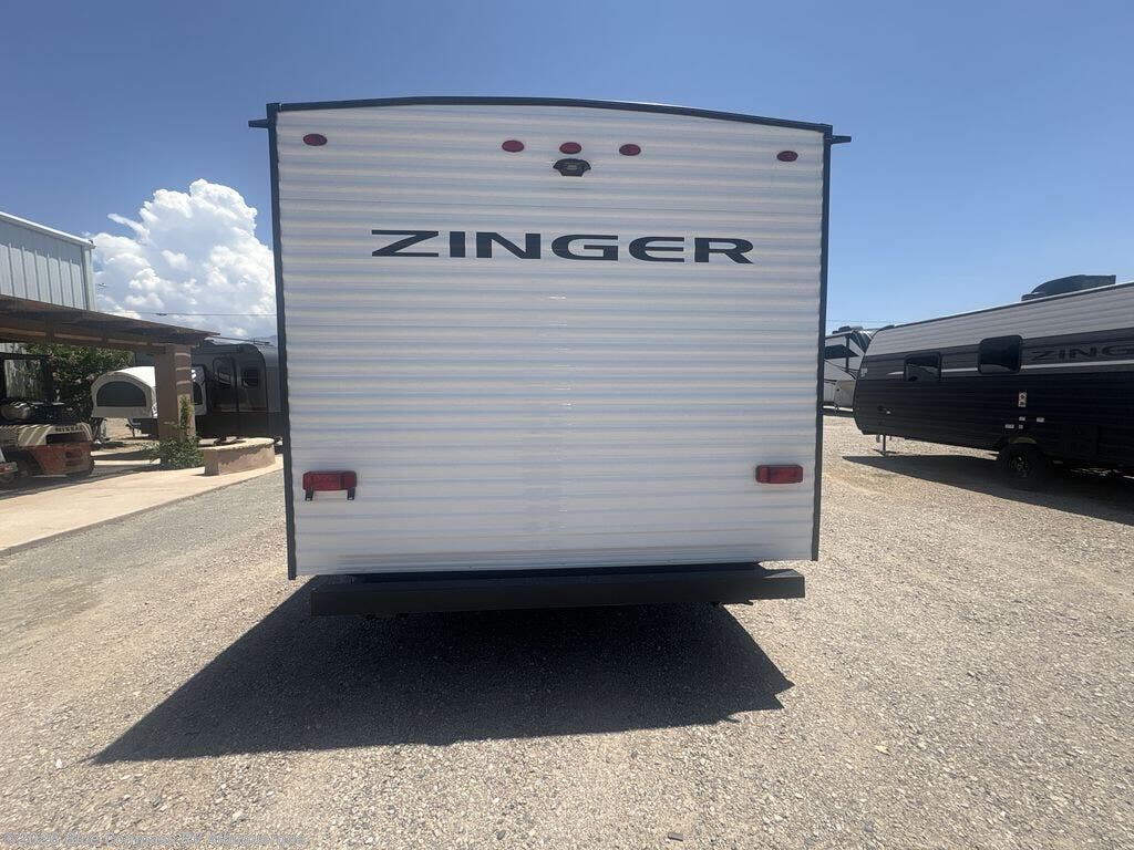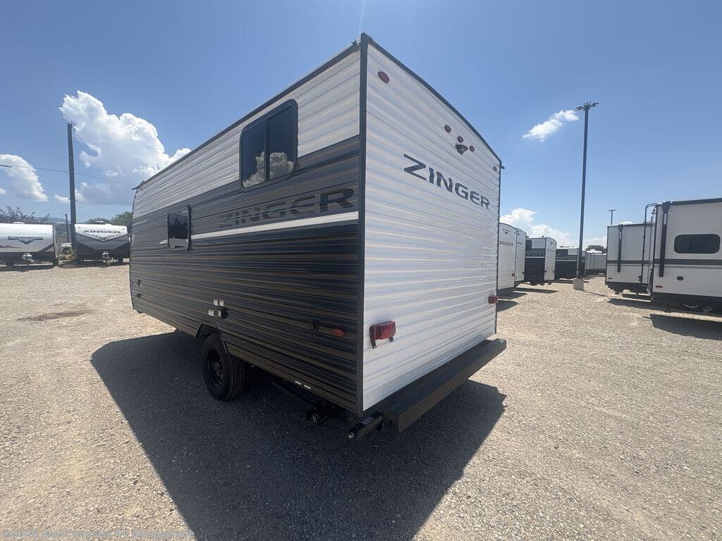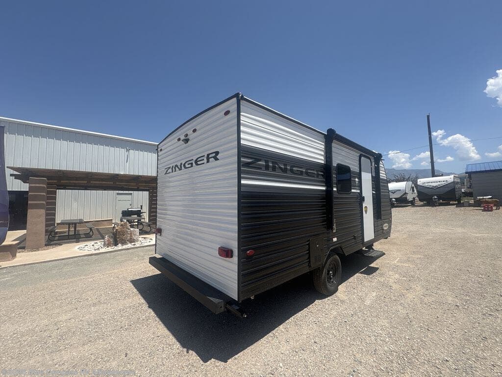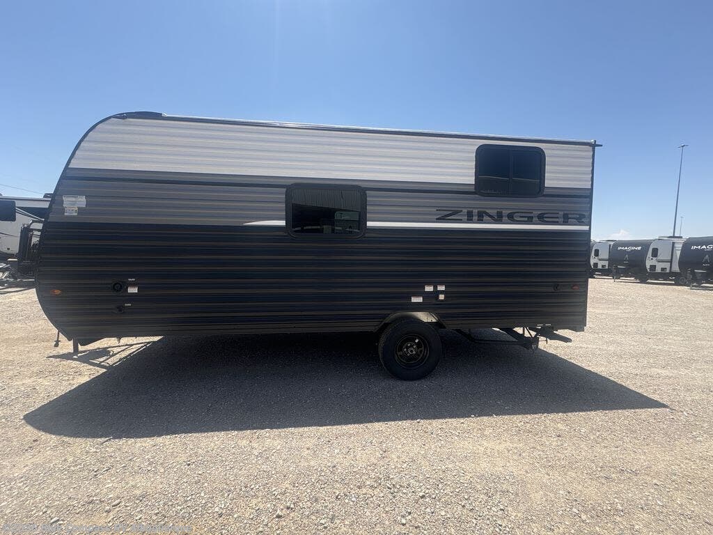 This Zinger Lite travel trailer is perfect for your next family vacation or weekend at the lake with friends. With room for five, this unit gives you the space you need to pack up the kids and the dog and get ready to hit the road! With an RV queen bed and bunk beds, everyone will have a place to sleep. The 38" booth dinette can comfortably hold one to two little ones or an adult guest. Use the two burner range to make a home-cooked meal and easily store your leftovers in the 12V refrigerator. Enjoy extra privacy with a rear corner bath that includes a 30" x 36" shower. This unit features multiple overhead compartments, so bring along the board games and other valuables from home.