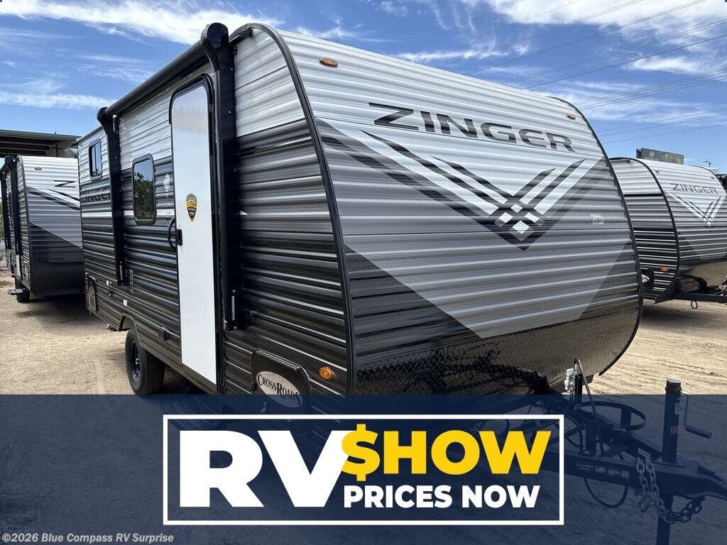 Join the CrossRoads family with a Zinger Lite travel trailer! You'll enjoy an abundance of standard features you would usually find with higher priced travel trailers. Each model features a Super Flex Alpha Roof and front diamond plate for added strength and durability. There is also an electric awning outdoors, along with pass-through storage, rear ladder prep, and a tankless on-demand water heater for added convenience. The interior features pleated shades/mini blinds/fabric window treatments, a 12V refrigerator, comfortable seating and seating spaces, plus plenty of storage for your personal belongings and camp gear!