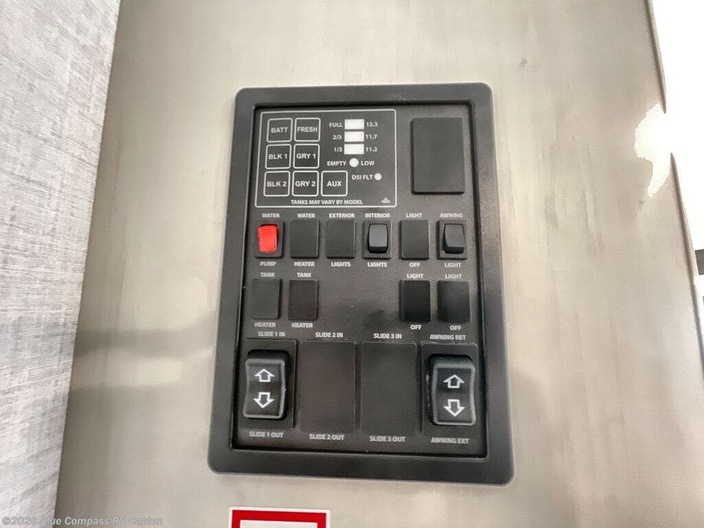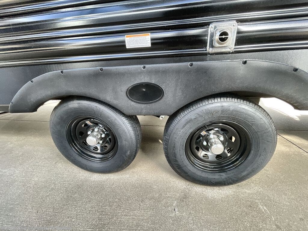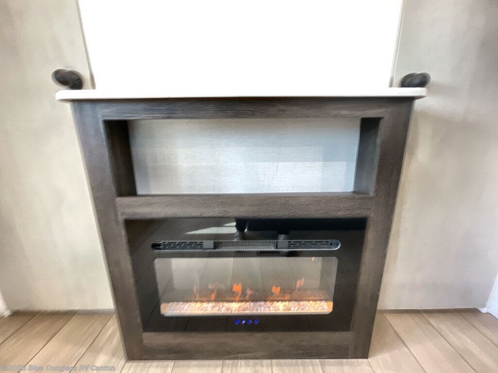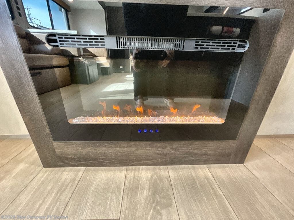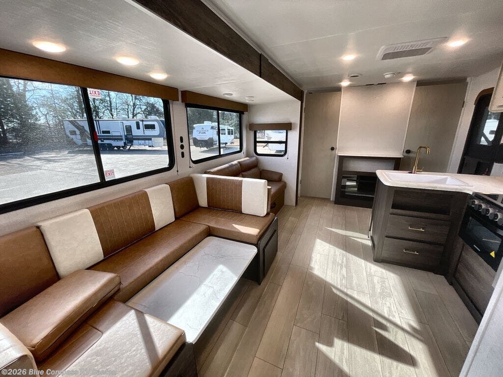 The whole gang will love camping in this spacious travel trailer for nine! There is a rear private bunkhouse with set of bunk beds plus a third bunk over the jack sofa, a mat under the sofa for even more sleeping space, and a dresser to keep this room tidy. You'll have the front private bedroom all to yourselves which includes an RV queen bed and dual shirt closets. In the morning, everyone can meet in the combined kitchen and living area that includes an 80" booth dinette and jack knife sofa within the large slide out, full kitchen amenities, and an entertainment center with a fireplace to make it feel more like home. And the full bath is another plus when camping!
