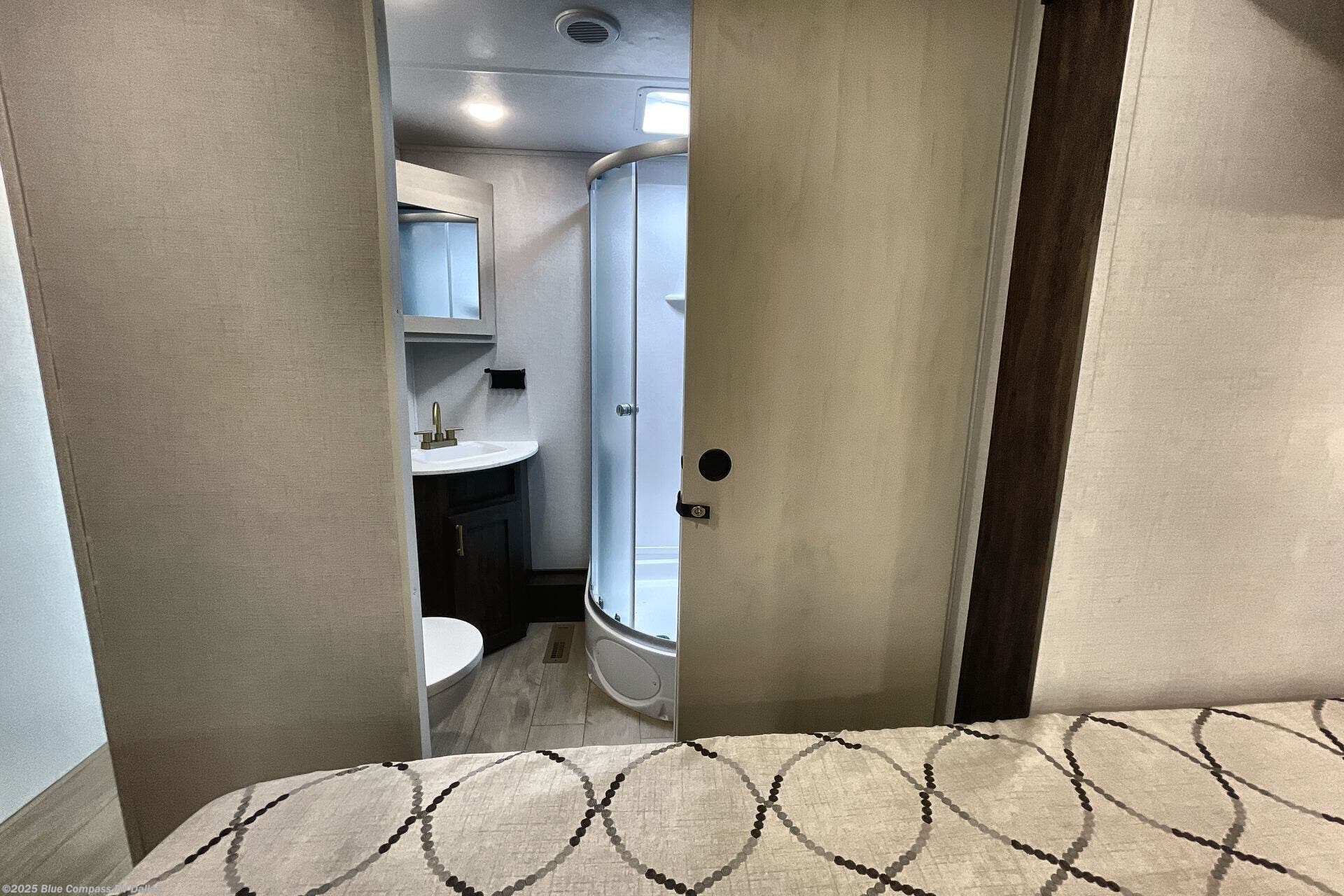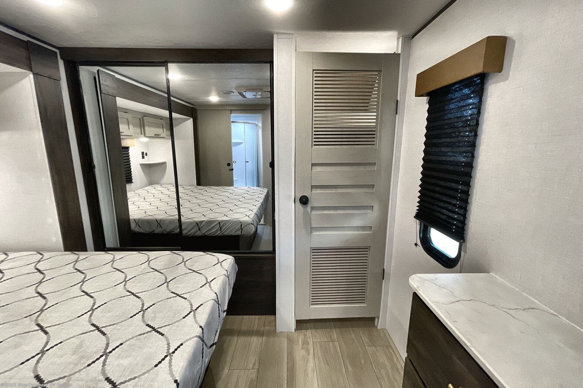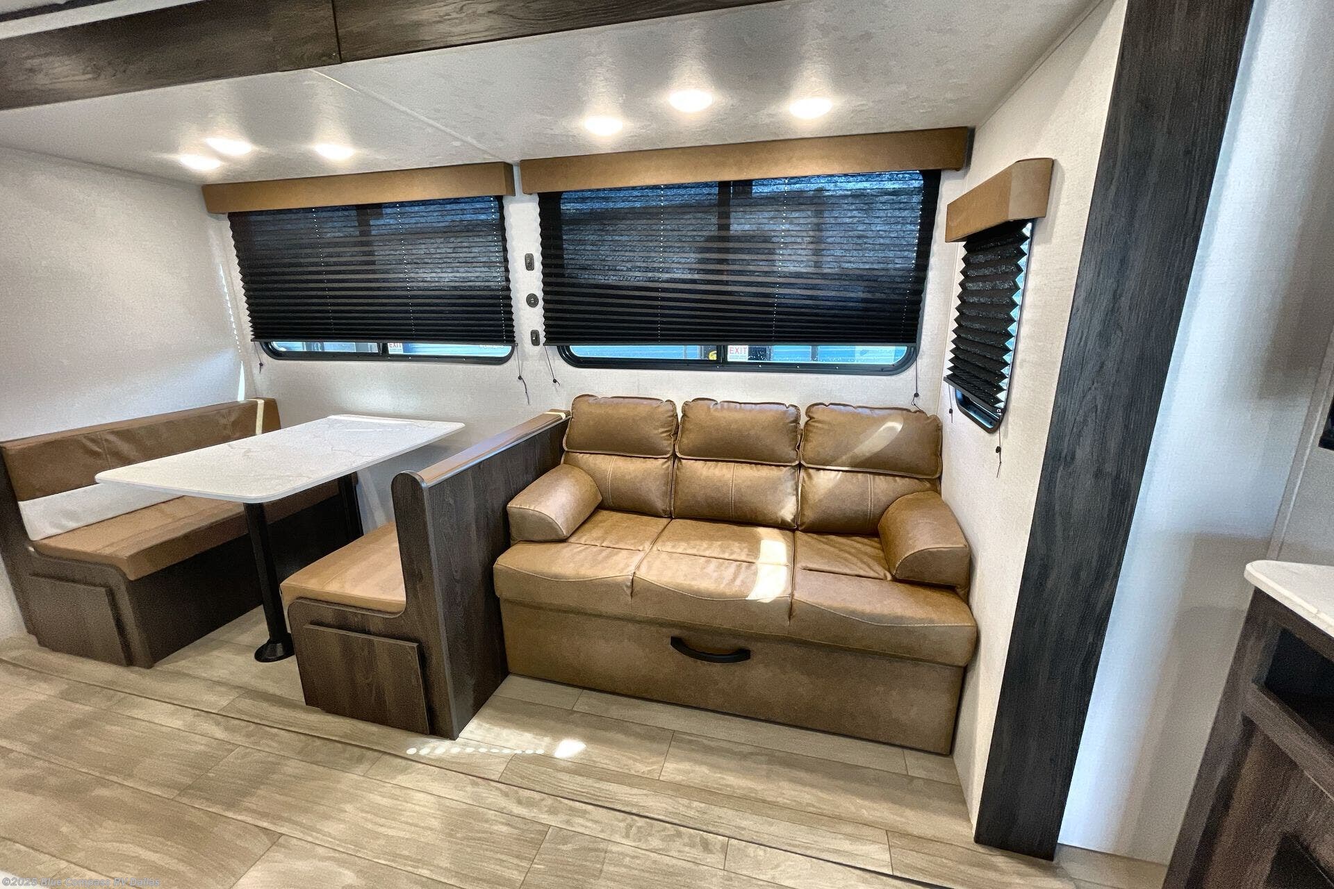 Pack your bags and invite your friends to tag along in this travel trailer! The master suite has a 60" x 74" queen bed slide across from a dresser next to a wardrobe and it's own rear full bathroom with a 30" x 36" shower. The front private bedroom has a king bed slide across from a dresser and a front wardrobe next to an area prepped to add an optional washer and dryer, plus an entrance into the dual entry bathroom which has a 34" radius shower. Both bedrooms have an entrance/exit door to the unit and the 60" x 72" patio door leads directly into the kitchen/living area. The chef can prepare delicious meals with the three burner cooktop then you can enjoy them at the 38" booth dinette next to a 60" jackknife sofa for a relaxing evening by the 50" TV at the entertainment center. You even have an outside mini fridge to enjoy a cold beverage while playing a game of cornhole!