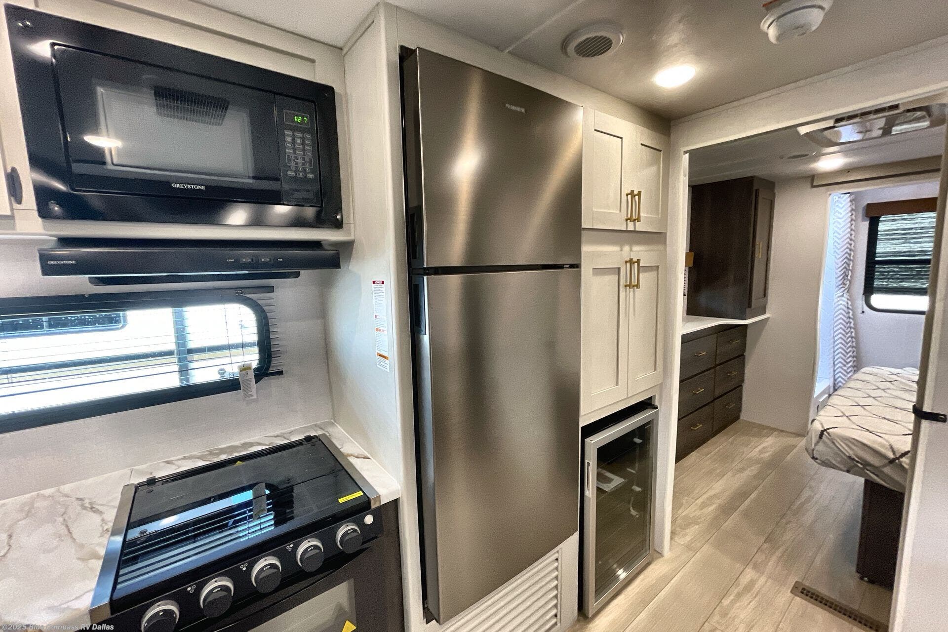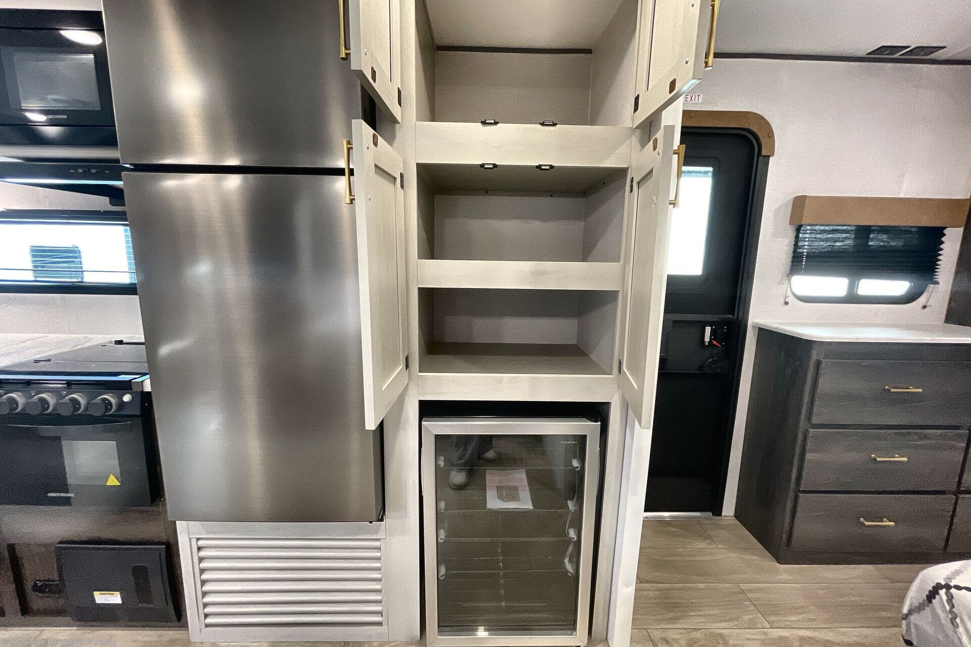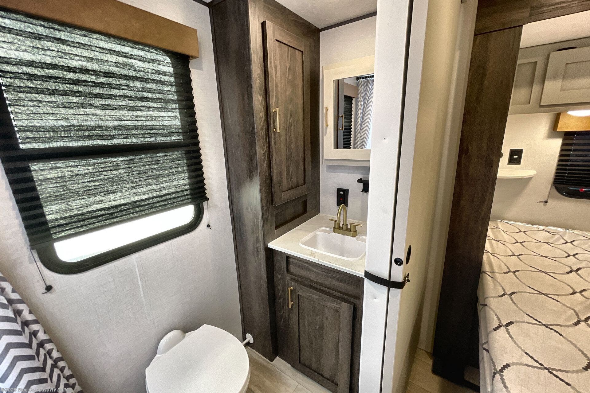 Pack your bags and invite your friends to tag along in this travel trailer! The master suite has a 60" x 74" queen bed slide across from a dresser next to a wardrobe and it's own rear full bathroom with a 30" x 36" shower. The front private bedroom has a king bed slide across from a dresser and a front wardrobe next to an area prepped to add an optional washer and dryer, plus an entrance into the dual entry bathroom which has a 34" radius shower. Both bedrooms have an entrance/exit door to the unit and the 60" x 72" patio door leads directly into the kitchen/living area. The chef can prepare delicious meals with the three burner cooktop then you can enjoy them at the 38" booth dinette next to a 60" jackknife sofa for a relaxing evening by the 50" TV at the entertainment center. You even have an outside mini fridge to enjoy a cold beverage while playing a game of cornhole!