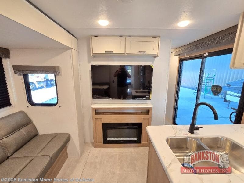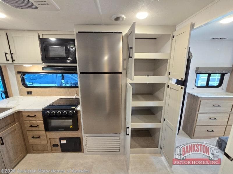 This is the perfect travel trailer if you like to camp with friends! The rear master includes a full rear bath, residential queen bed slide out, dresser, plus one of the dual entry doors. Your guests can sleep in the front master bedroom with a king bed slide out, closet and dresser, plus washer and dryer prep. The combined kitchen and living area will be a favorite hangout spot with its large slide out, tri-fold sofa, booth dinette, and spacious pantry where snacks can be kept stocked! There is even a fireplace to make it cozier!