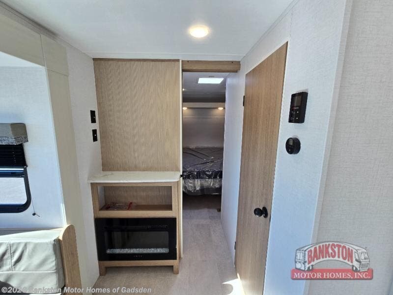 With dual entry doors, you can easily enter and exit this travel trailer! The jackknife sofa with footrest and booth dinette are next to each other near the fireplace, as well as two rear recliners allowing you to visit with other RVers or your family. The cook will have an oven and a microwave to make meals, and a 10 cu. ft. 12V refrigerator for cold items, plus a galley sink with high rise faucet to keep the dishes clean. Speaking of being clean, the full bathroom offers a shower with exhaust fan to eliminate unwanted steam as you clean yourself up after a fun day at the beach. The front private bedroom has a residential queen bed and one of the entrance/exit doors so you can slip out for an early morning fishing trip!