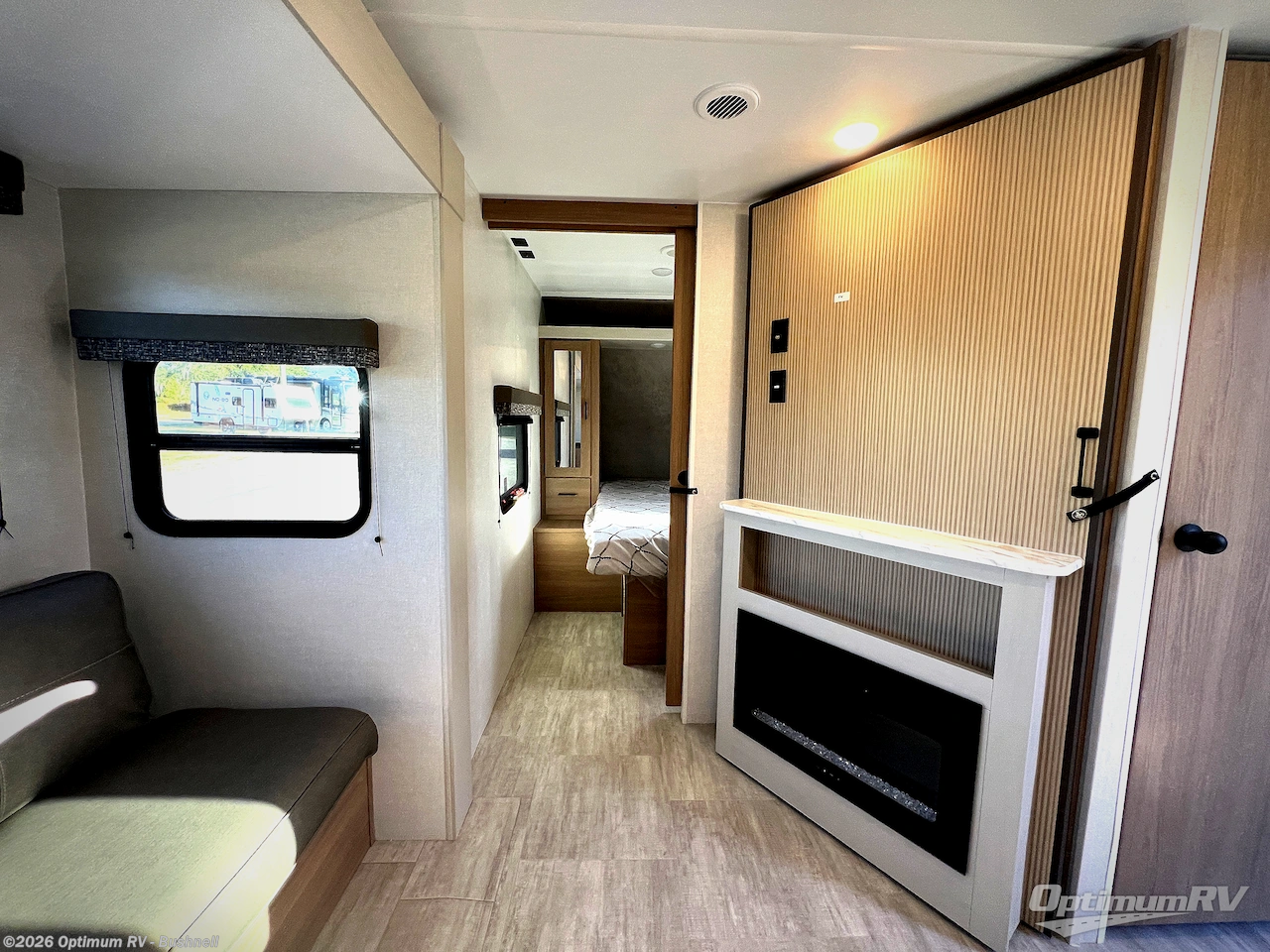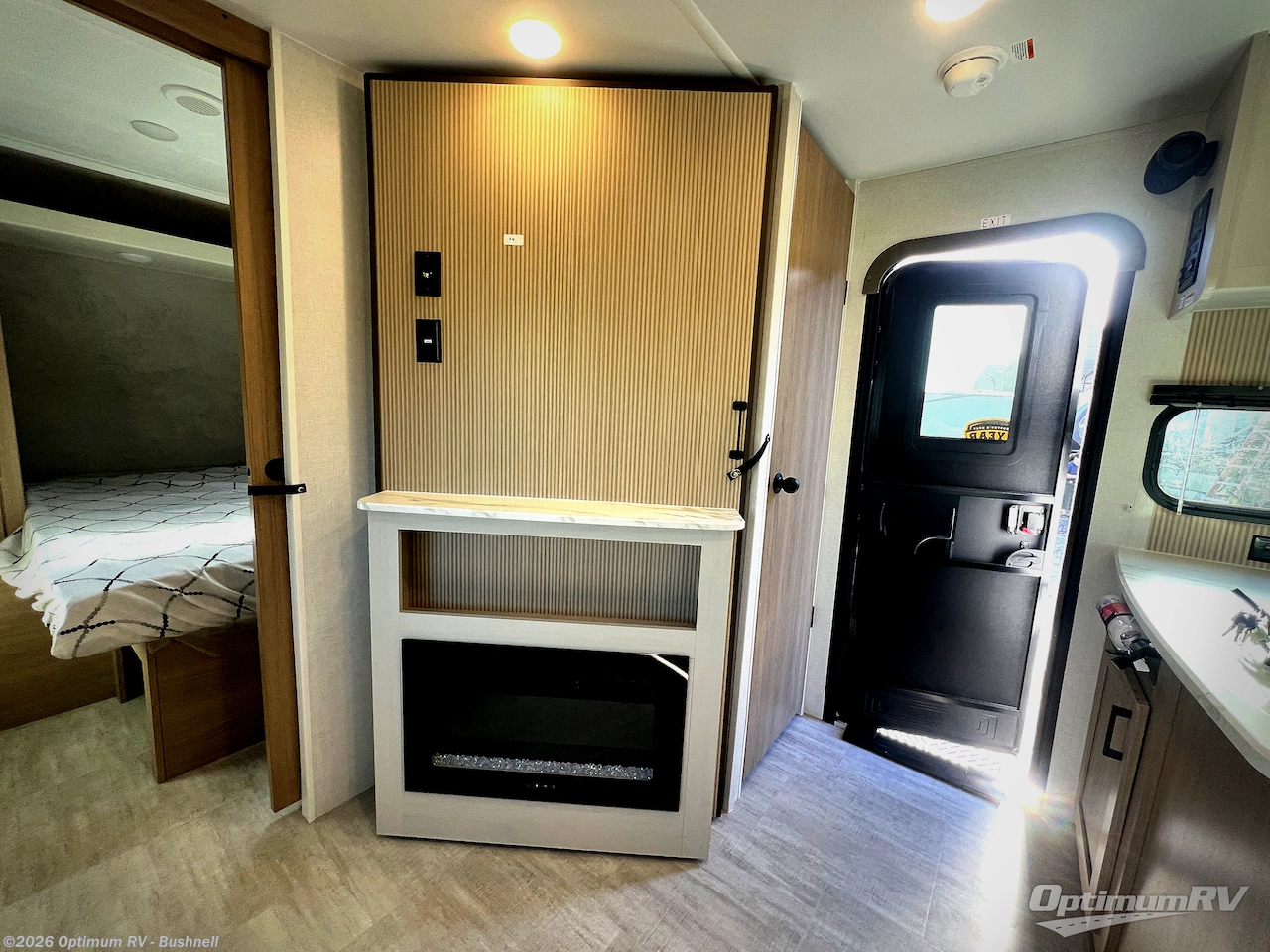 This travel trailer is one your whole crew will love! There is a rear private bunkhouse with double-size bunks for the little ones, a front private bedroom for you, and a booth dinette and jackknife sofa for even more sleeping space! The chef has their choice to cook indoors on the three burner range and microwave oven, or head outdoors to cook on the outdoor kitchen! The full bath will let everyone clean up each day, and the fireplace and large slide out will make your space feel more like home. And don't overlook the pass-through storage and 16' power awning with LED lights!