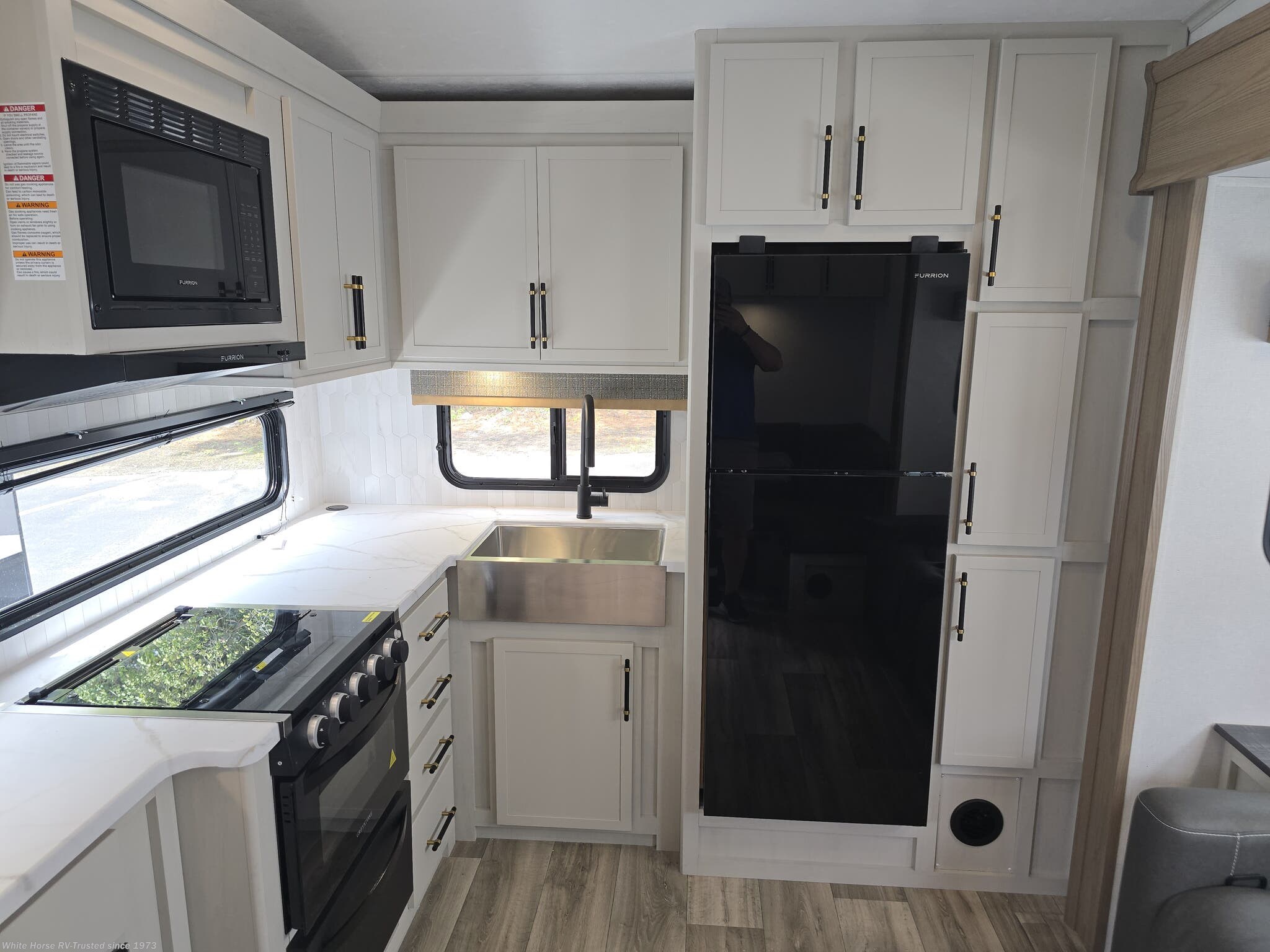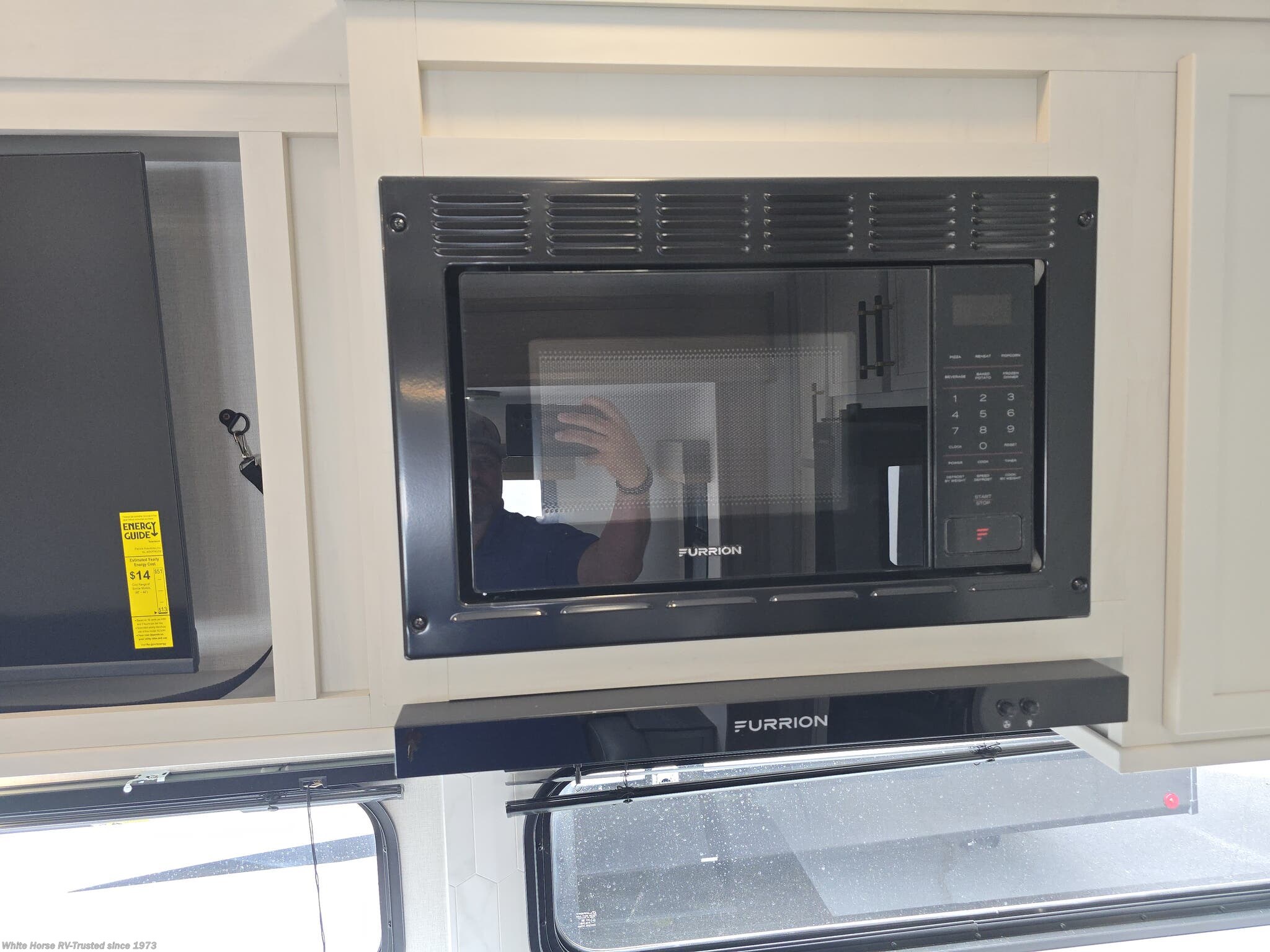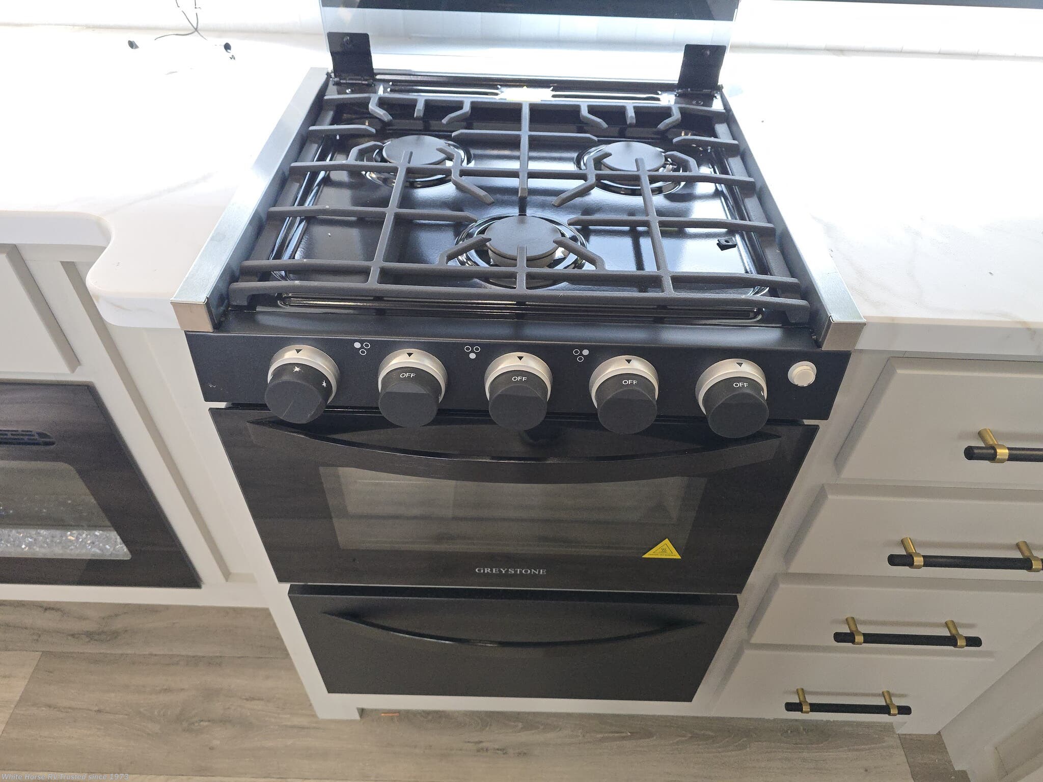 Rear Kitchen Design: Fully equipped kitchen with a 10 cu. ft. refrigerator, 3-burner range with oven, microwave, pantry, and plenty of counter space for meal prep.