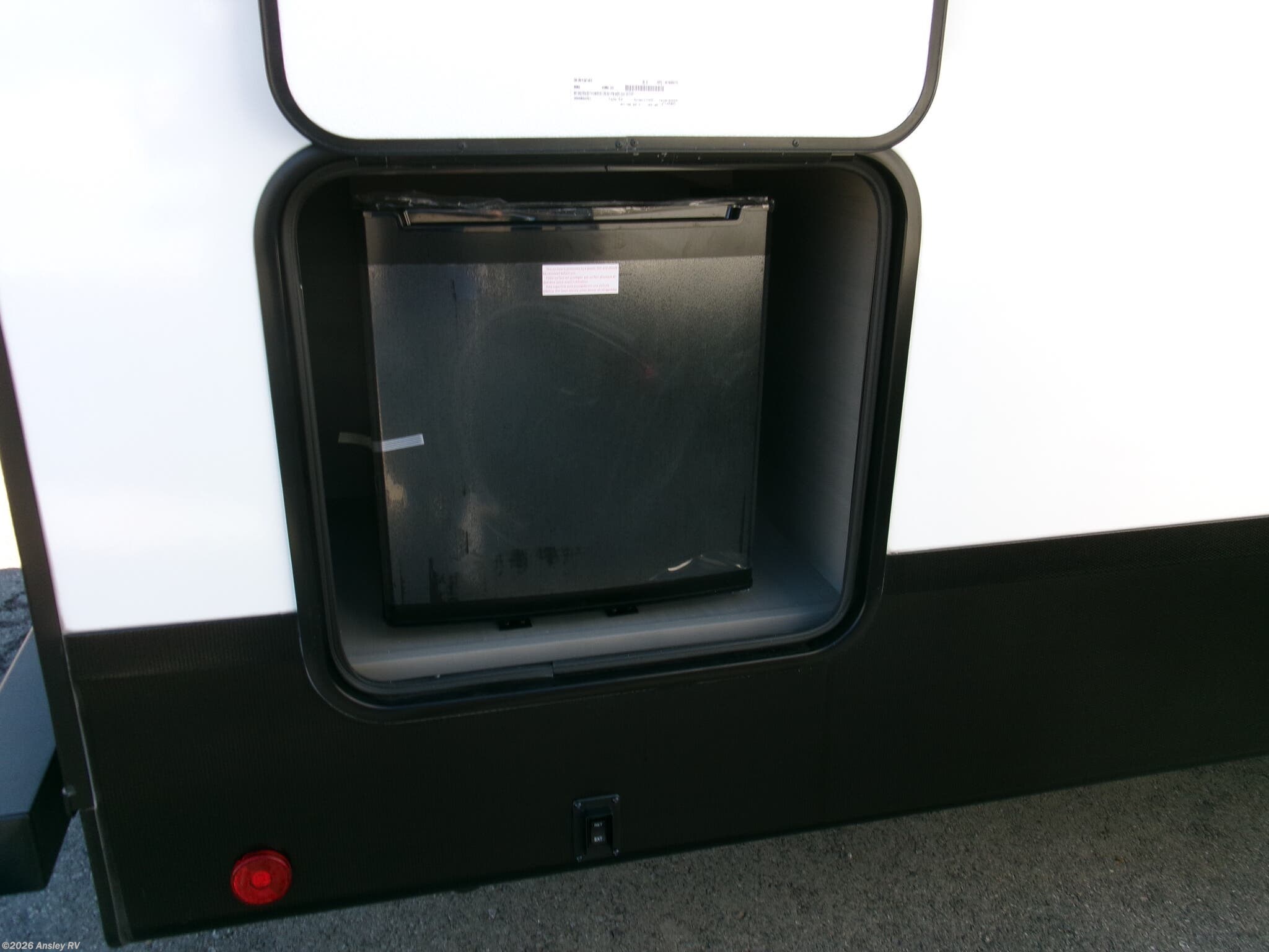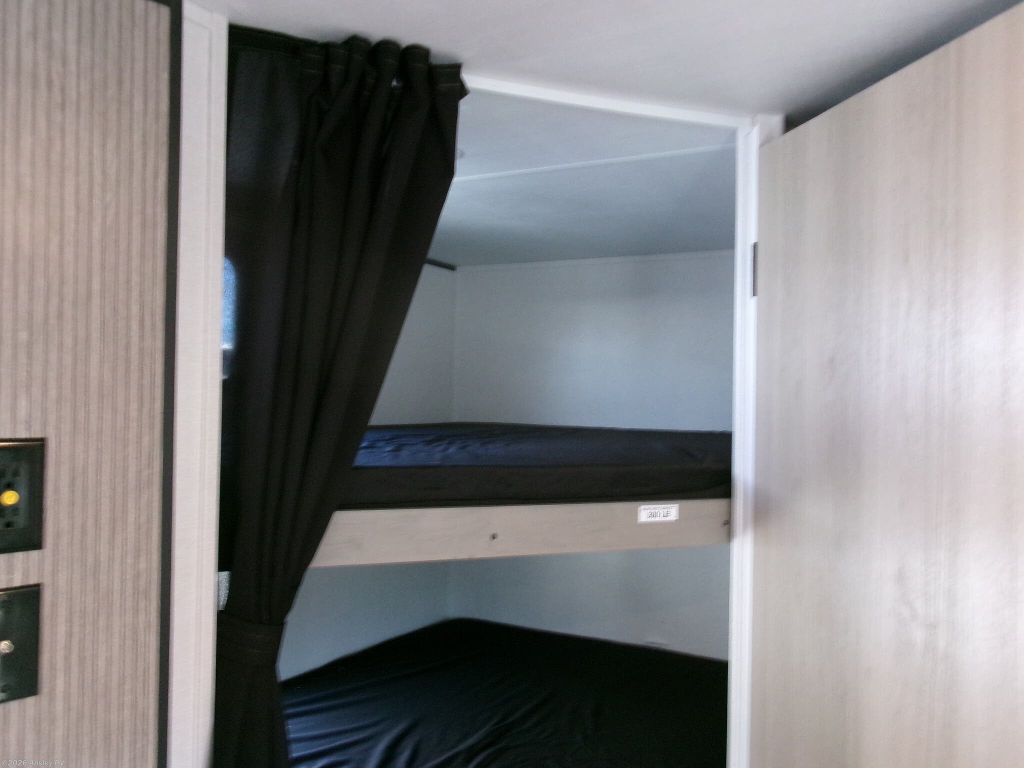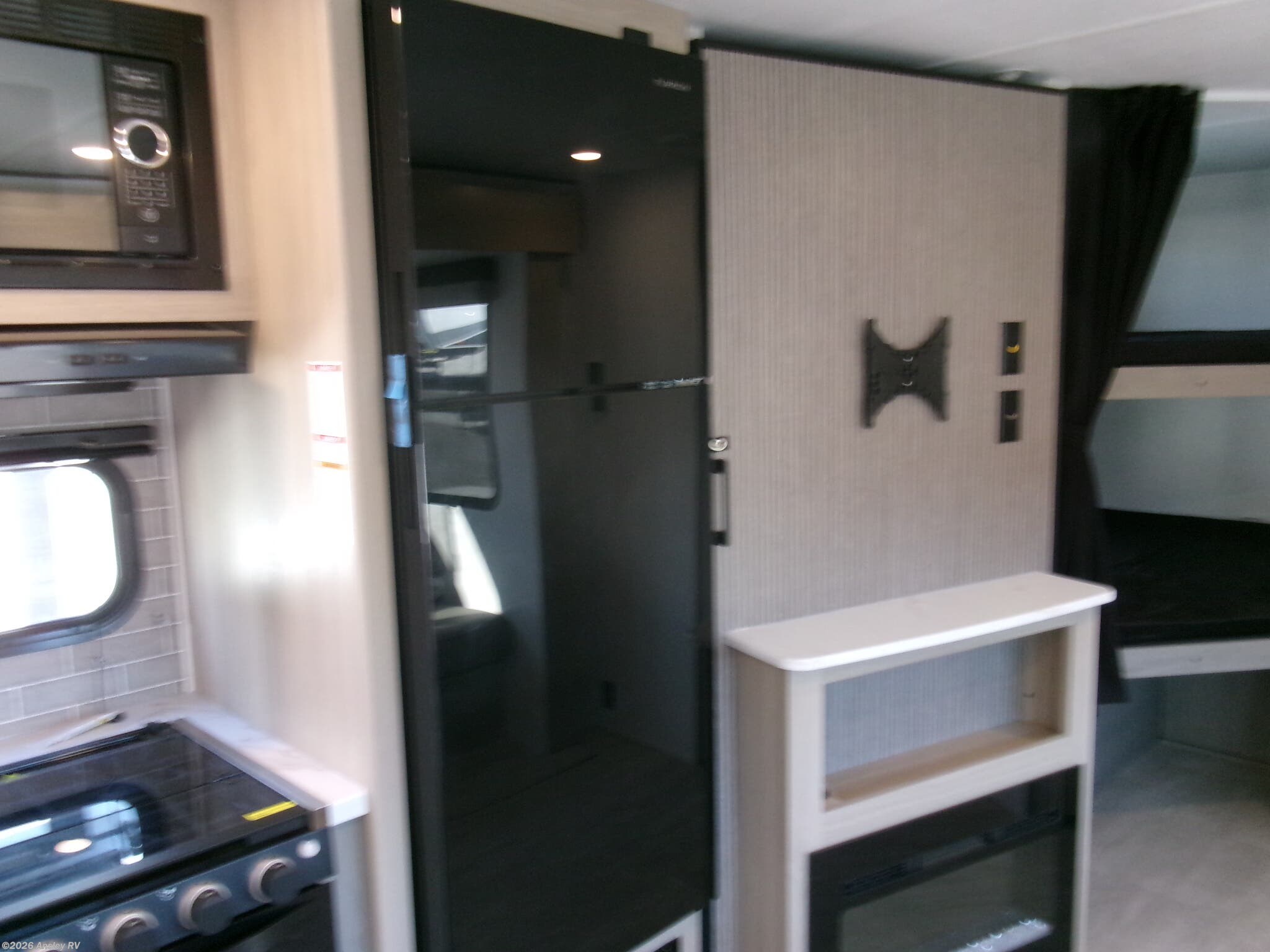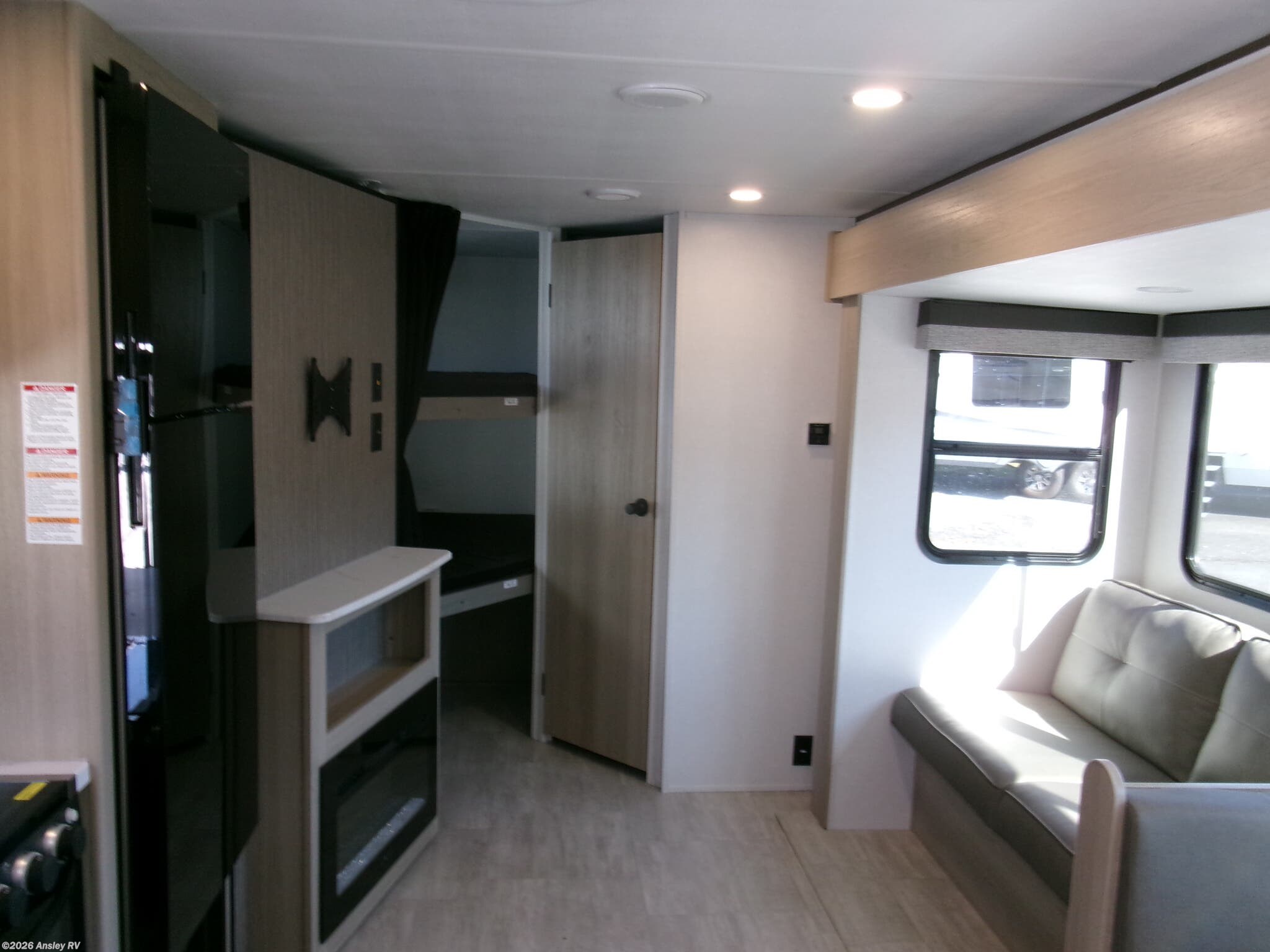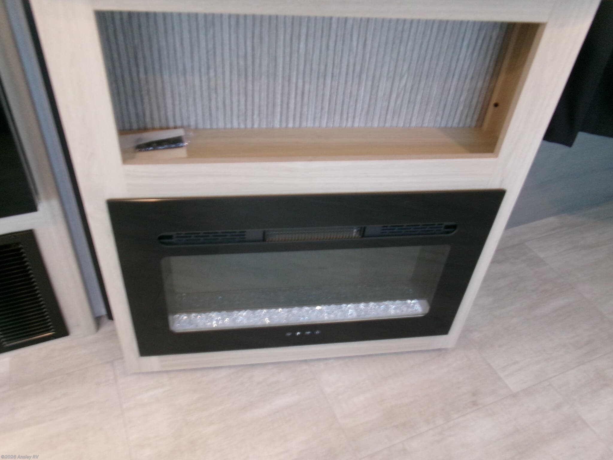 Your whole family will have a good time in this travel trailer! You can easily set up the 14' awning with LED lights, grab your camp chairs from the pass-through storage, and start making meals using the inside kitchen amenities like a refrigerator and three burner range. After mealtime, you can play games at the booth dinette before getting cleaned up in the full corner bathroom. The kids or guests can have their own double-size bunk beds, and you will love having a front residential queen bed at night. There is even a hinged entertainment center with a fireplace and a hidden pantry behind it to conveniently grab a snack and set up a movie!