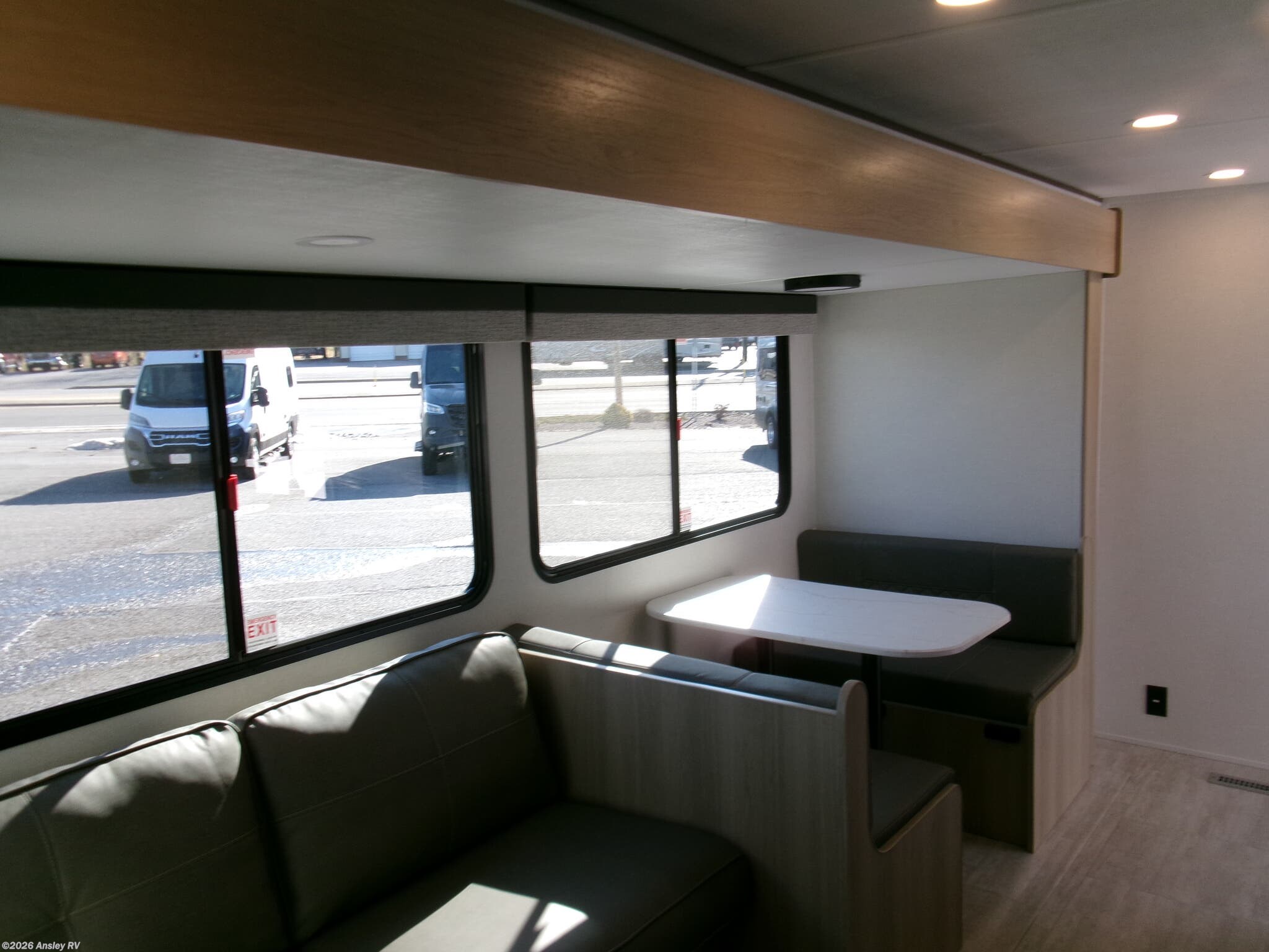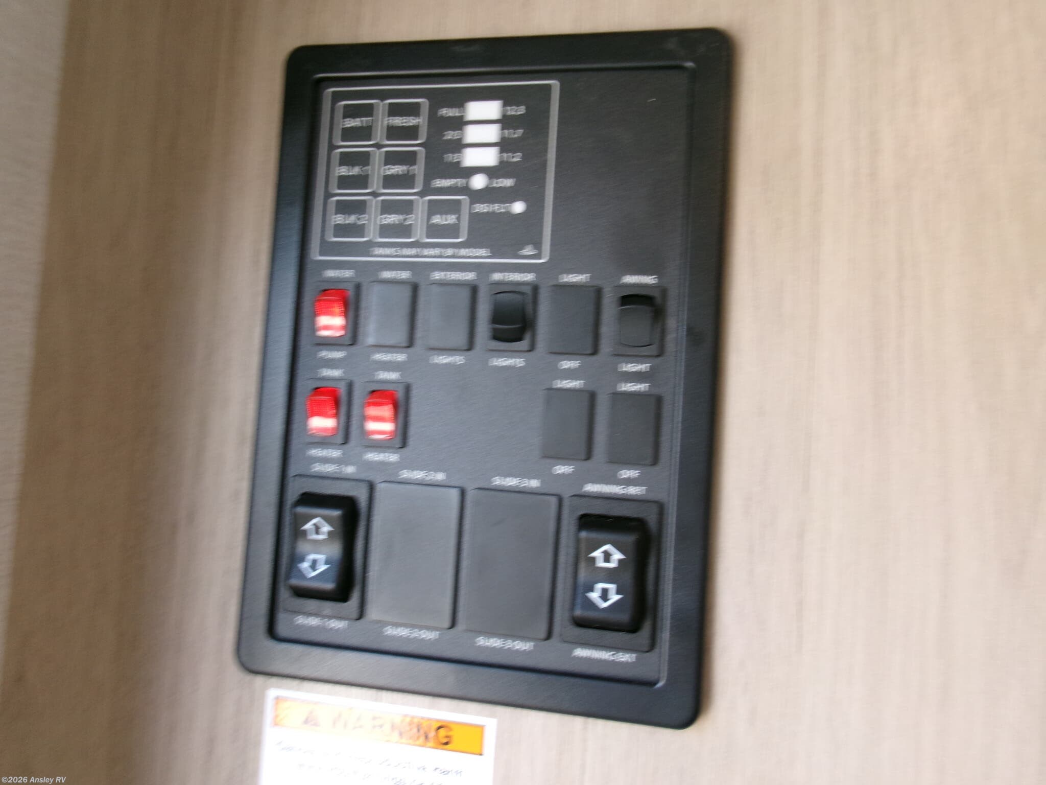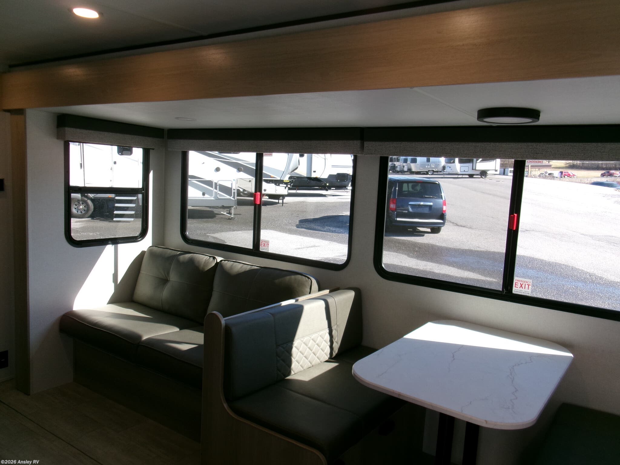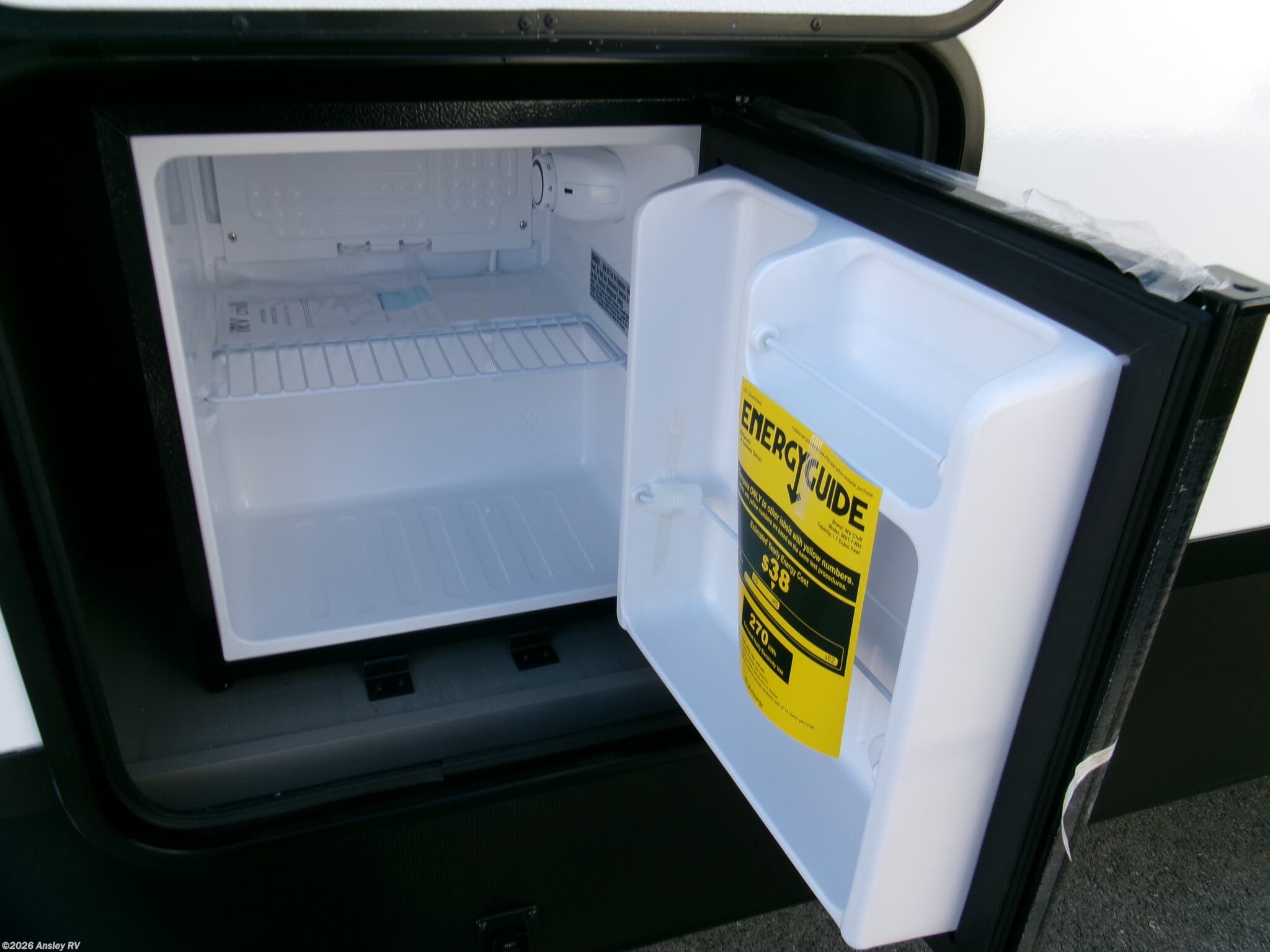 Your whole family will have a good time in this travel trailer! You can easily set up the 14' awning with LED lights, grab your camp chairs from the pass-through storage, and start making meals using the inside kitchen amenities like a refrigerator and three burner range. After mealtime, you can play games at the booth dinette before getting cleaned up in the full corner bathroom. The kids or guests can have their own double-size bunk beds, and you will love having a front residential queen bed at night. There is even a hinged entertainment center with a fireplace and a hidden pantry behind it to conveniently grab a snack and set up a movie!