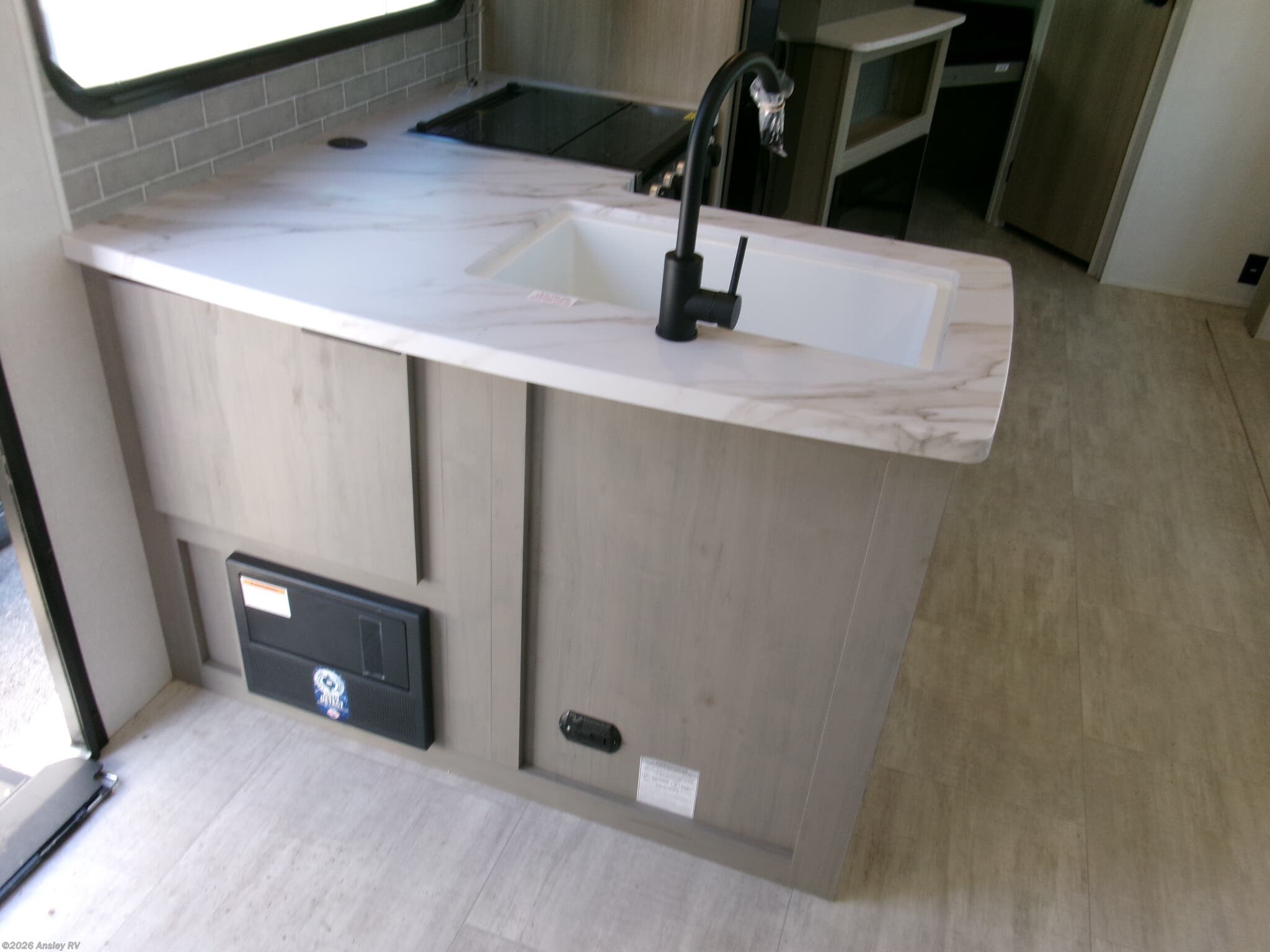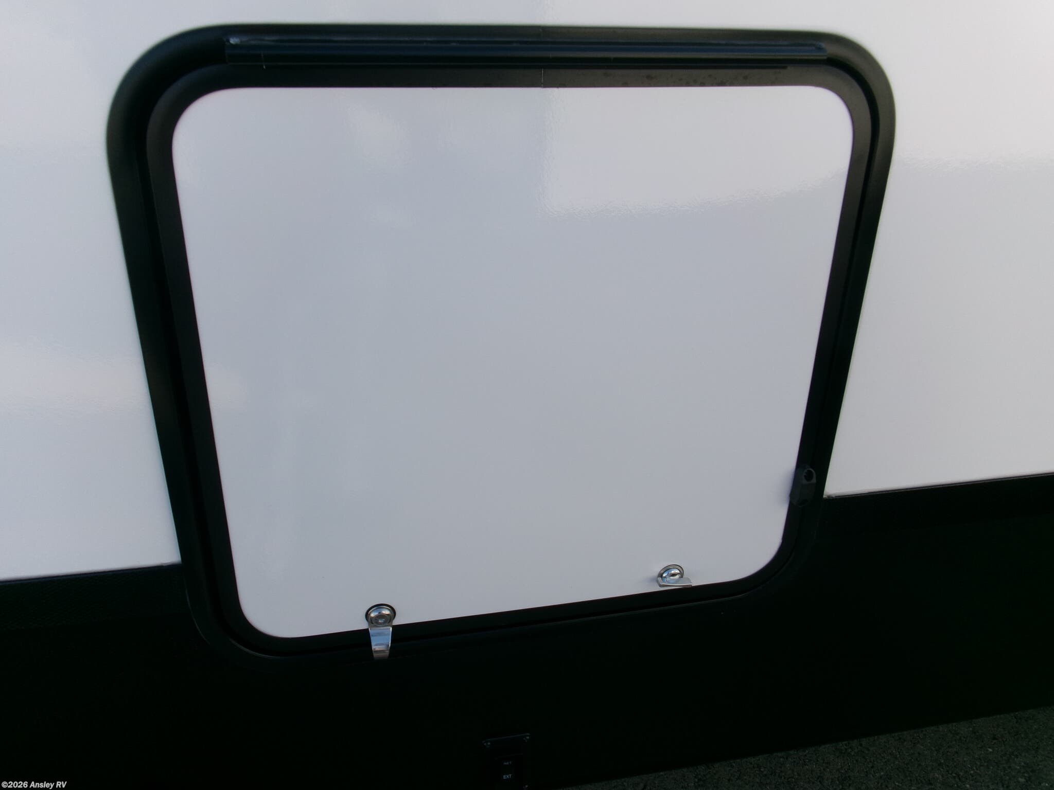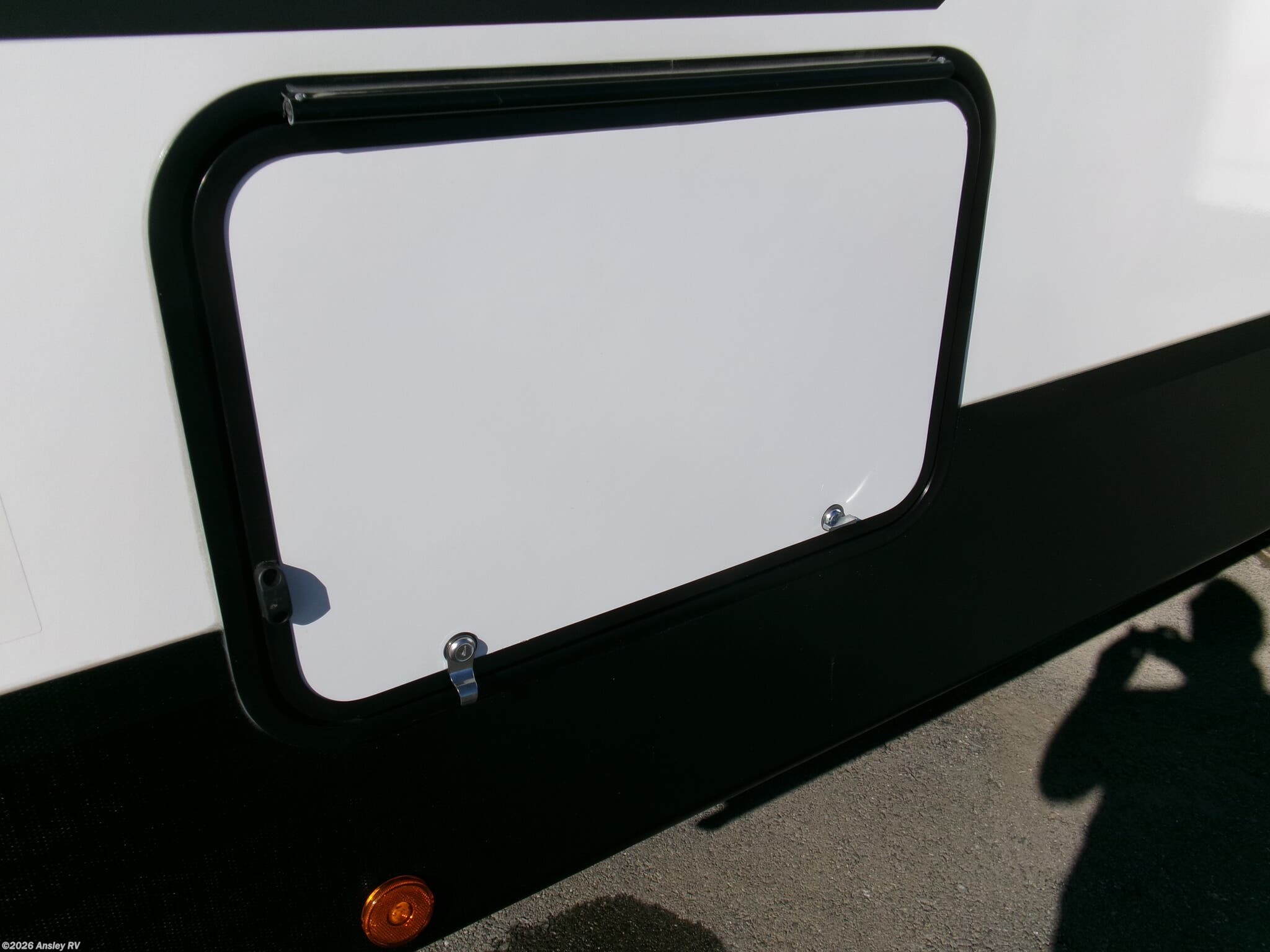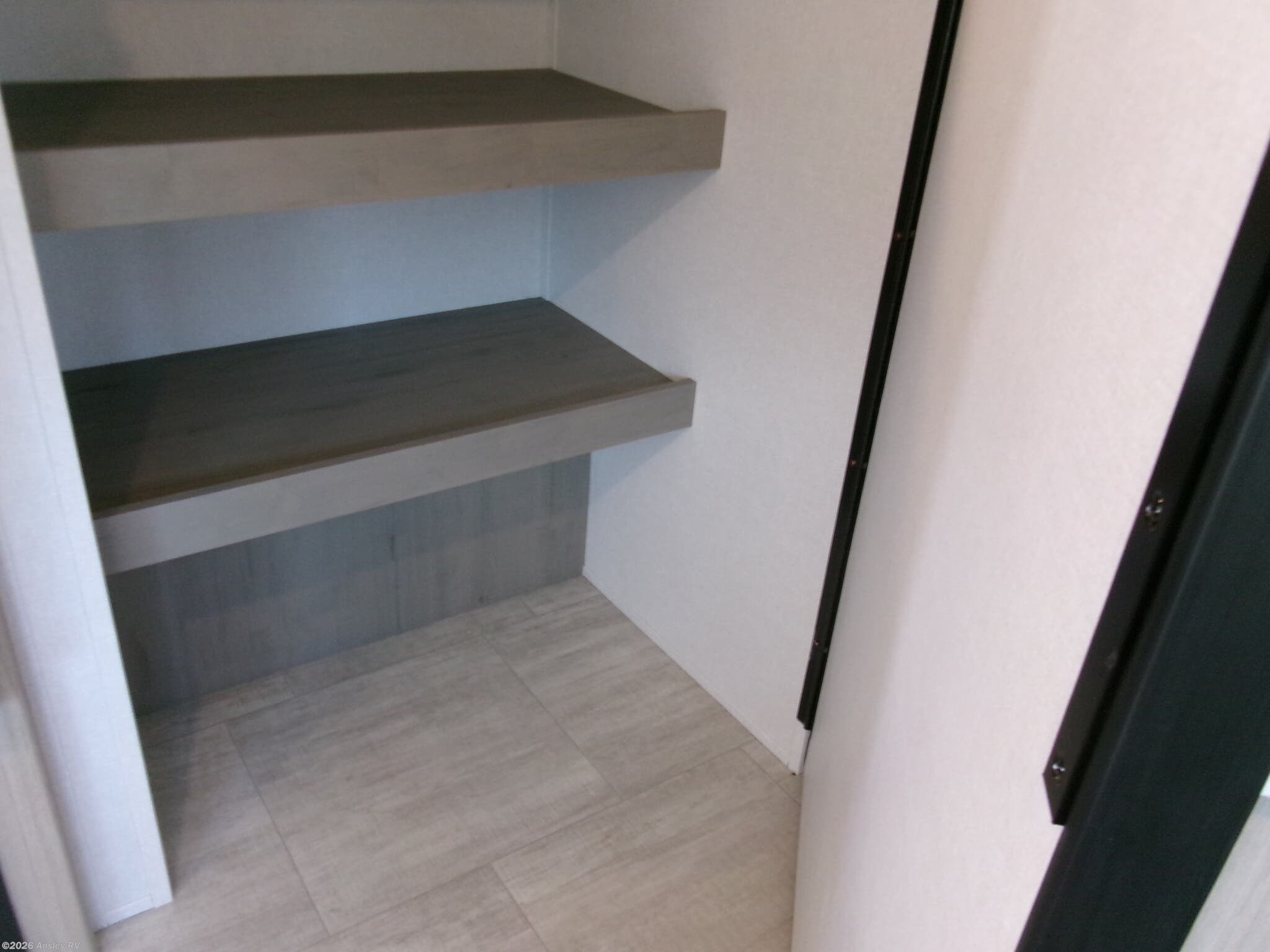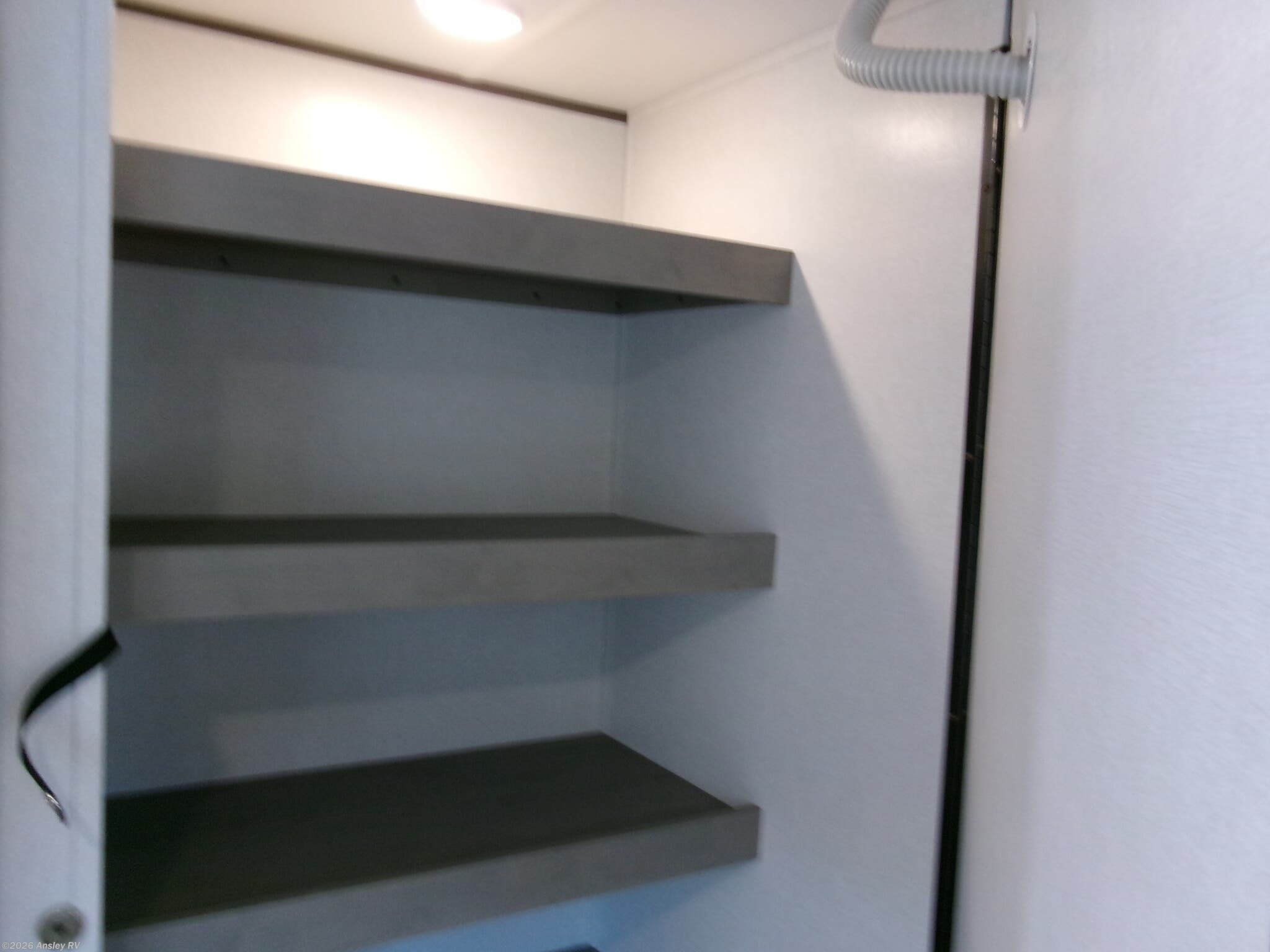 Your whole family will have a good time in this travel trailer! You can easily set up the 14' awning with LED lights, grab your camp chairs from the pass-through storage, and start making meals using the inside kitchen amenities like a refrigerator and three burner range. After mealtime, you can play games at the booth dinette before getting cleaned up in the full corner bathroom. The kids or guests can have their own double-size bunk beds, and you will love having a front residential queen bed at night. There is even a hinged entertainment center with a fireplace and a hidden pantry behind it to conveniently grab a snack and set up a movie!