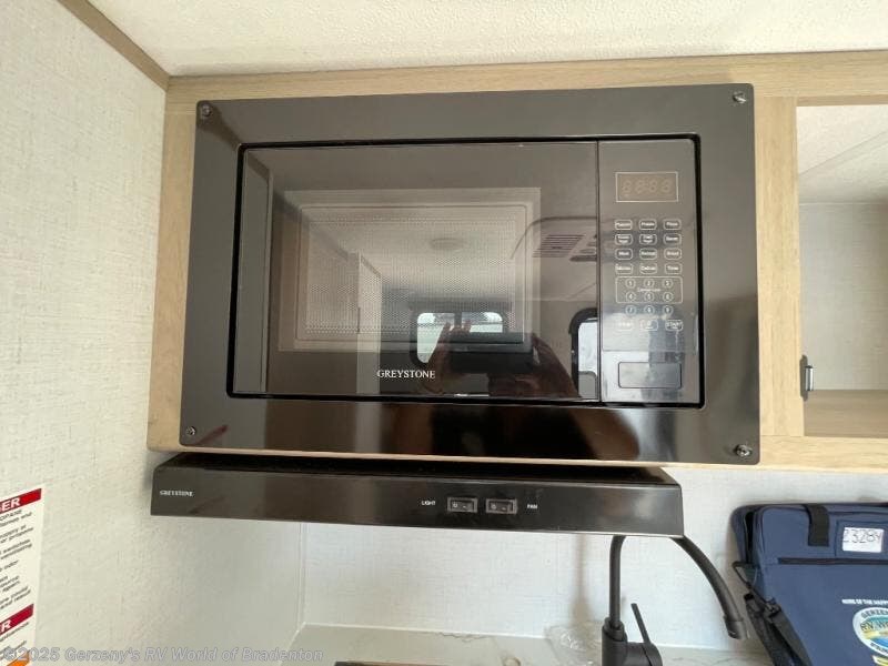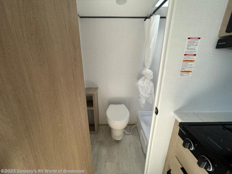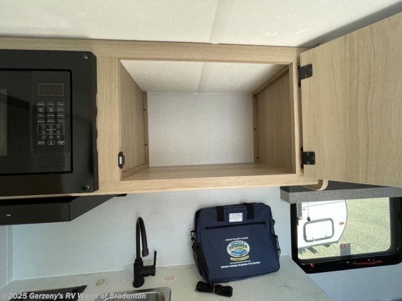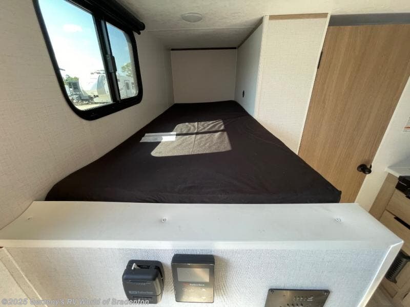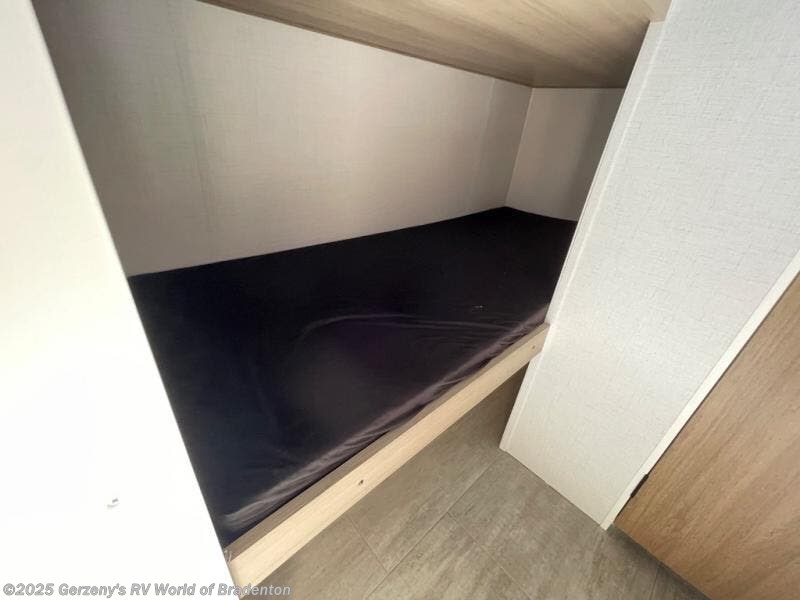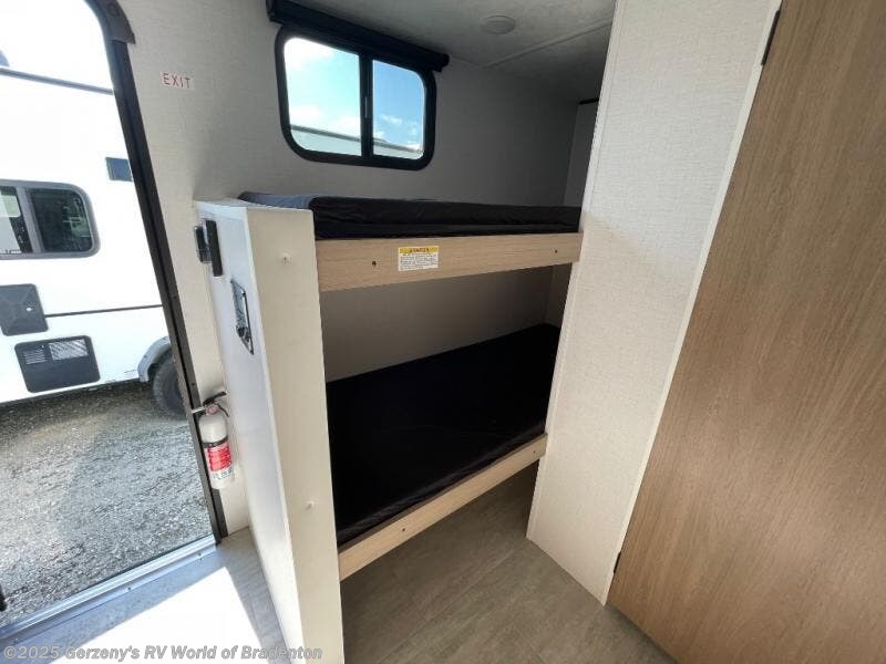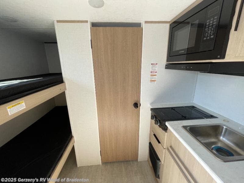 This family-friendly travel trailer is ideal for you! This model offers accommodations for all family members, starting with bunk beds for the kids (or kids at heart!), a queen bed for a comfortable night's sleep, and a private bathroom for personal convenience. Preparing meals has never been easier thanks to the two-burner cooktop, microwave for quick snacks, and a 3.3 cu. ft. refrigerator for keeping food and drinks fresh. You will be able to keep the RV organized due to an overhead cabinet for storing essentials, a closet for hanging clothes and gear, plus a pass-through storage for extra luggage or equipment.